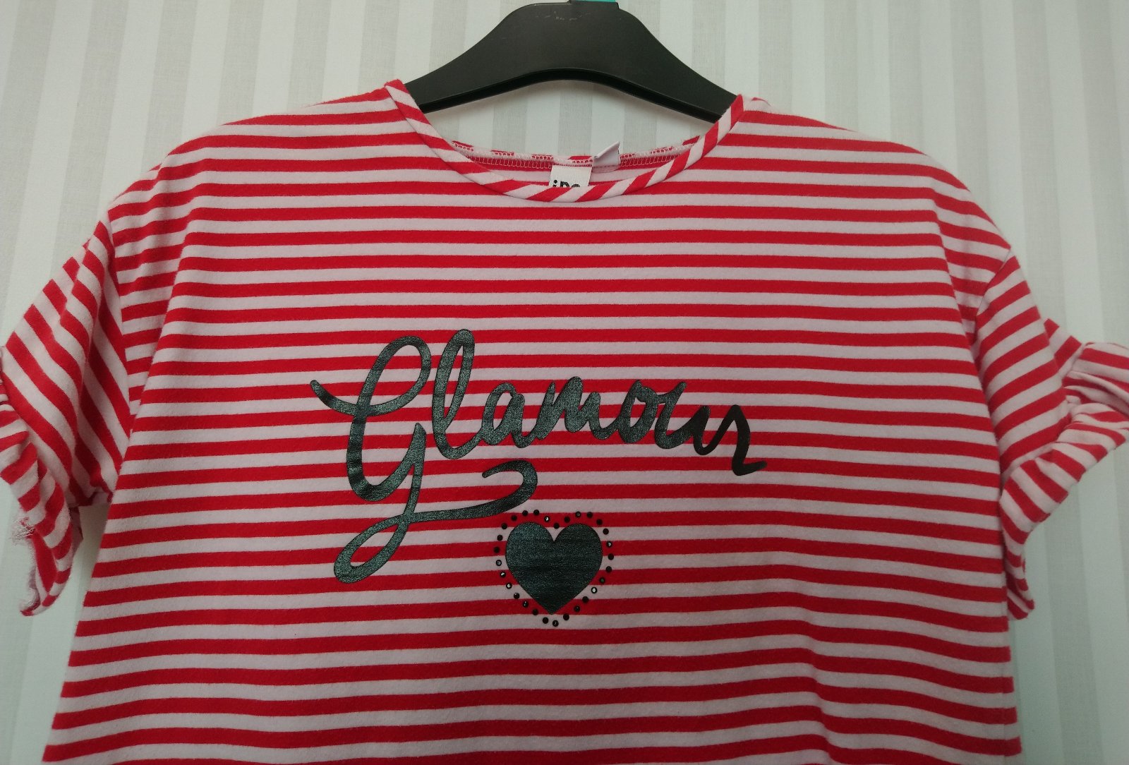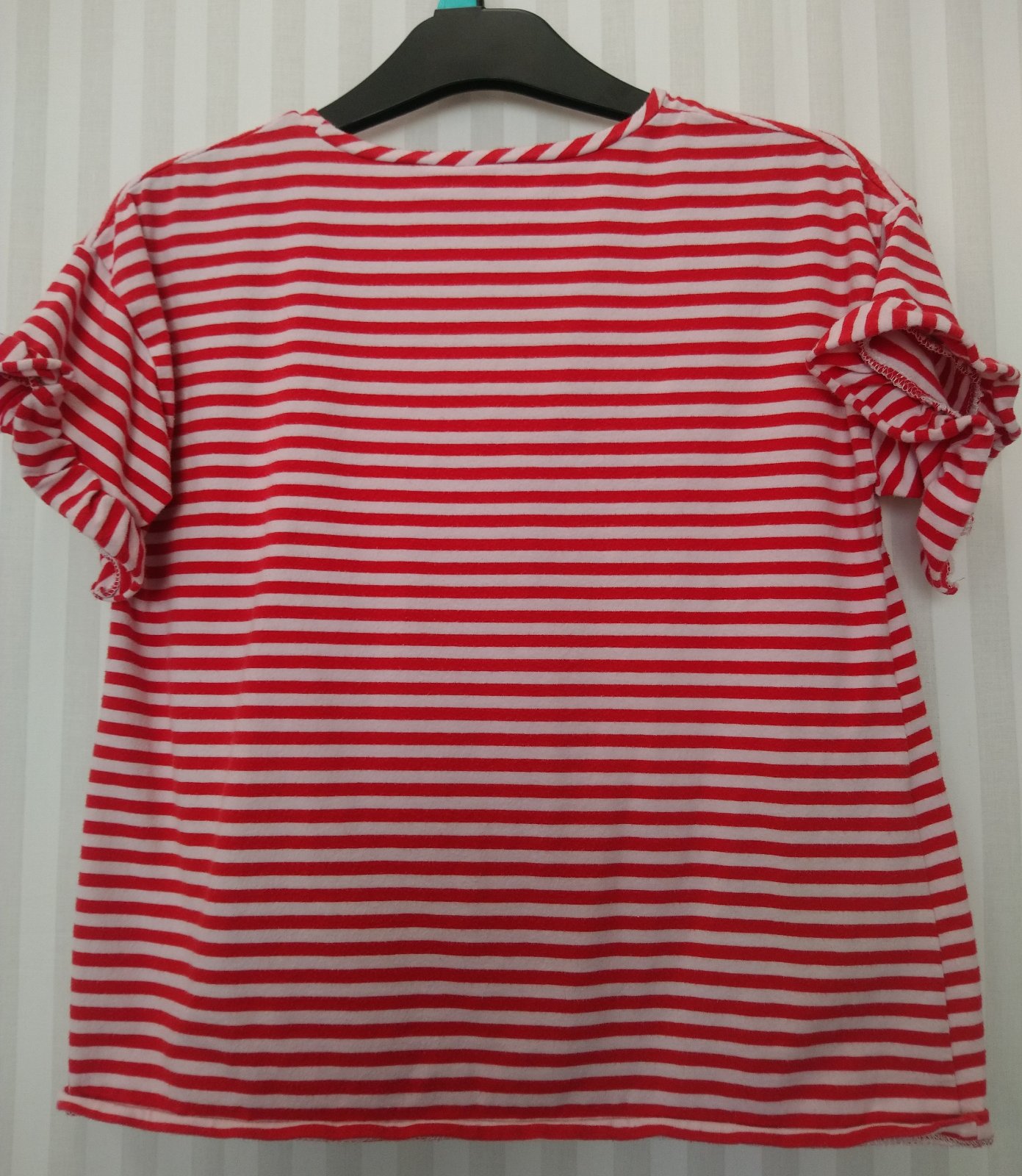 dievčenské pásikavé červeno biele biele tričko s motívom, rukávy zakončené volánikom, mierne rozšírený strih,