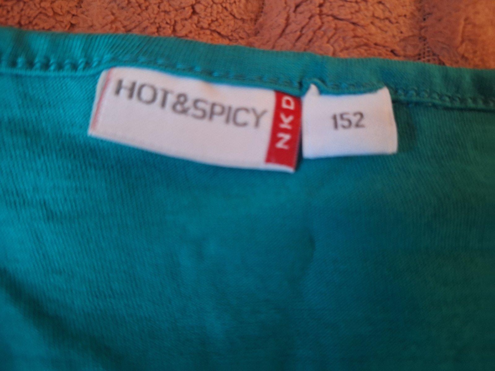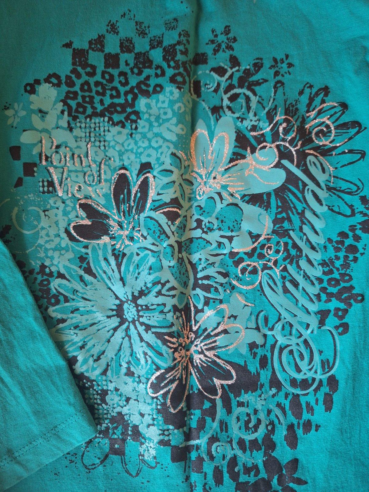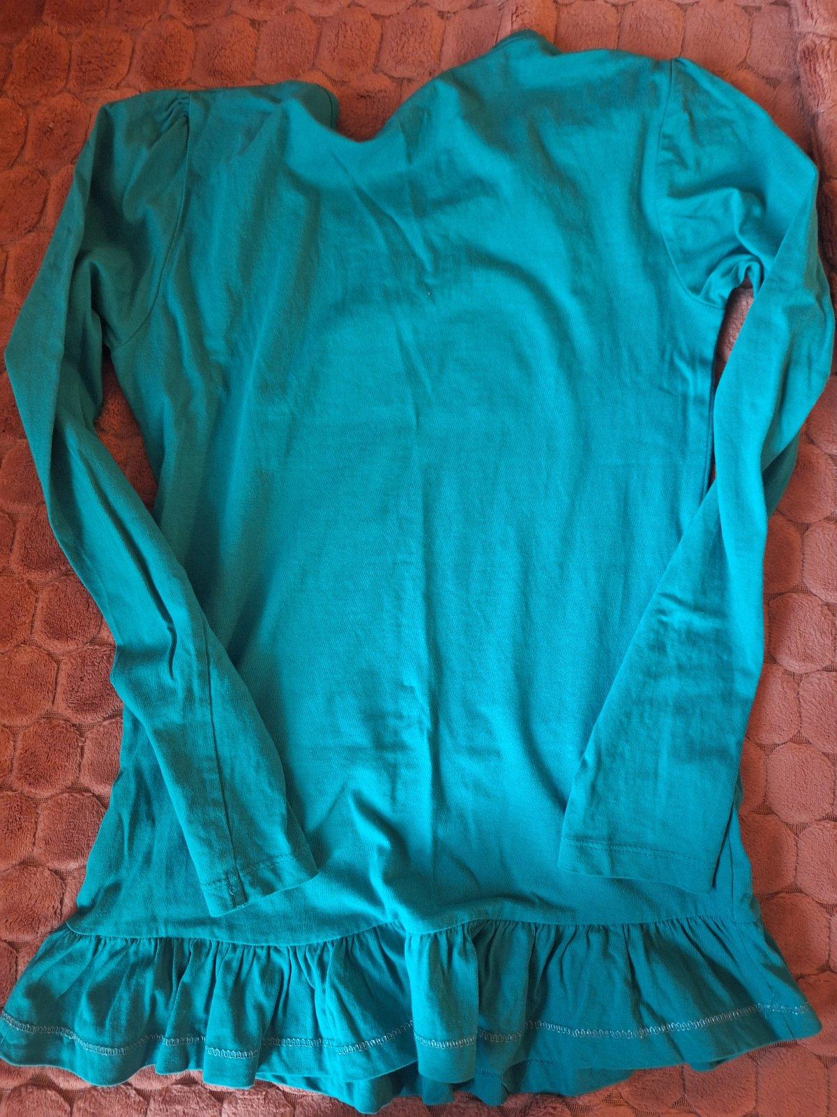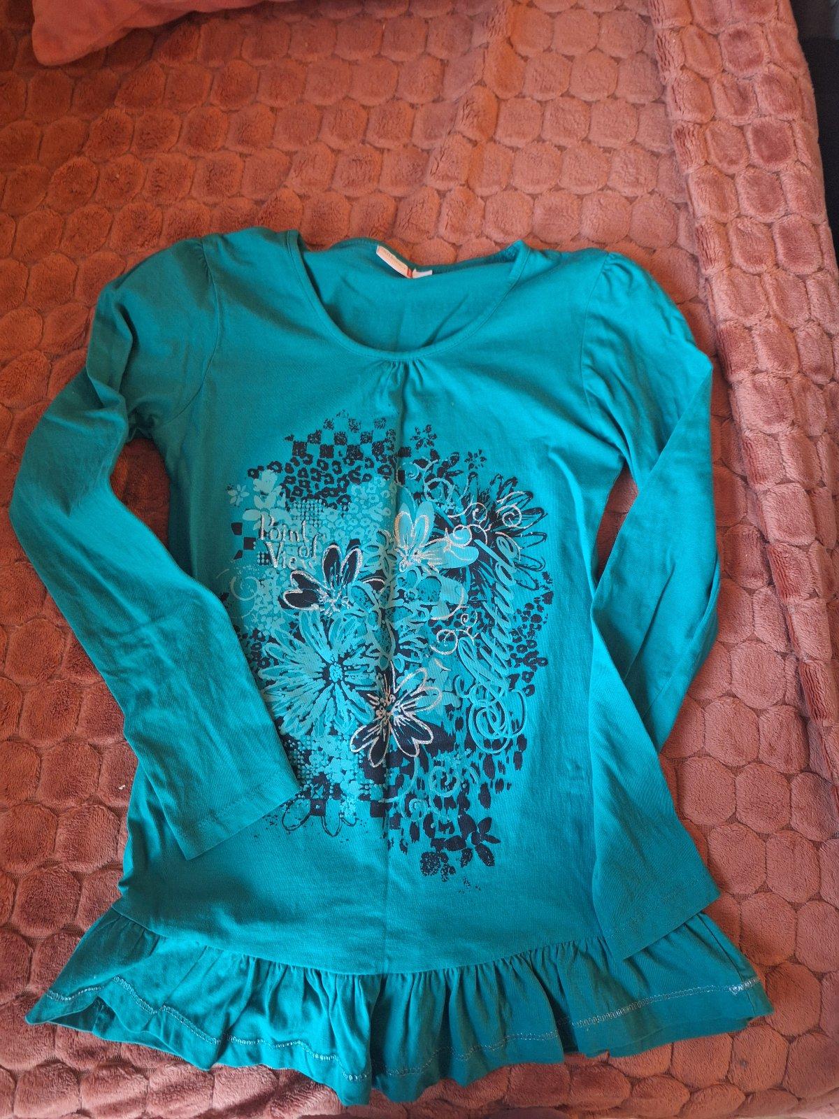 Predám dievčenské tričko s dl.rukávom, farba je tmavo zekená, tričko je trošku predĺžené s volánikom dole, potlač je trošku so striebornou farbou a aj na spodnom okraji je strieborná niť. veľ. je písaná 152, cena 5,- s poštovným