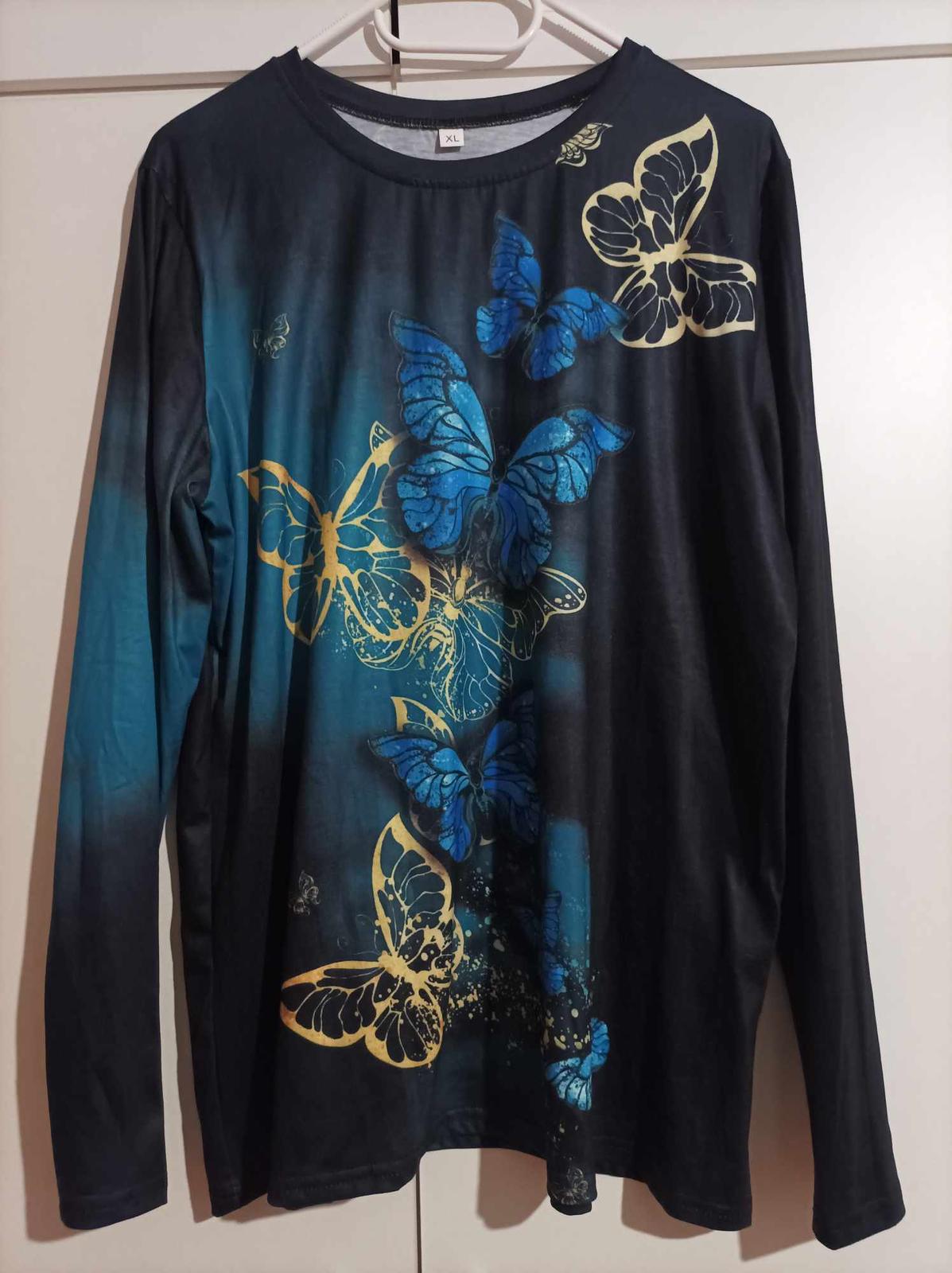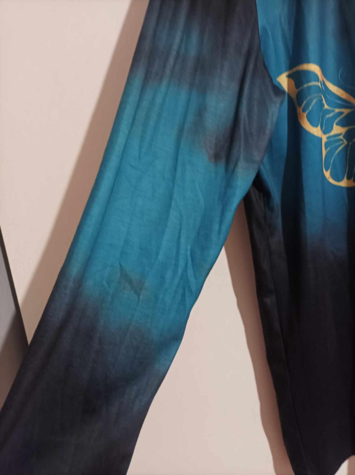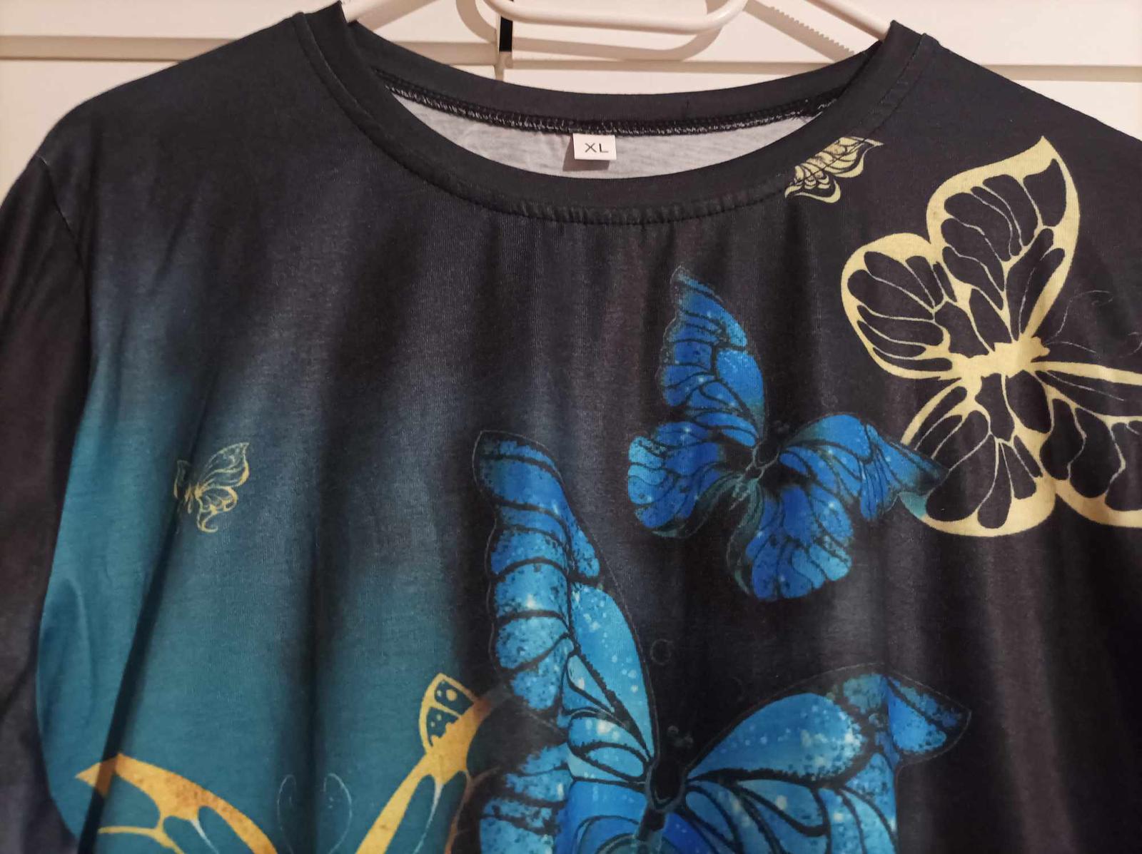 Pekné zachovalé tričko, nosené, s motýľmi na obidvoch stranách. Jeden rukáv čierny, druhý prechádza s čiernej do modrej a znova do čiernej.
