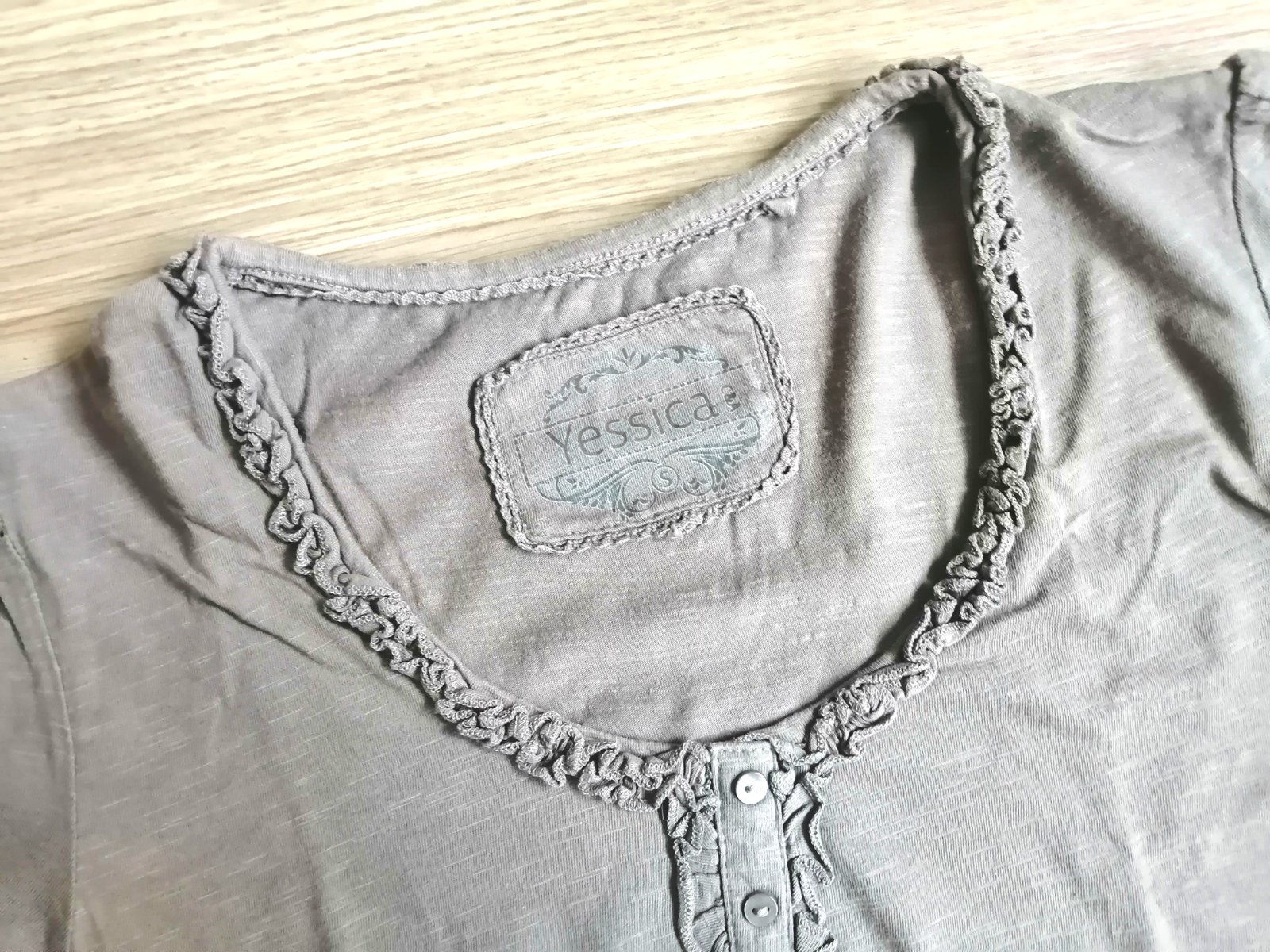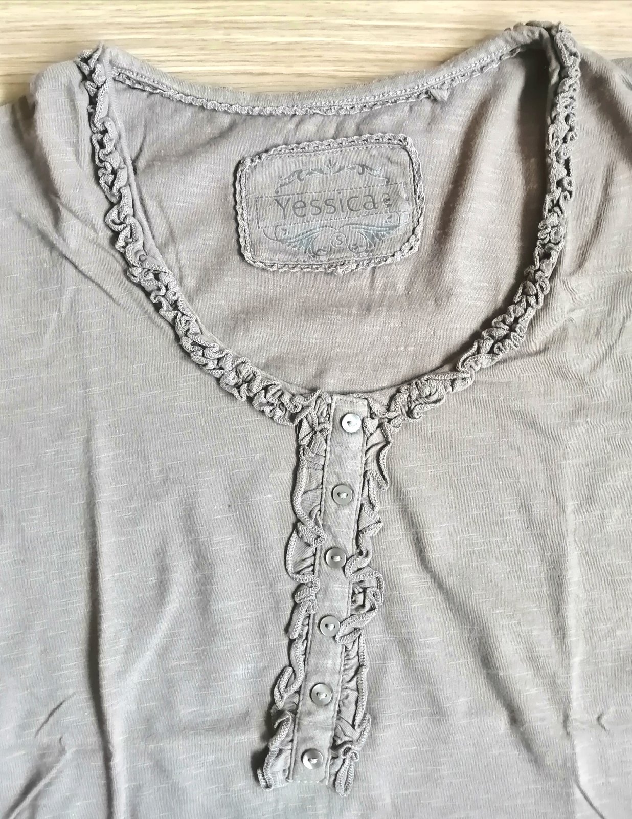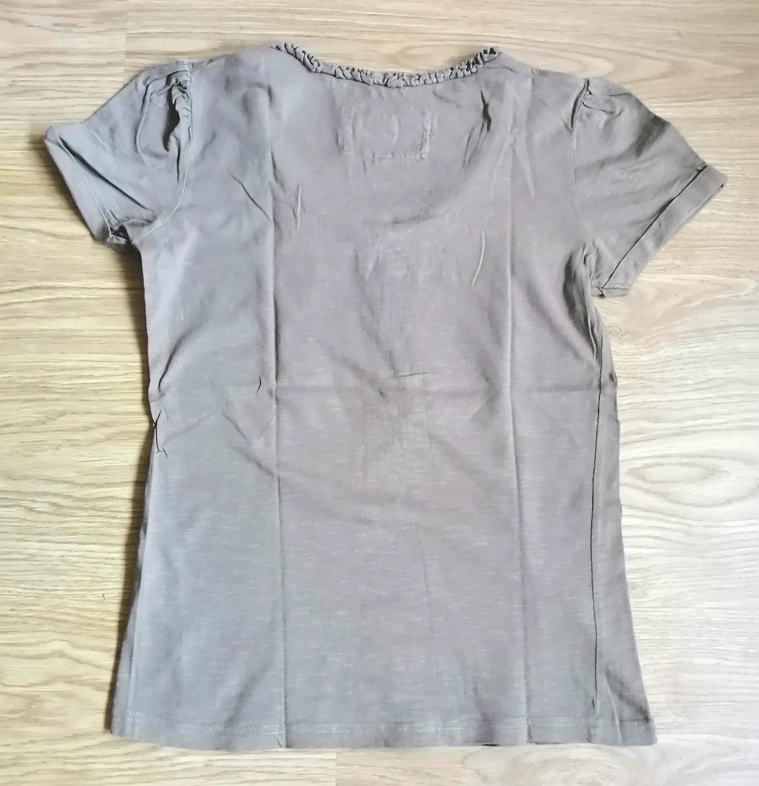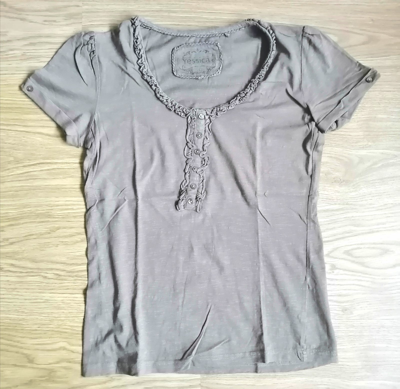 Kvalitné bavlnené dámske /dievčenské tričko s krátkym rukávom, okrúhly výstrih s volanikovým zdobením, veľ. S, príjemná svetlohnedá farba.