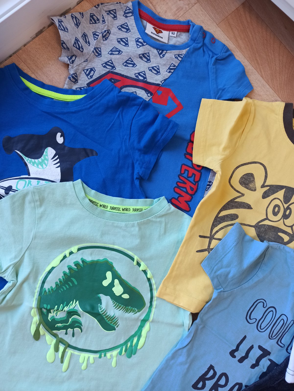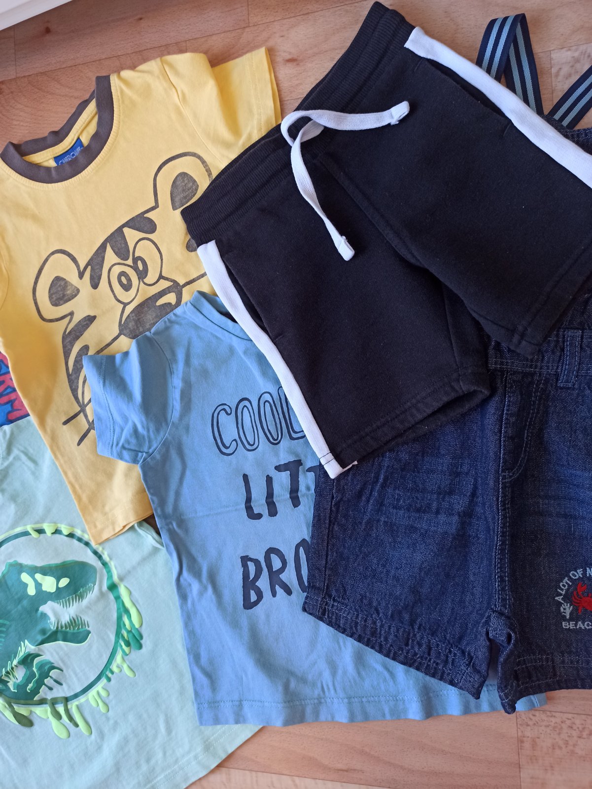 Kraťasy na traky lupilu a tmavomodré tričko boli len opraté a nenosené. Tričko s nápisom a dinosaurom 2-3 krát oblečené, ostatné pekný nosený stav