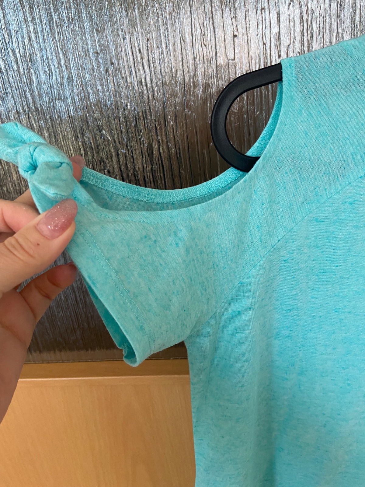 Predám málo nosený dámsky predĺžený top, strih do Áčka, bez poškodení, miery na foto, na chrbte krátky zips, farba modrozelená. Poštovné podľa taríf SP.