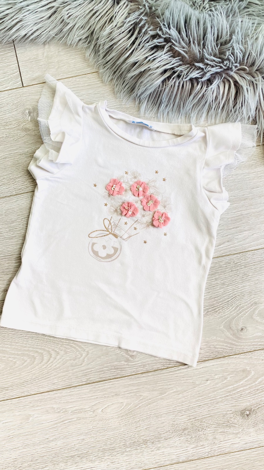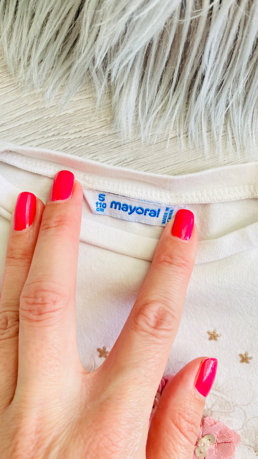 Dievčenské tričko mayoral , veľkosť 110, nosený veľmi dobrý stav, bez vád a chýb. Rozmery : šírka 2x30cm, dĺžka 38cm.
