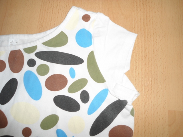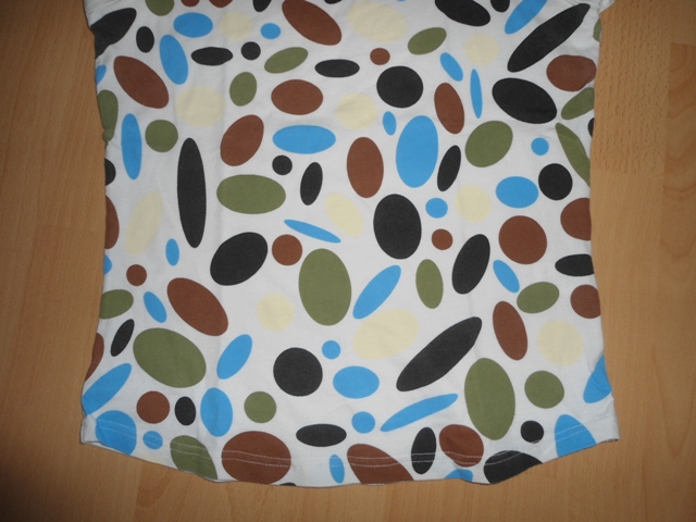 105a. biele tricko - farebne ovaly, velk. 38, 95% bavlna, 5% elastan, malo nosene, dlzka 54cm, rukav 9,5cm, cez prsia 45x2cm, neznicene