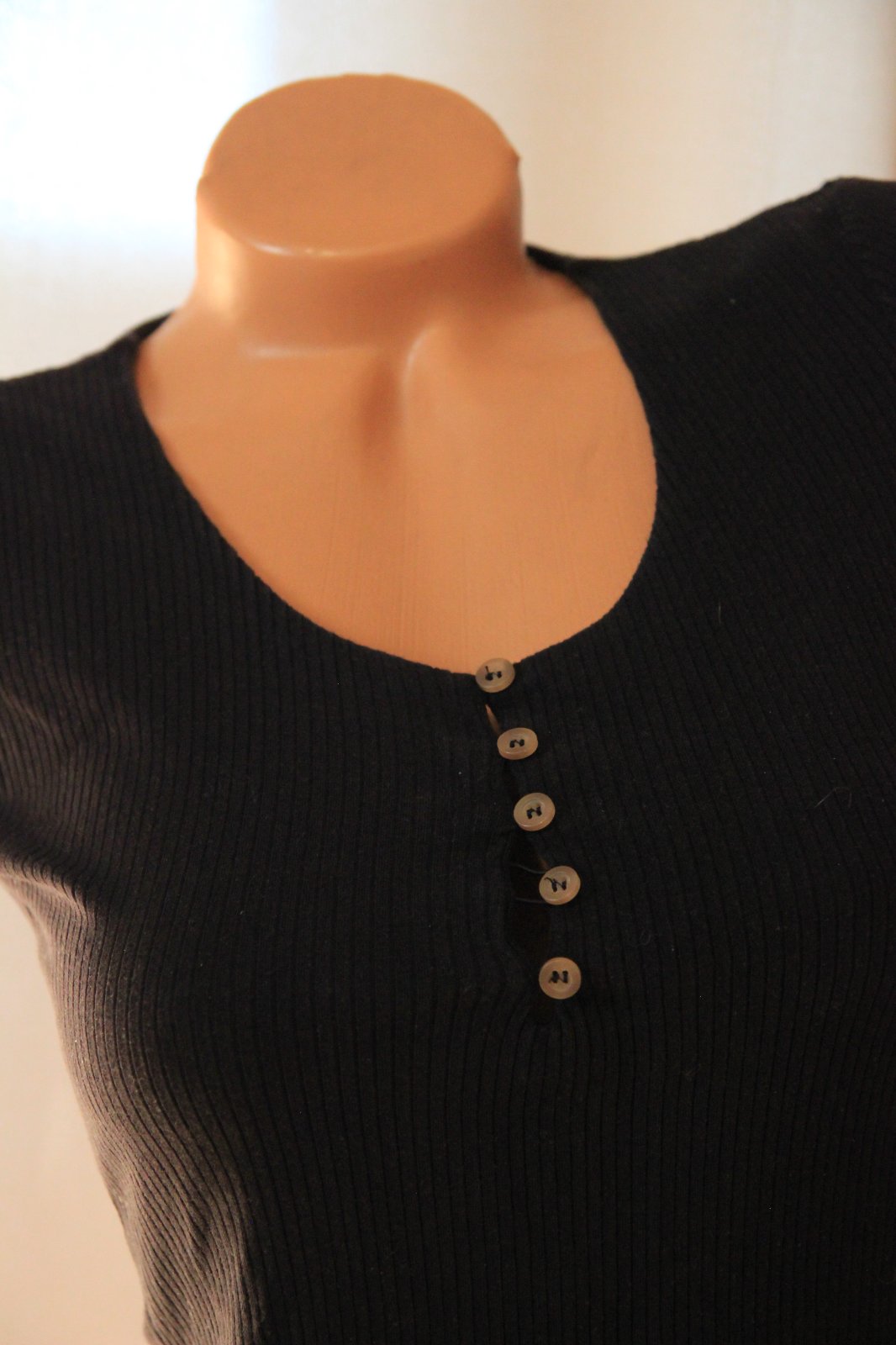 čierne body tričko, veľkosť XS. Jedna gumička pri gombíkoch je roztrhnutá. Inak pekný stav.