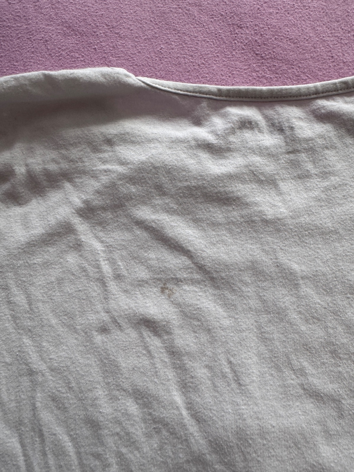Tričko je voľnejšieho strihu, vzadu je od pol chrbta kombinované s priesvitnou bielou látkou, dobrý nosený stav, len žmolky od prania. Dlžka vpredu 49cm, dlžka priesvitnej látky vzadu 58cm.