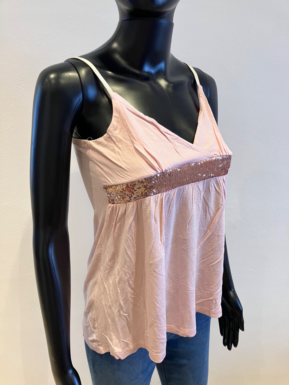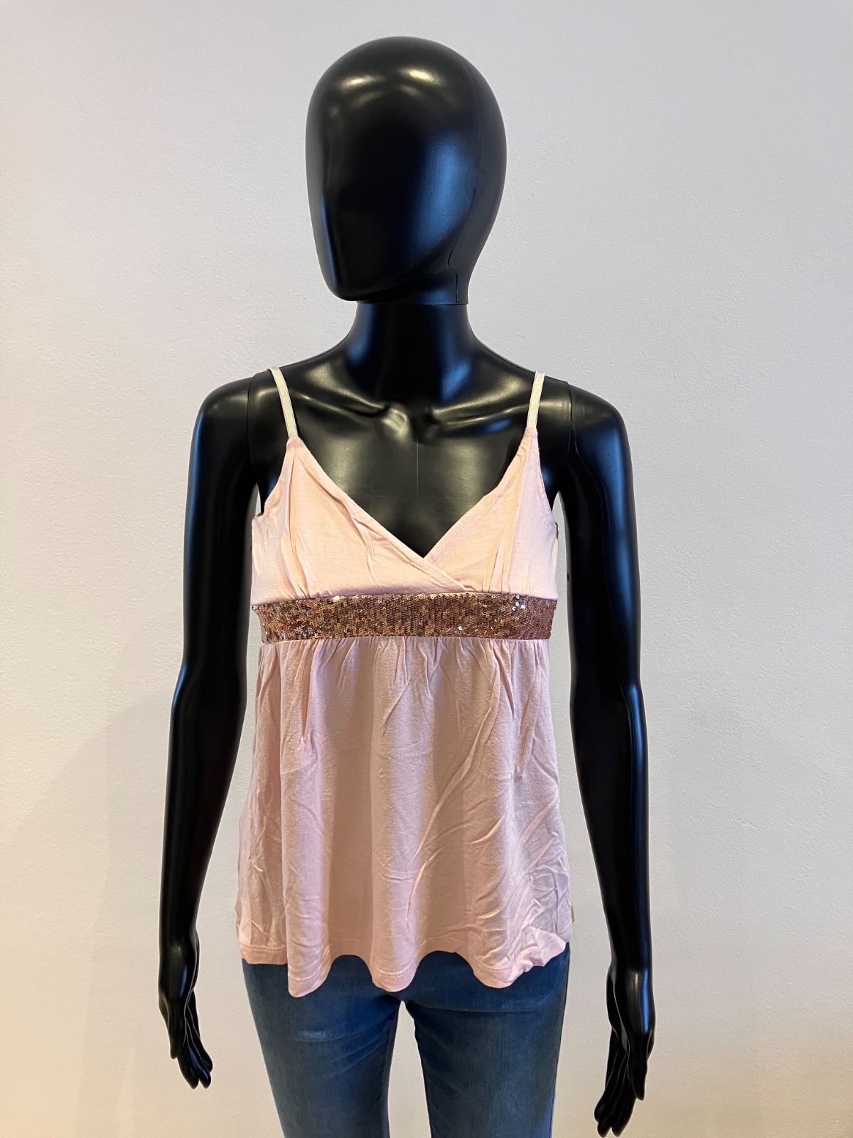 Dámske, dievčenské ružové tričko na tenké ramienka s flitrami, ramienka sú nastaviteľné, elastické.
