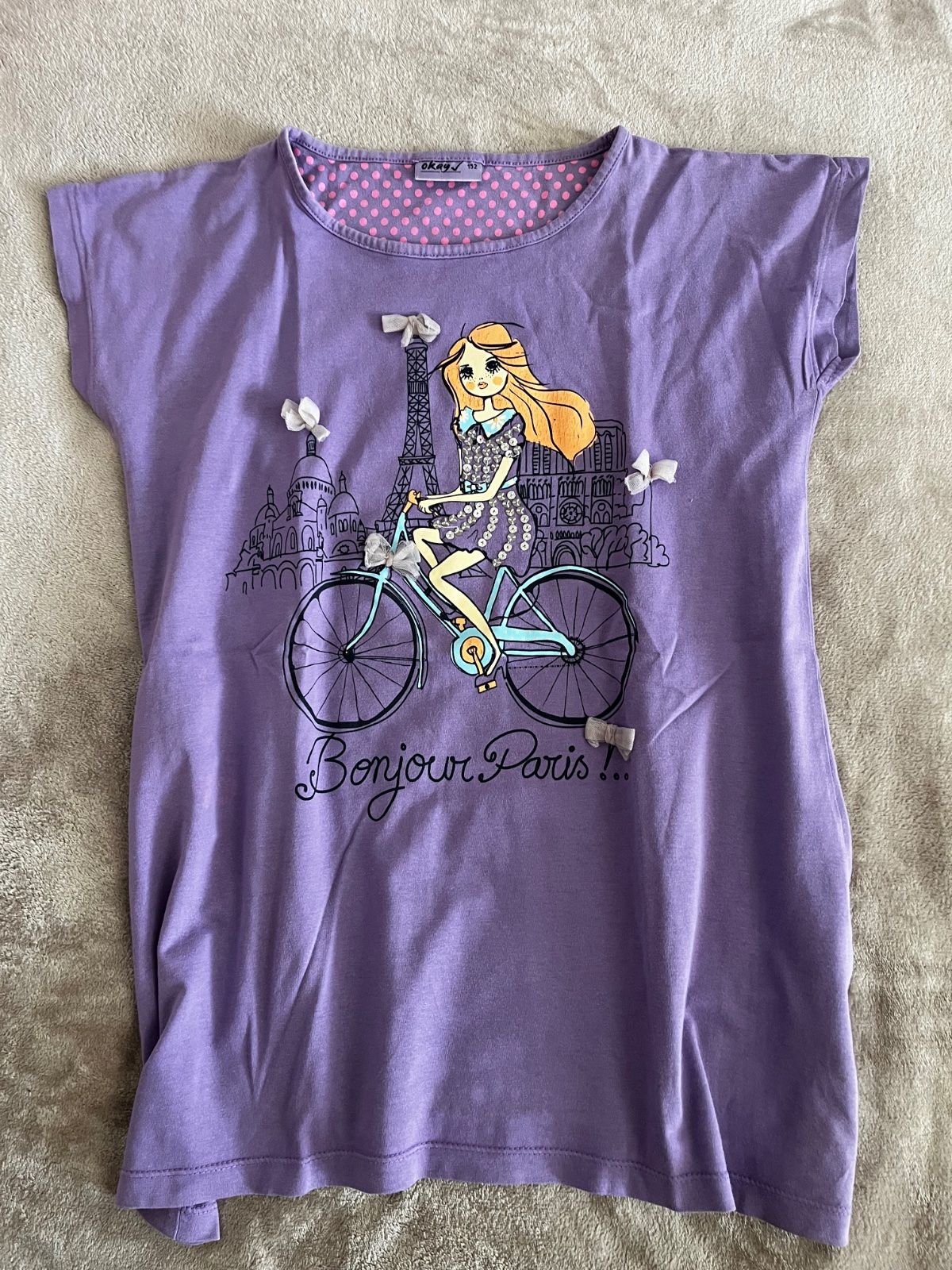 Tričko v dobrom nosenom stave zn.Okay veľ 152. Aplikácia je v poriadku a má fľaky pod pazuchou viď.foto.
