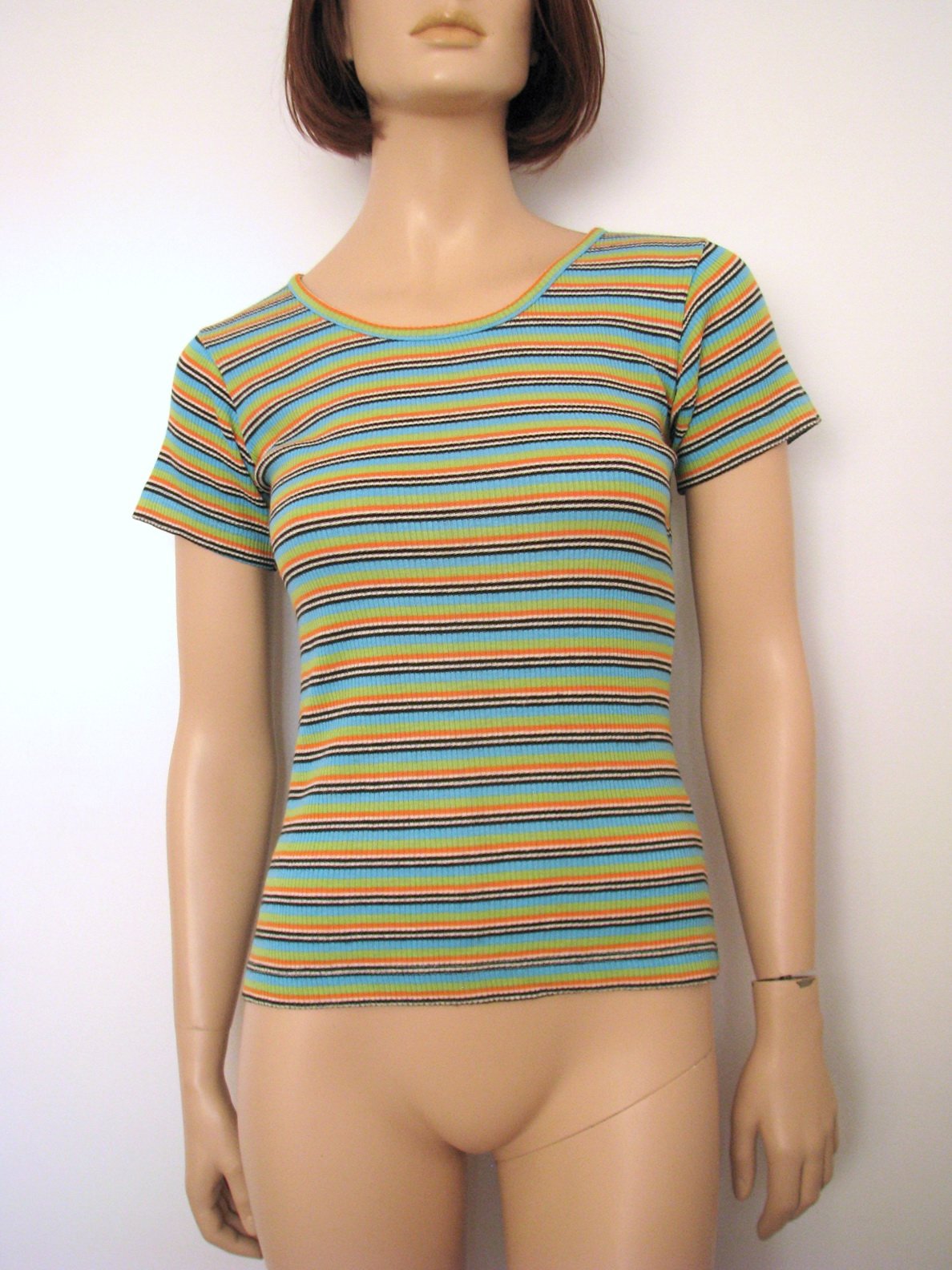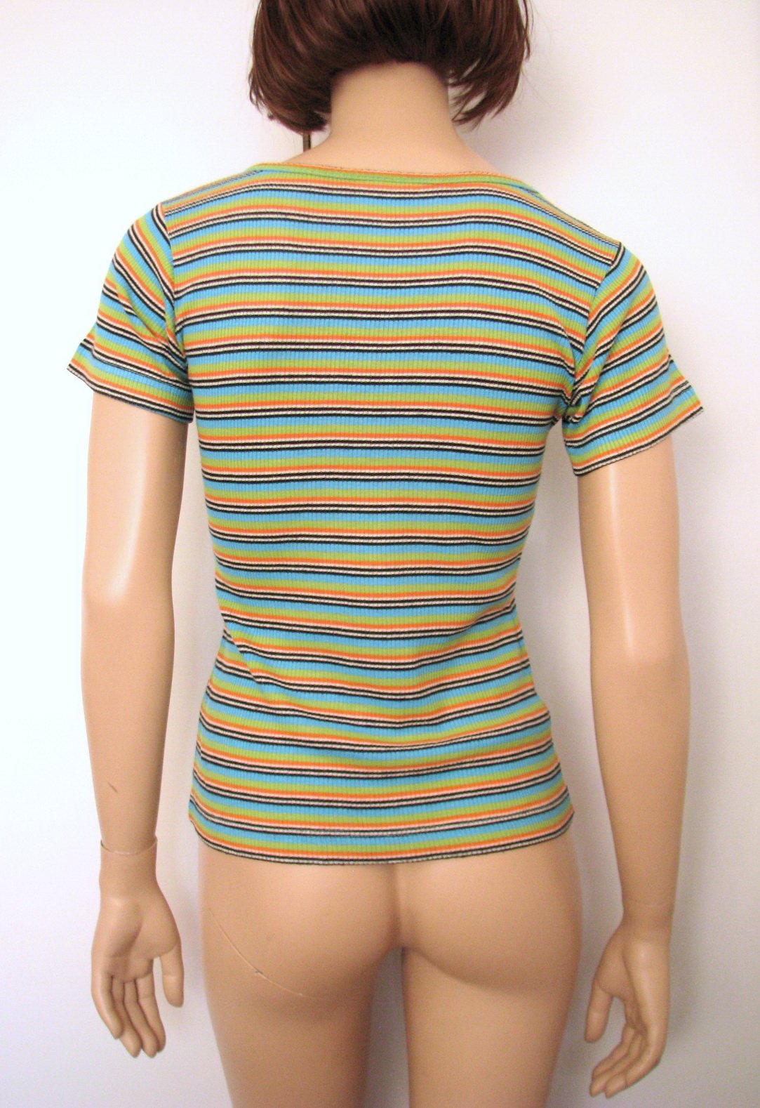 Pestrofarebné pásikavé tričko, farby: čierna, biela, oranžová, zelená, tyrkysová. Má iba pár mini nenápadných žmolkov v oblasti bokov a trošíčku pod pazuchami, úplne minimálne. Odžmolkovač hravo odstráni. Inak je bez poškodení, pekne zachovalé. Materiál 82% akryl, 18% bavlna. Veľkosť odhadom M, možno sadne aj na L (figurína je S). V prípade záujmu premeriam.