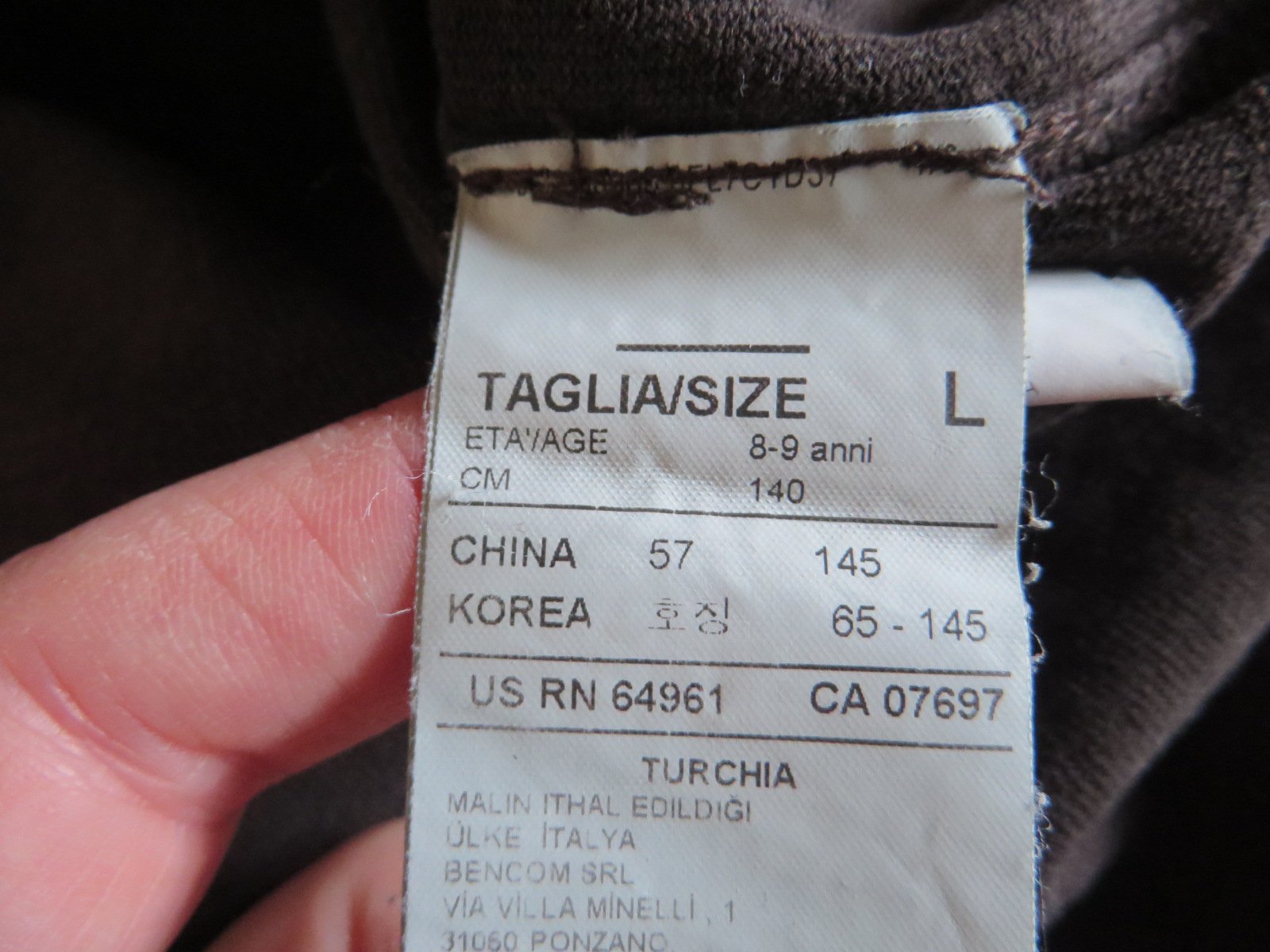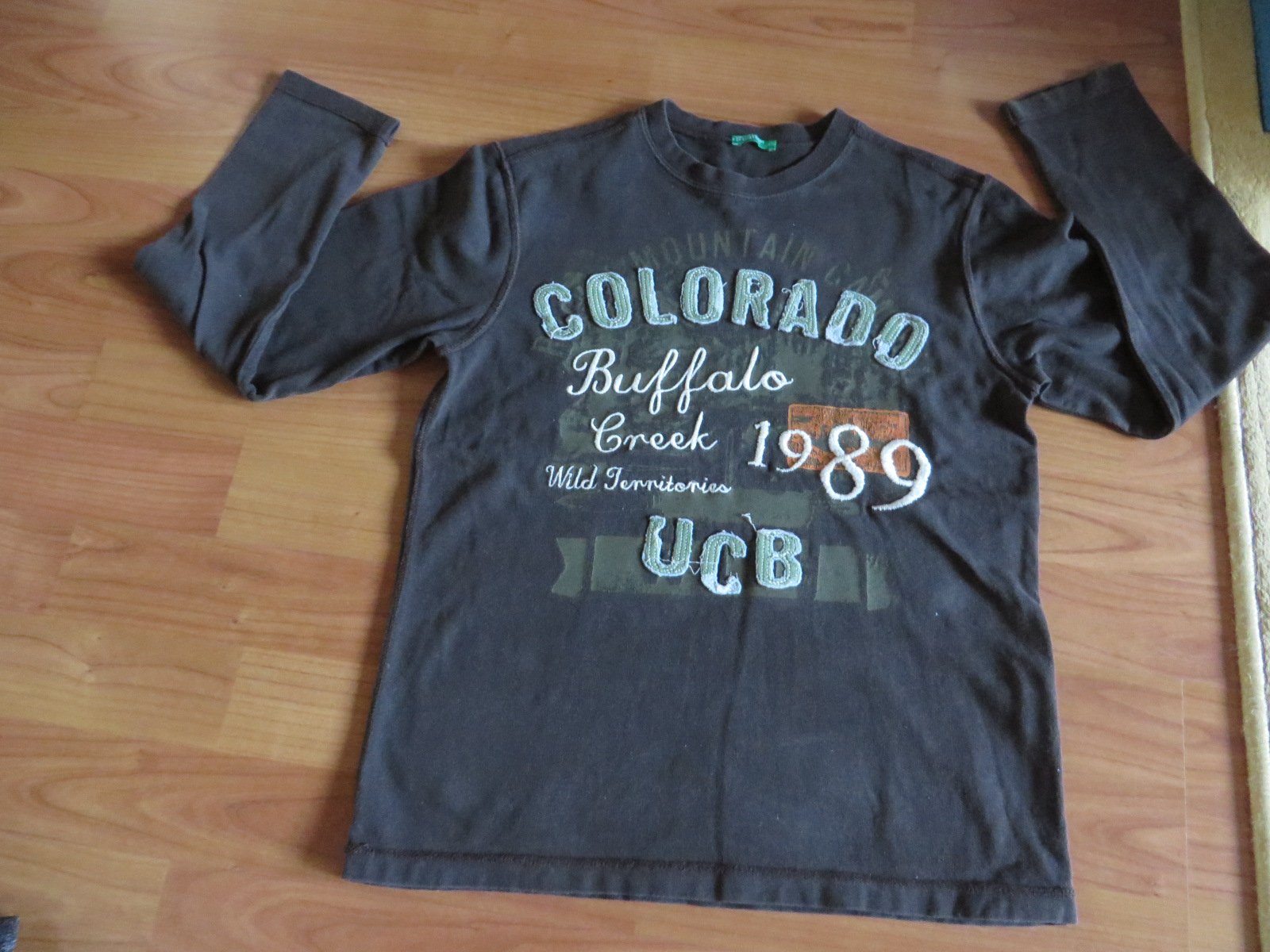 6/ Tmavohnedé tričko s vyšitou aplikáciou, veľkosť je 146/152 (ak keď sa uvádza veľ. 140), je trochu hrubšie, značka Benetton, nosenie je vidno - cena 1,50€.