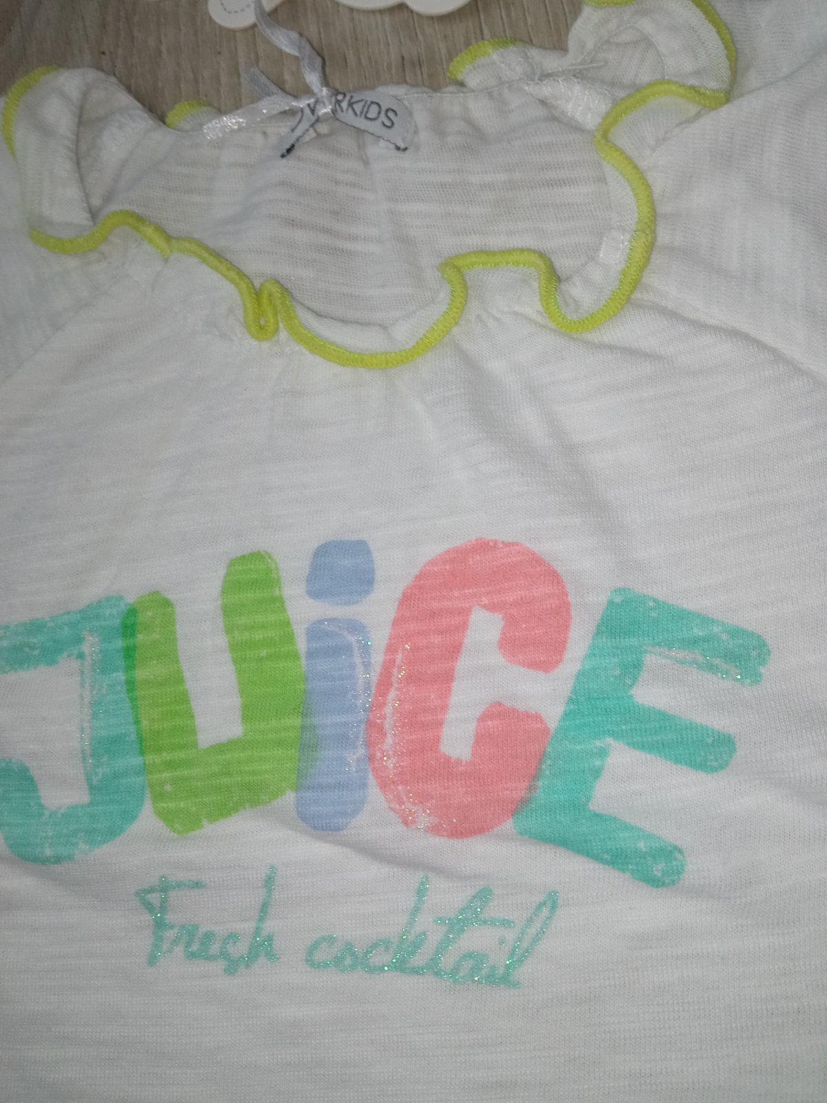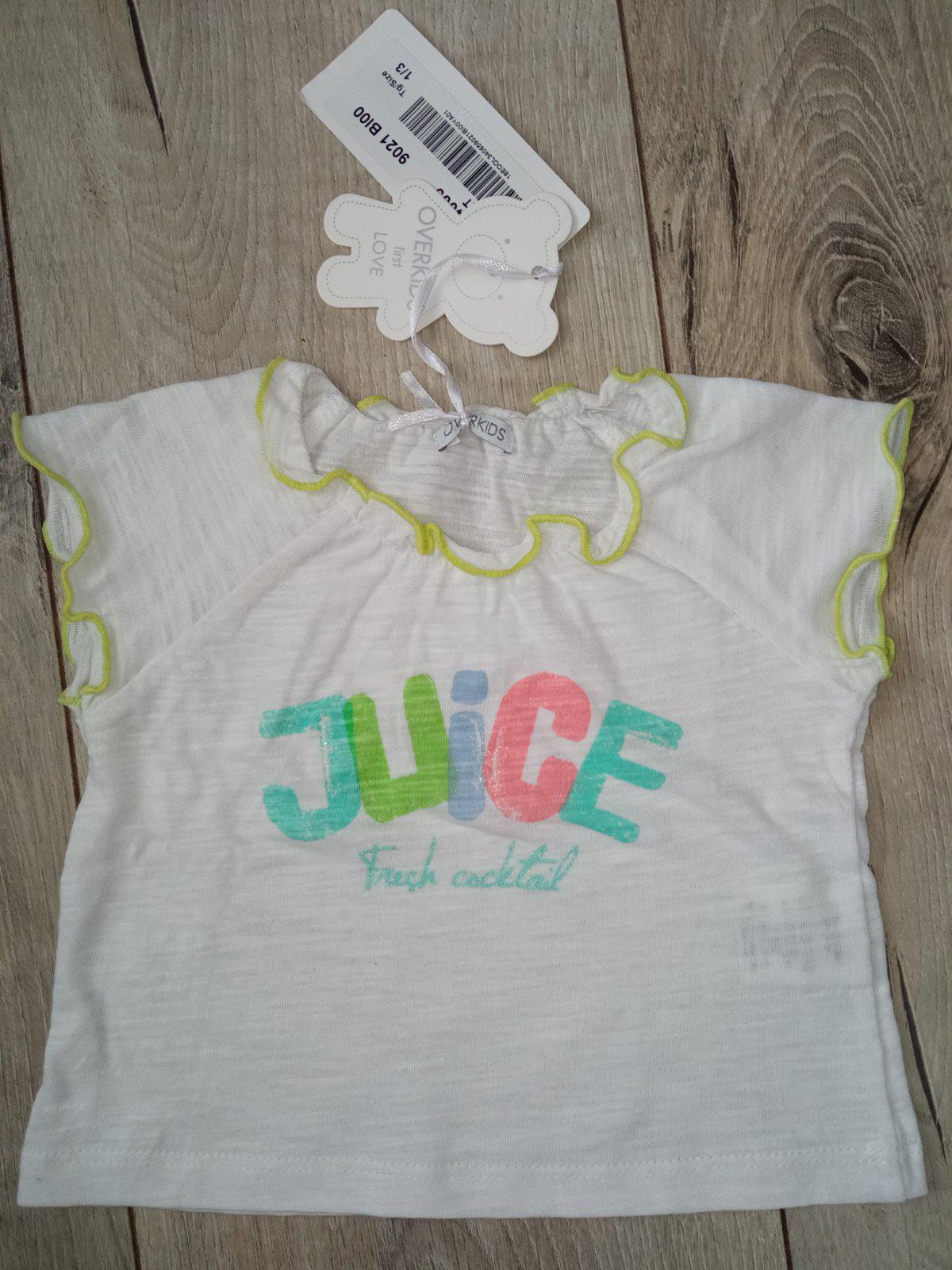 SkladomDievčenské tričko s krátkym rukávom značky Overkids, melírované, s fodričkami na krku a na rukáve. Nápis Juice fresh coctail, niektoré písmená sú lesklé. Pri krku a pri rukáve s jemnou elastickou gumičkou. Elastické. Pre 6-9 mes. Materiál 100%bavlna.