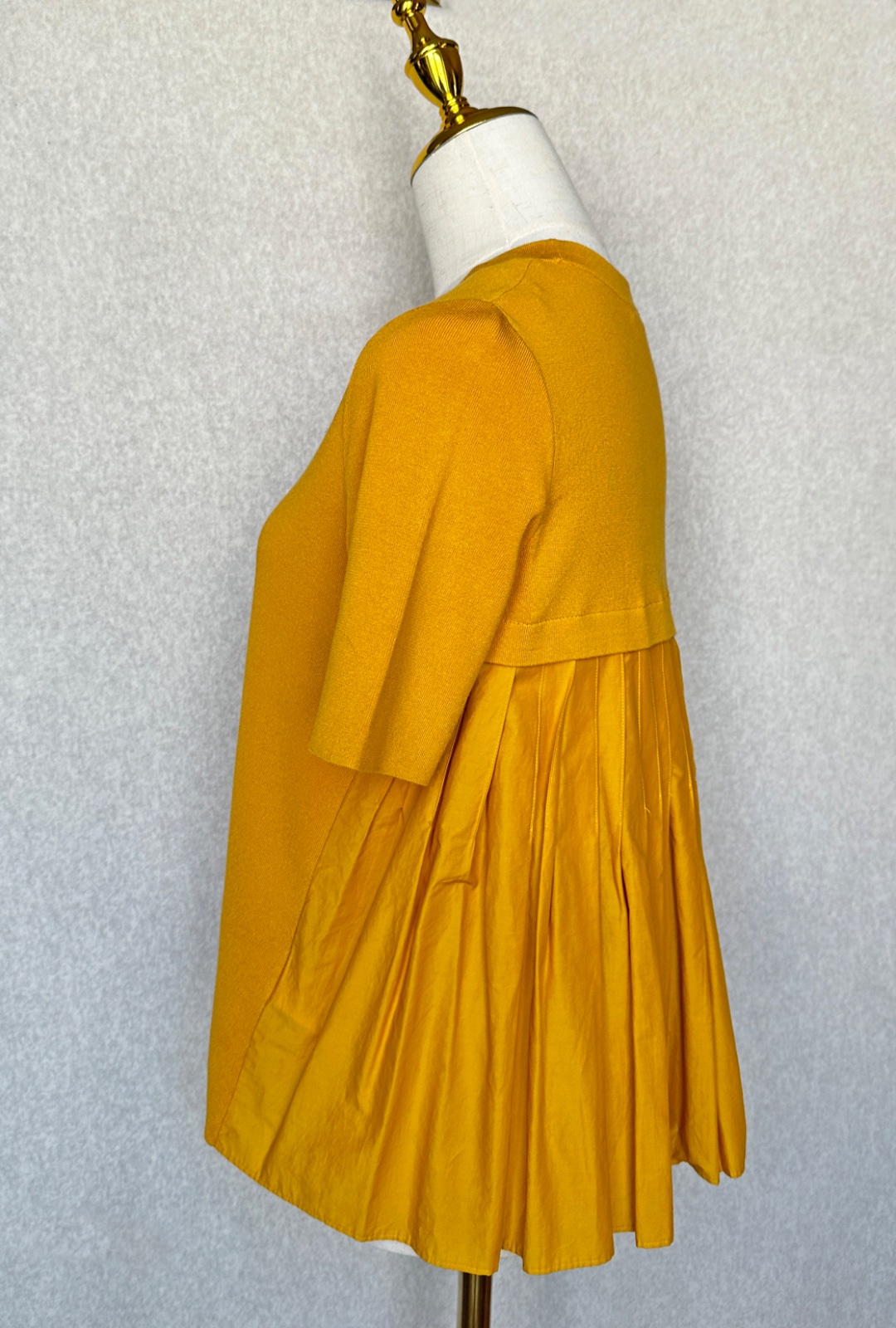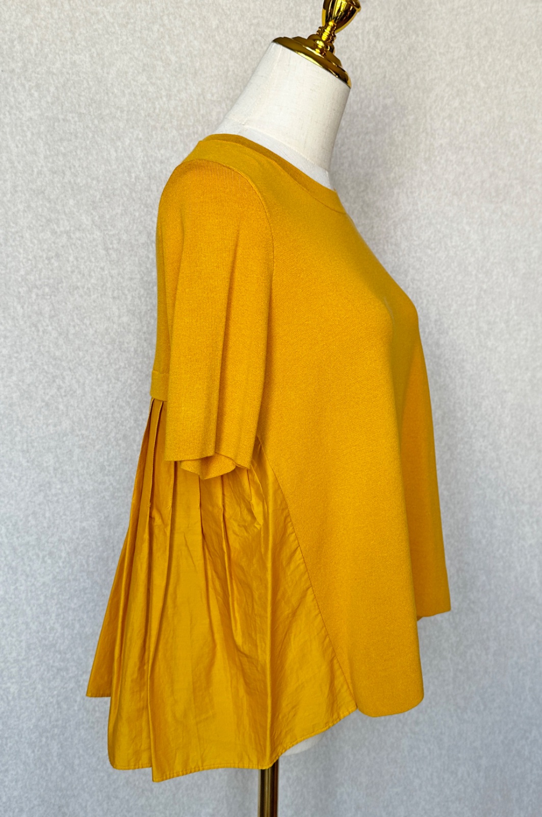 Štýlový top / pulovrík s krátkym rukávom a vejárovým chrbátom. Predný diel je jemný úplet, zadný diel je plísovaná látka s jemným leskom, ktorý mu dodáva nádych elegancie a luxusu. Materiál je 100% bavlna. Pranie v pračke 30°C. V super stave, bez poškodení. Sedí aj na S veľkosť.