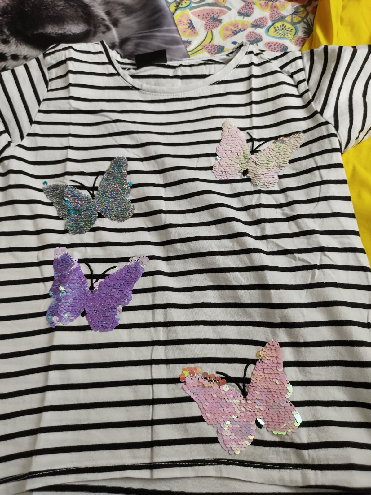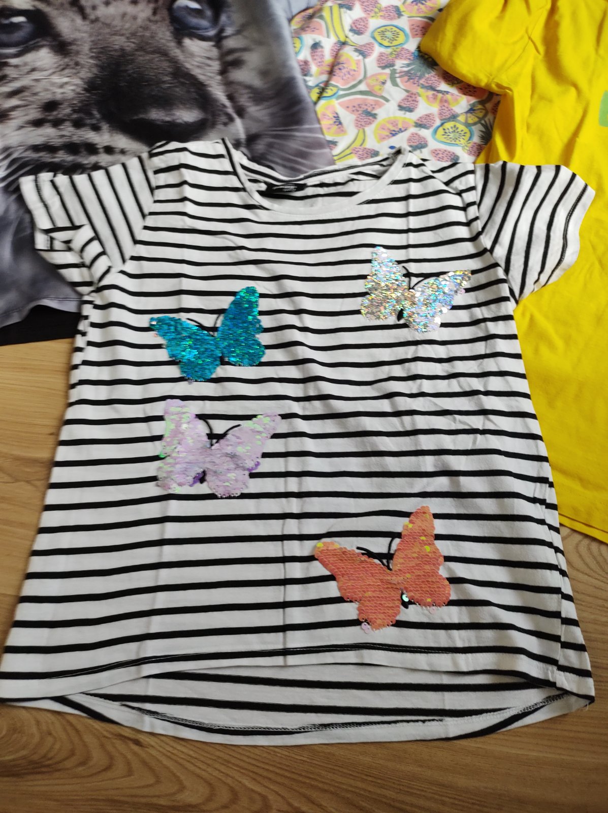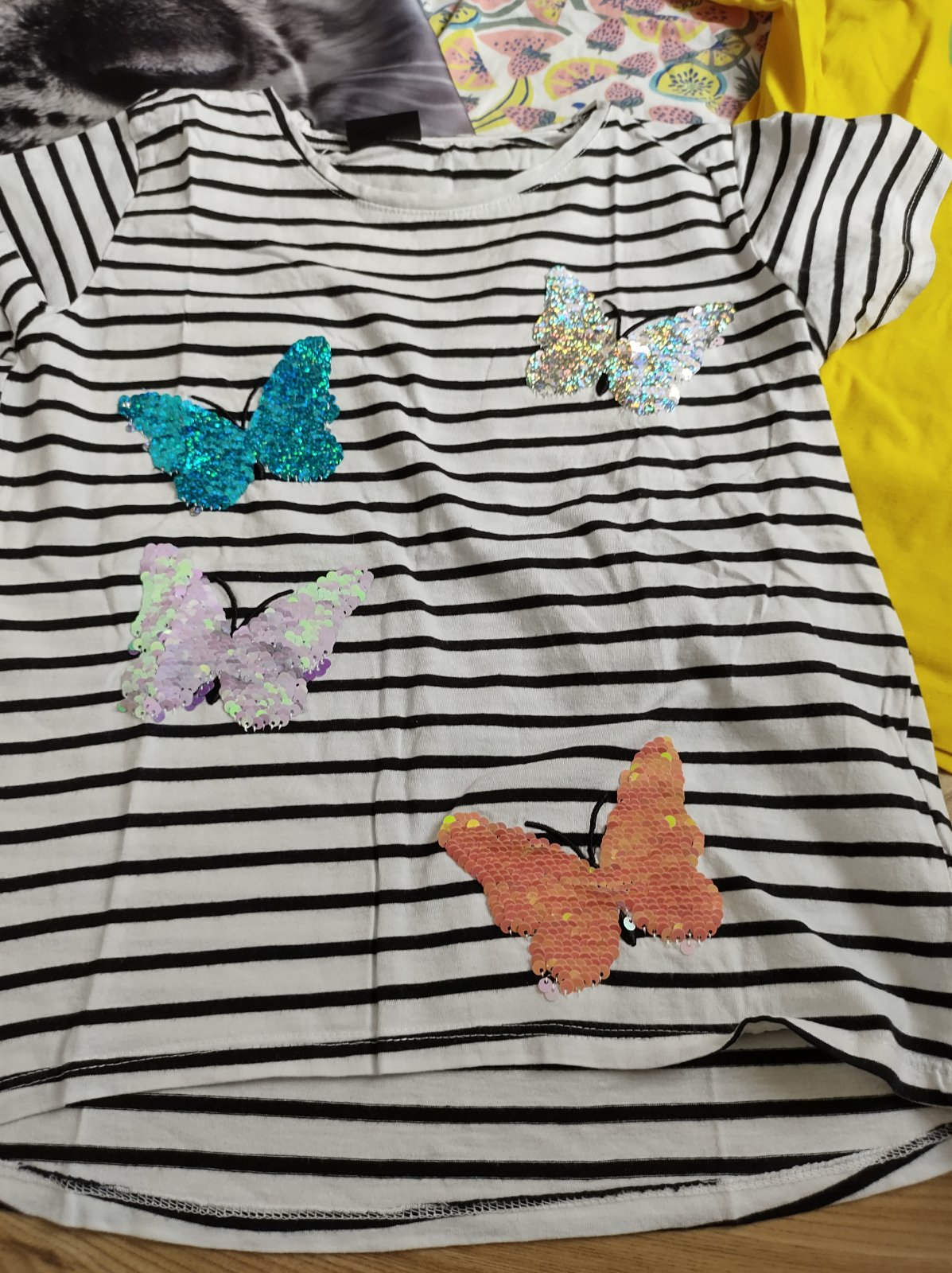 Tričko zn. Page biele s aplikáciou motýľov- premieniace flitre: Šírka 2 x 42 cm, dĺžka 51cm, 100% BA. Bez poškodení.