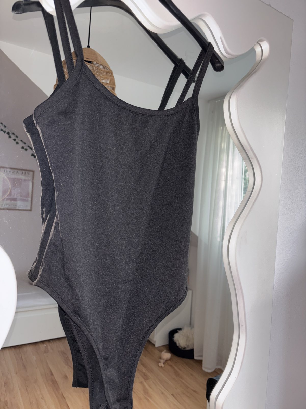 Odstrihnute štítky, sedí na XS, čierne, pružné, šírka pod pazuchami 35 cm, dĺžka 70 cm