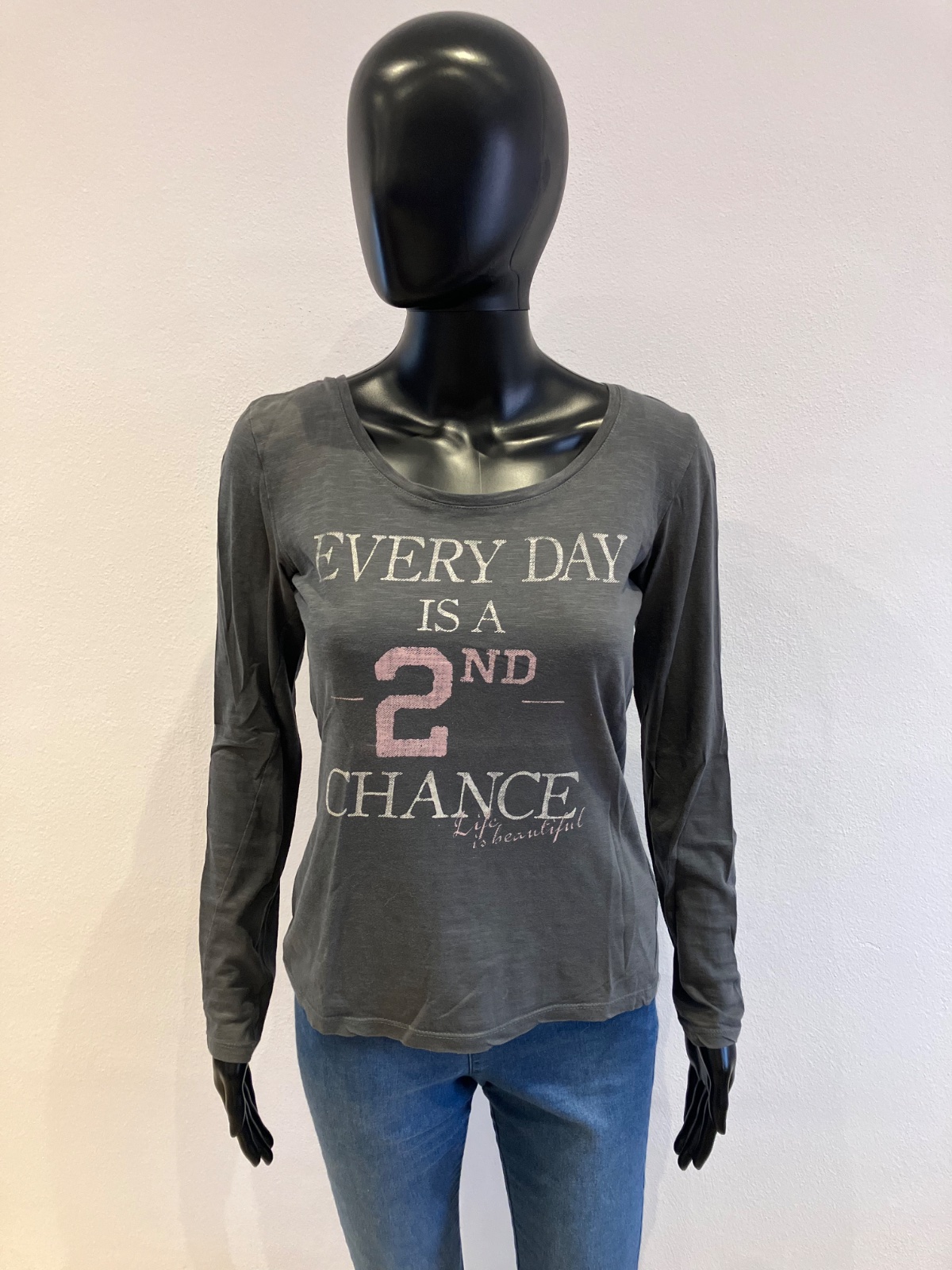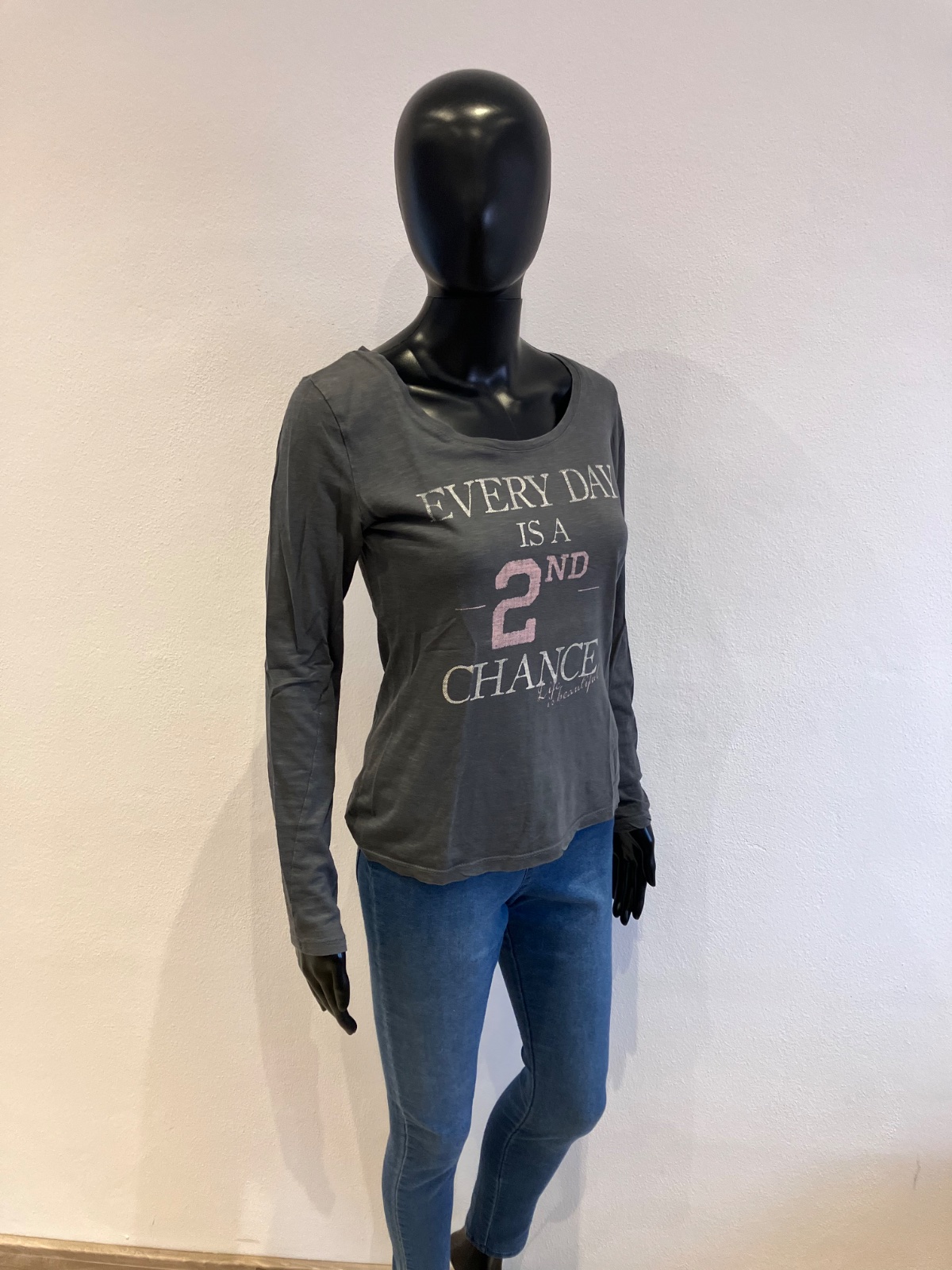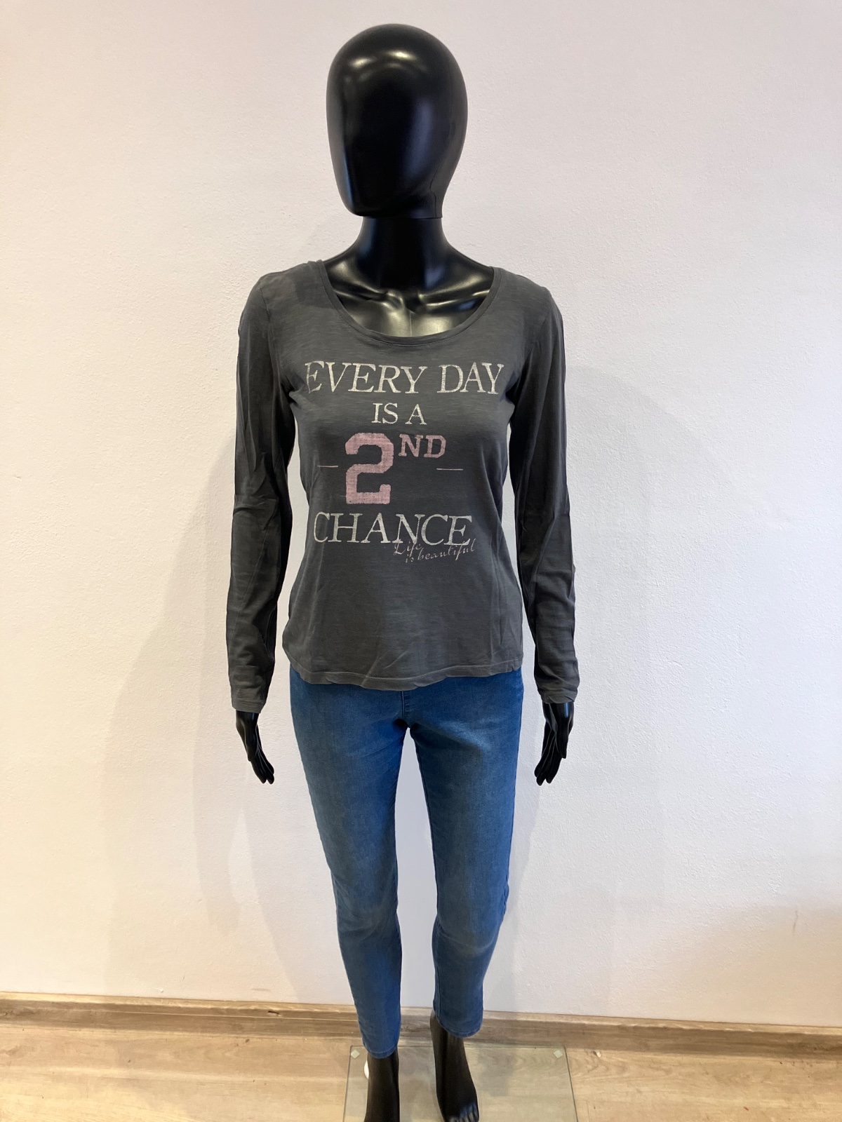 Dámske, dievčenské sivé tričko s dlhým rukávom a nápisom, lodičkový výstrih, tenké, elastické