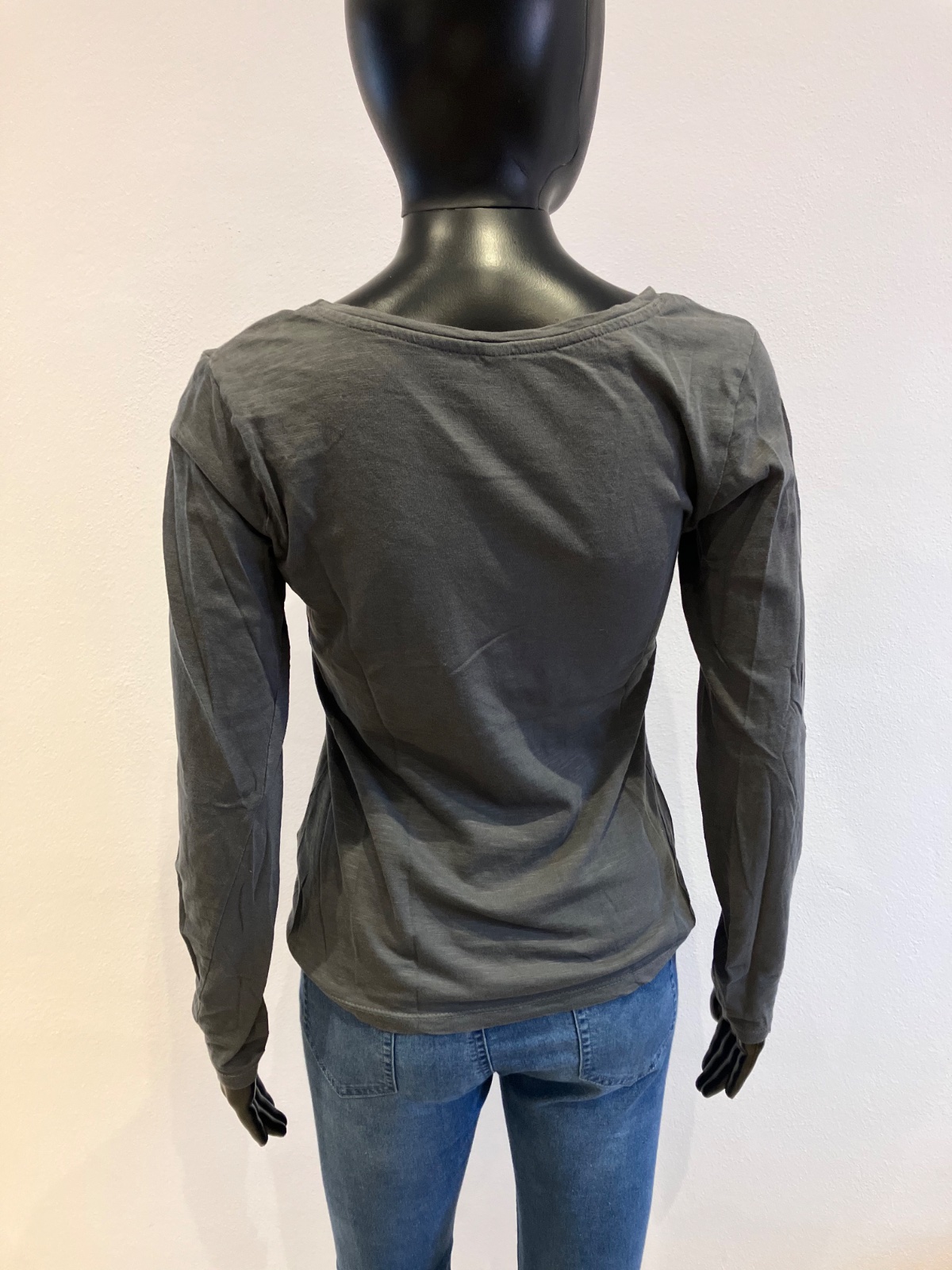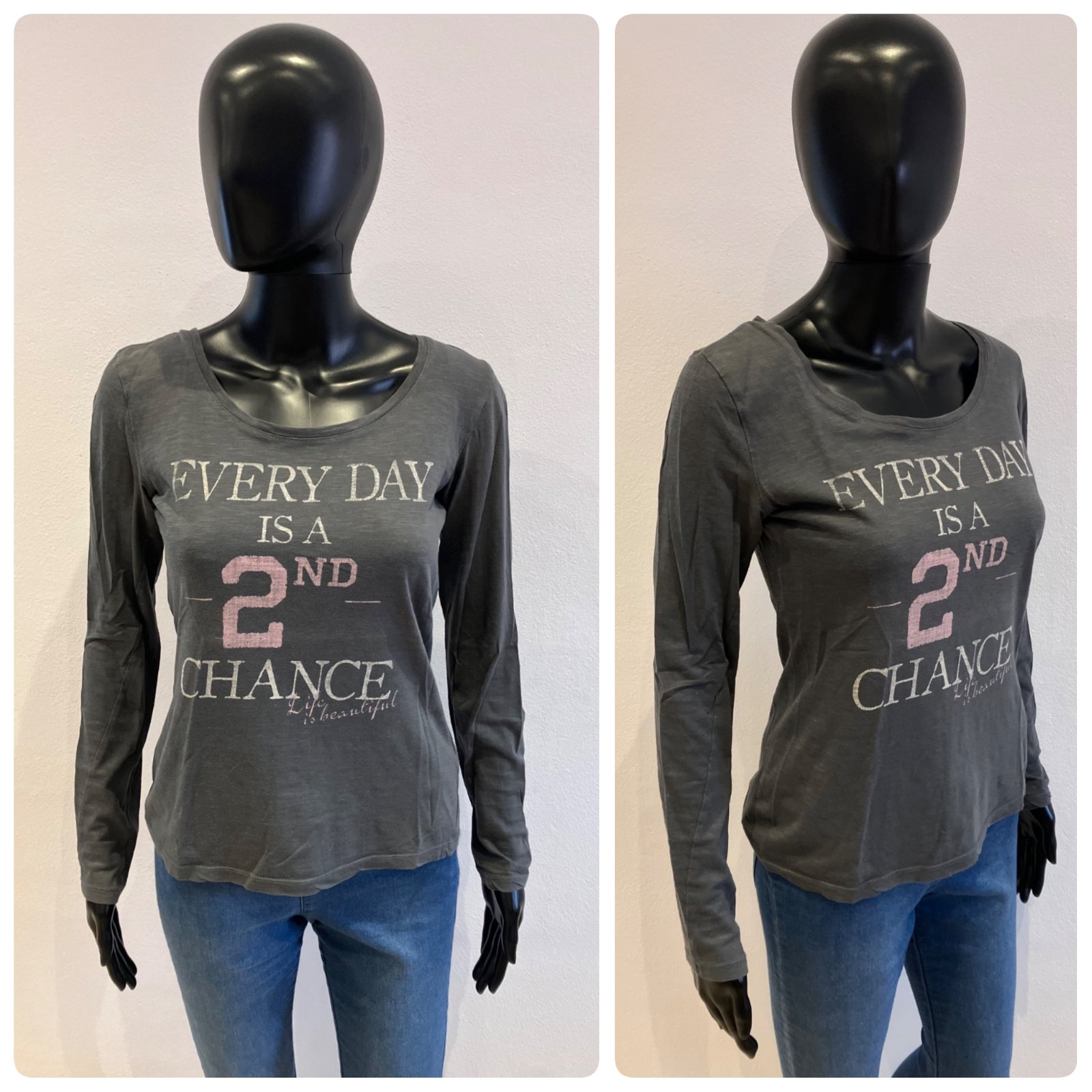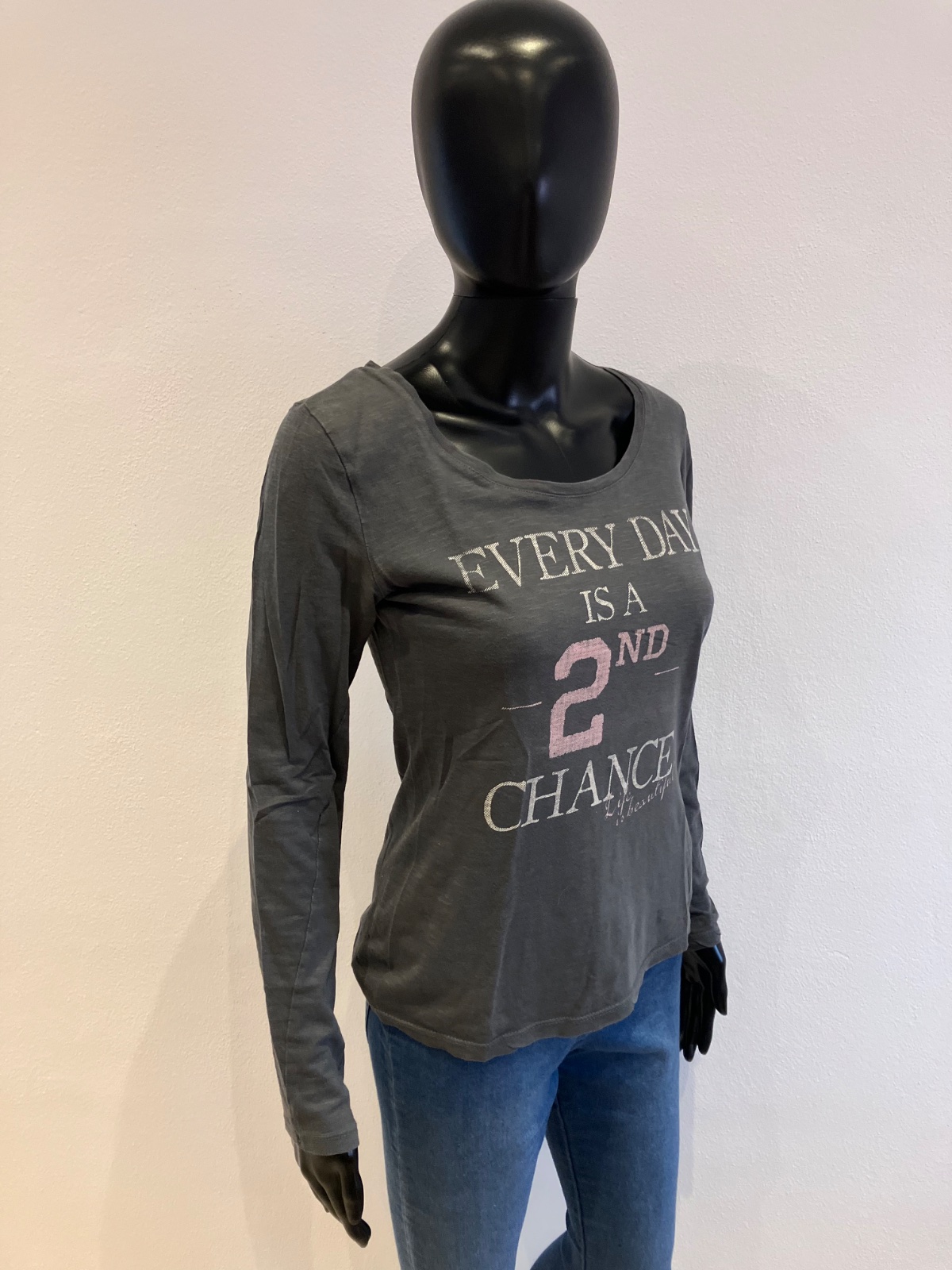 Dámske, dievčenské sivé tričko s dlhým rukávom a nápisom, lodičkový výstrih, tenké, elastické