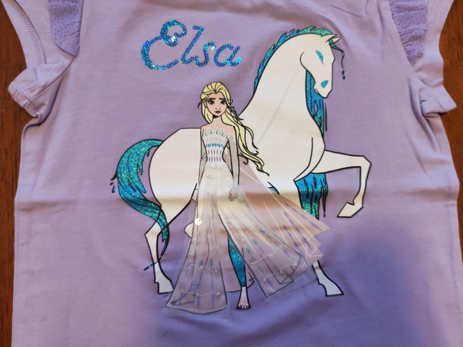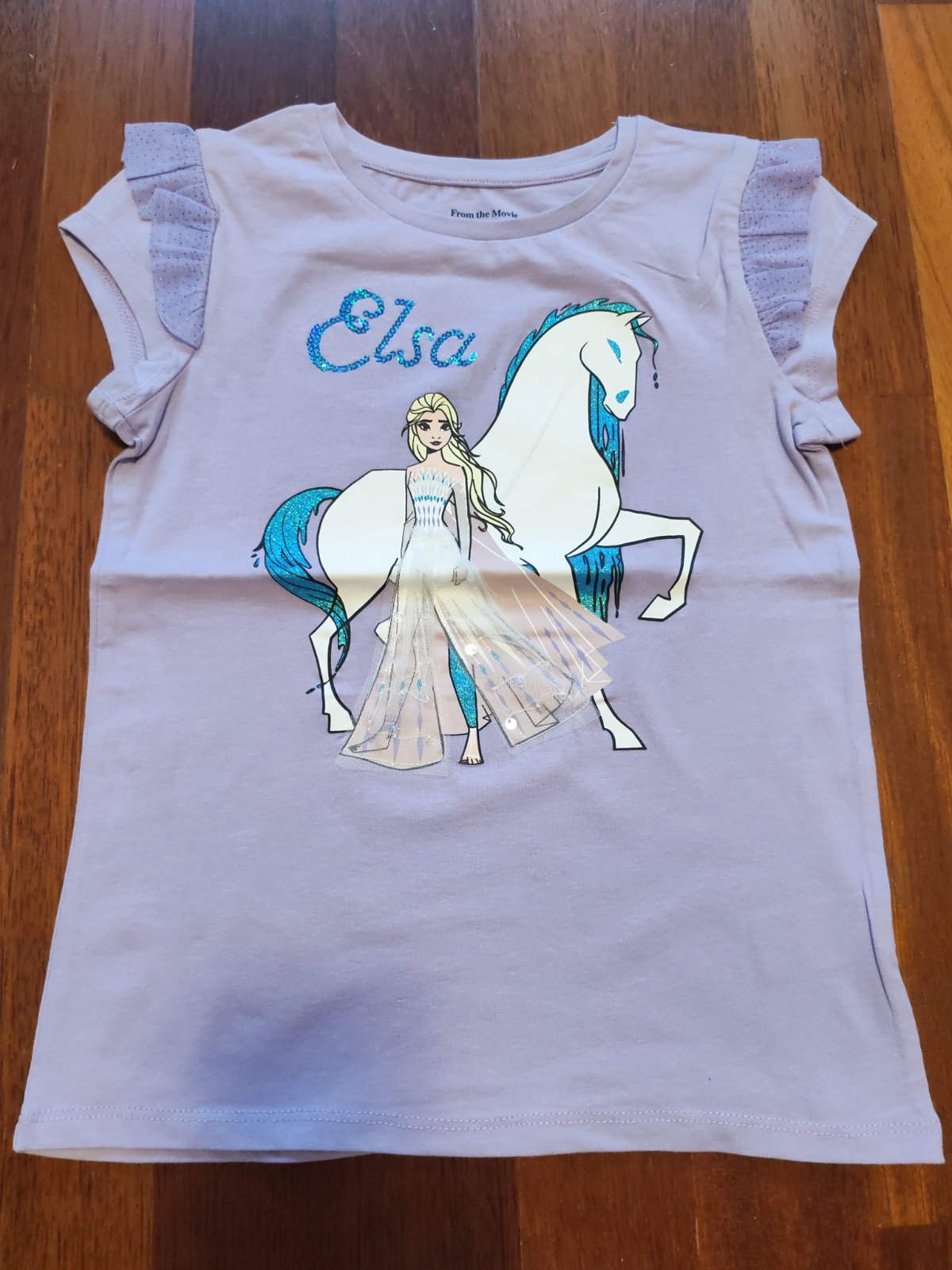 Nové nenosené tričko Frozen, kupované v C&A, veľkosť 128, so zaujímavým tylovým detailom na Else.