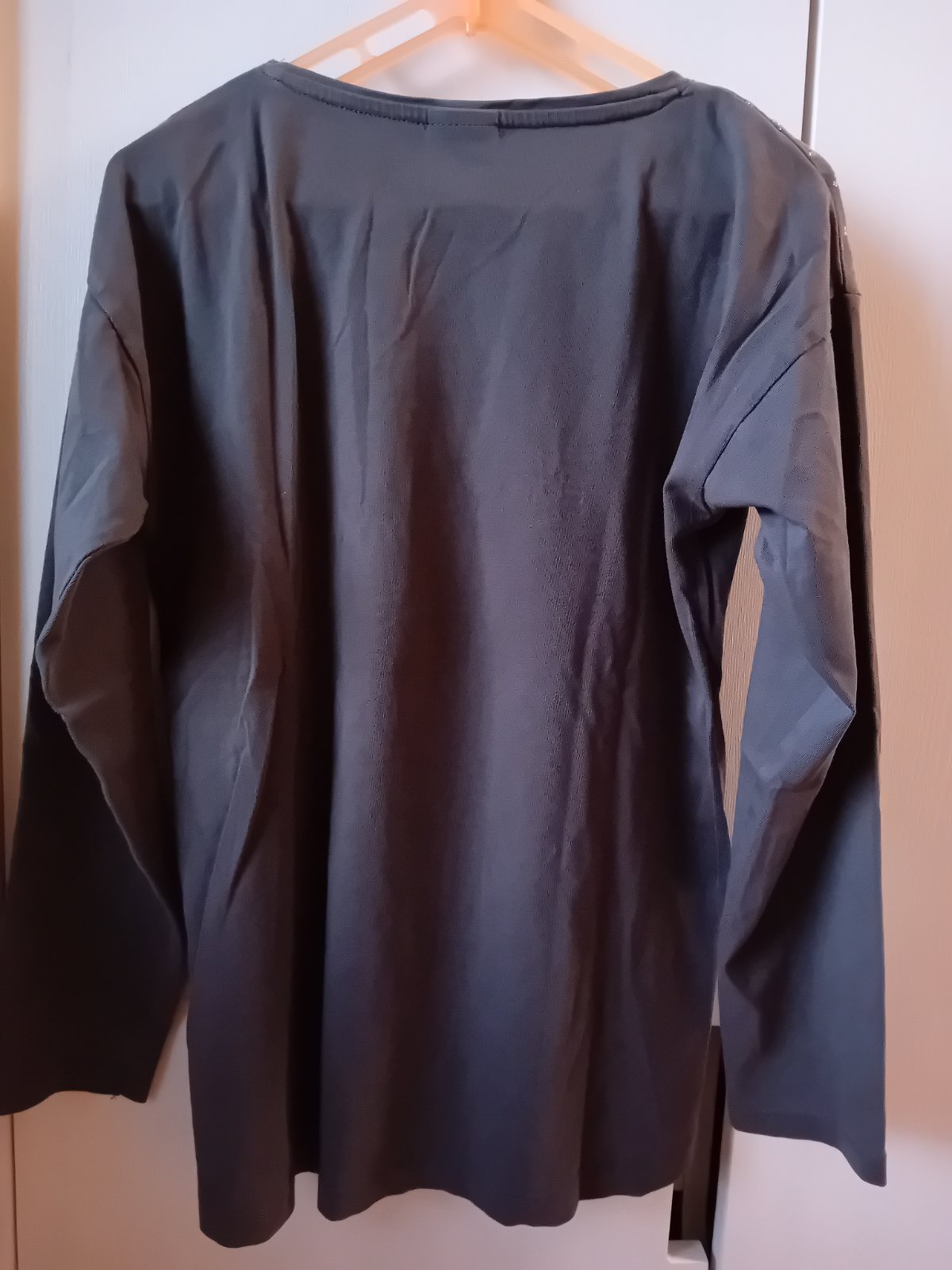 Malá dierka pri krku. Rozmery : šírka pod pazuchami 41cm, celková dĺžka od krku po spodok 51cm, dĺžka rukáva od ramena 54 cm.