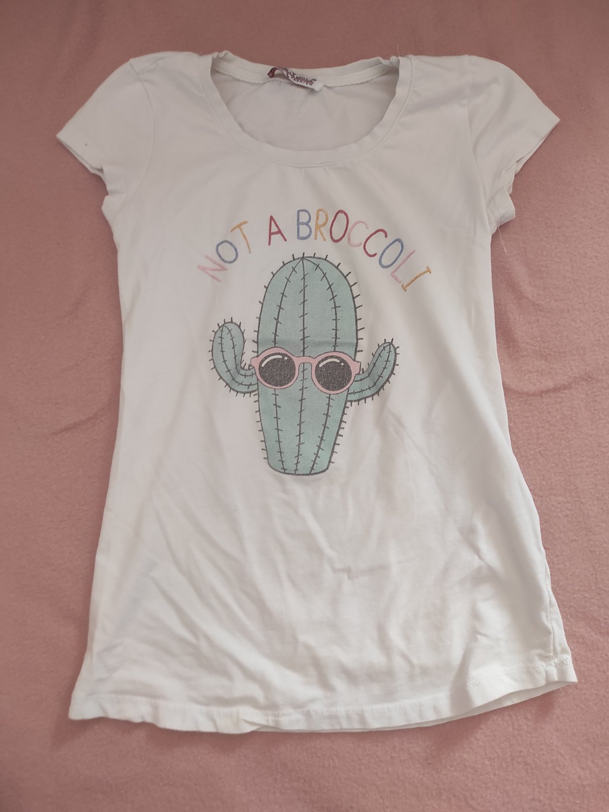 Štýlové predĺžené tričko s trendy potlačou a s viazačkou na zadnom dieli. Tričko má uvedenú veľkosť 152, dcéra nosila ako 146/152 - v prípade záujmu premeriam. Tričko je nosené, v super stave. Kuk...