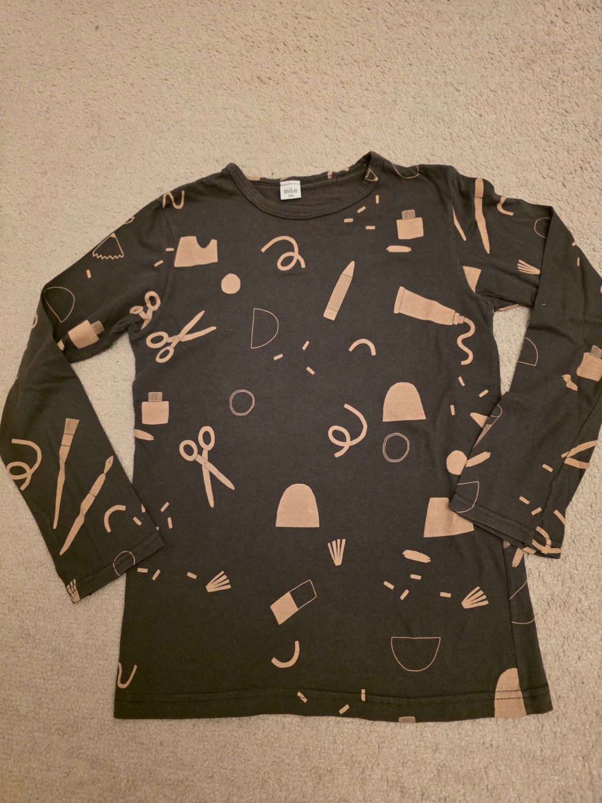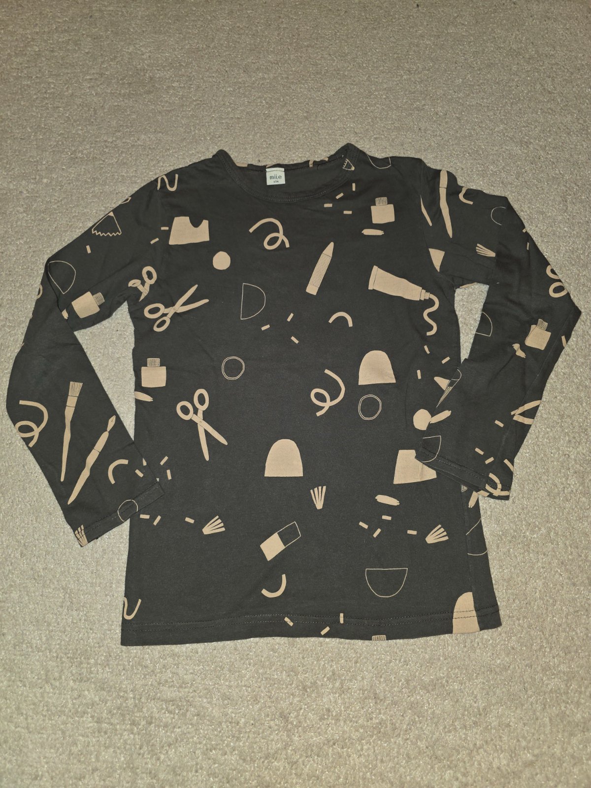 Predám štýlové detské tričko značky Mile, veľkosť 134. Tričko má tmavý podklad s originálnym potlačou motívov zo sveta tvorivosti – nájdete na ňom nožnice, štetce, tuby, kruhy, oblúky a ďalšie hravé prvky, v netradičnej béžovej farbe na tmavej látke. Materiál je príjemný, kvalitný a tričko je vhodné na každodenné nosenie do školy, voľnočasové aktivity aj tvorivé dielne.