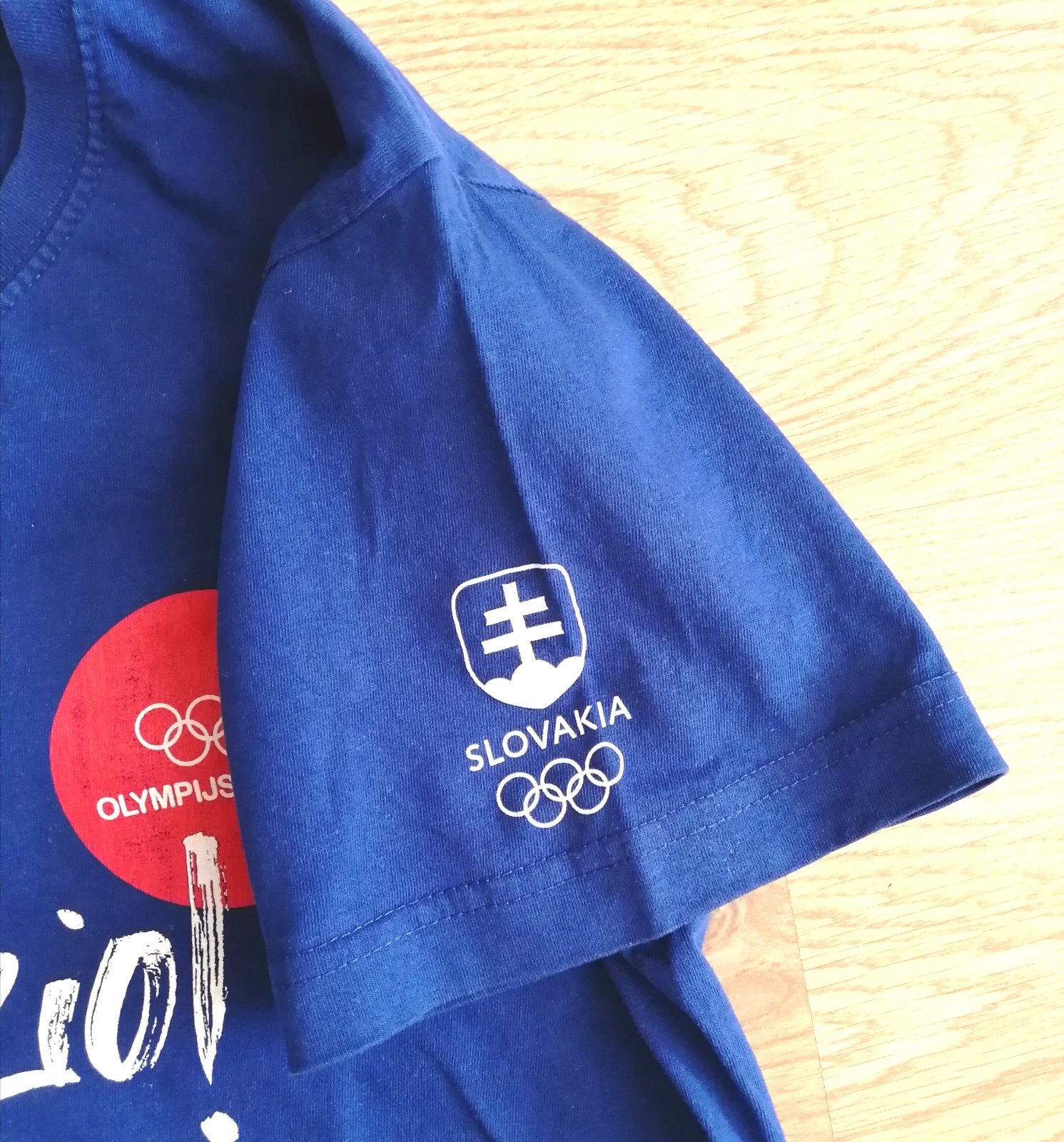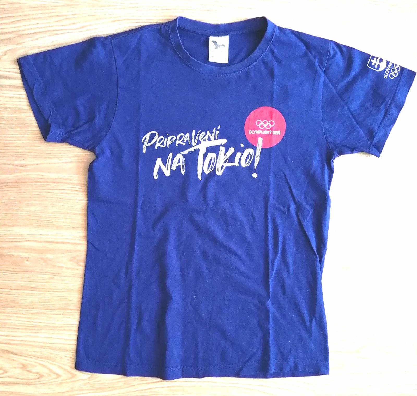 Za poštovné darujem bavlnené tričko s krátkym rukávom, v tmavomodrej farbe s potlačou s motívom olympijských hier v Tokiu.