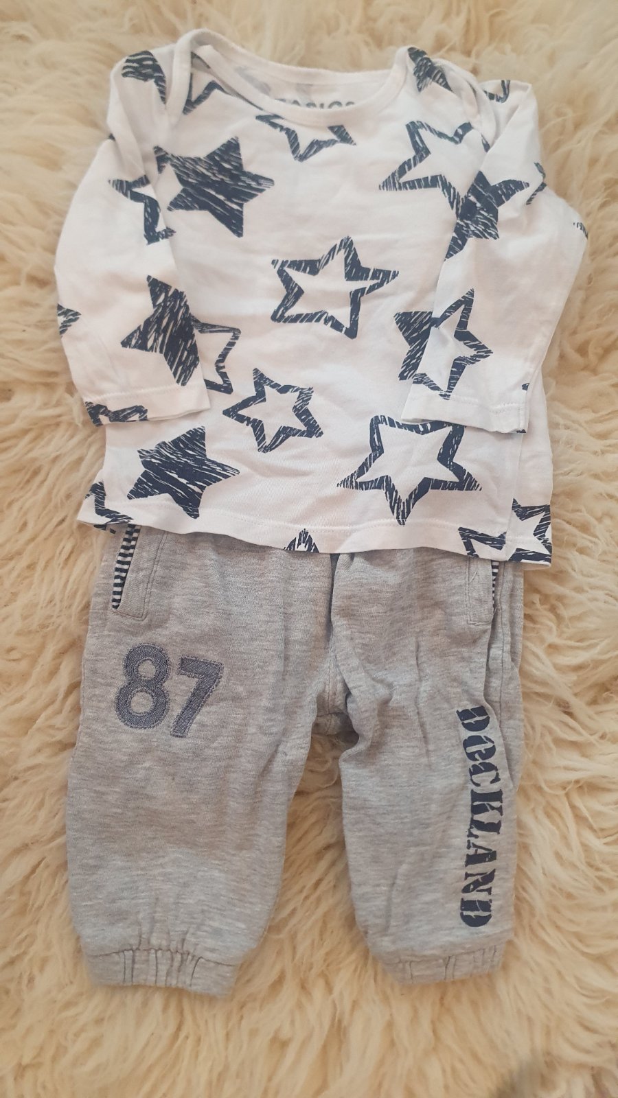 Predám tričko a dlhým rukávom a tepláky vo veľkosti 62/68. Tepláčiky majú značku FNF a tričko Basics. Cena spolu 5€