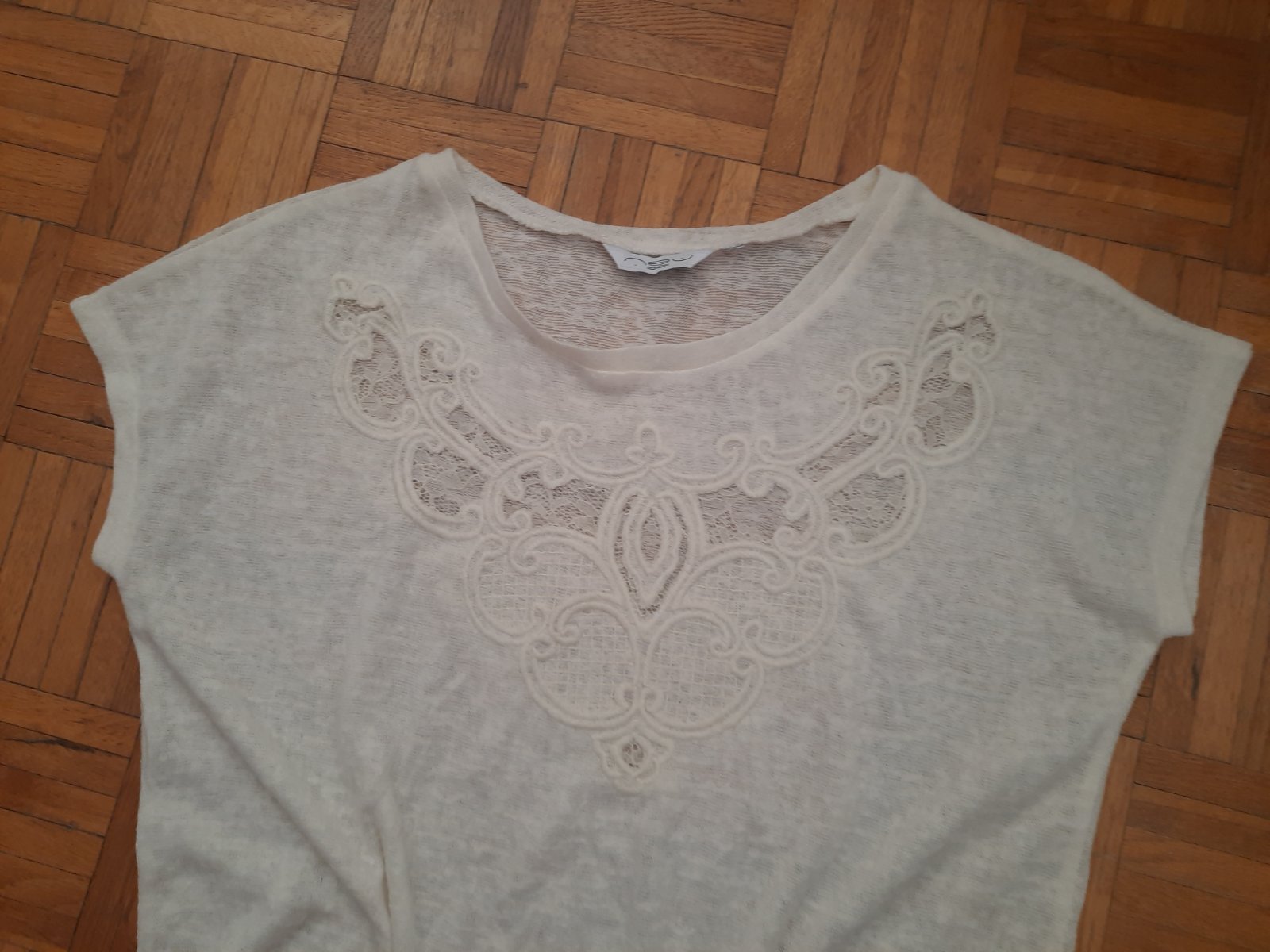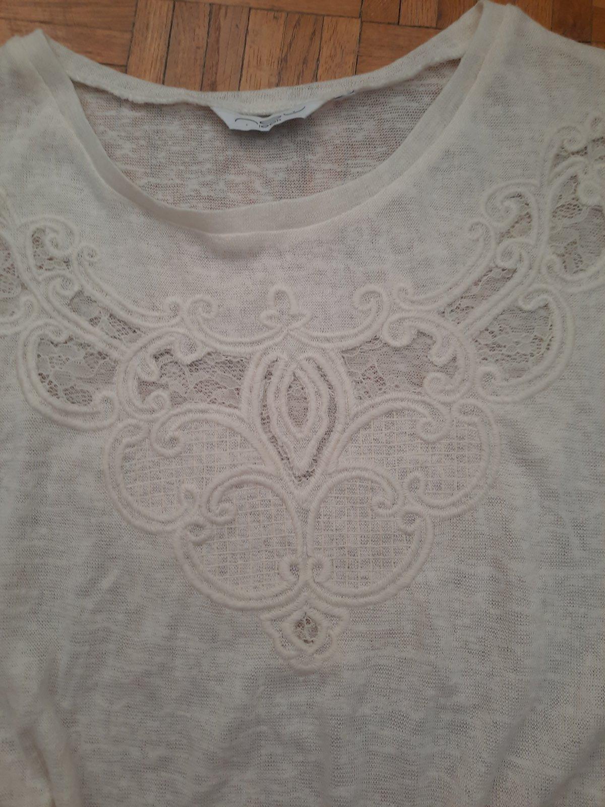 Veľmi pekný top- vpredu s peknou ozdobou. Jemná maslová farba, výborný stav. Super materiál- ako pletenina.