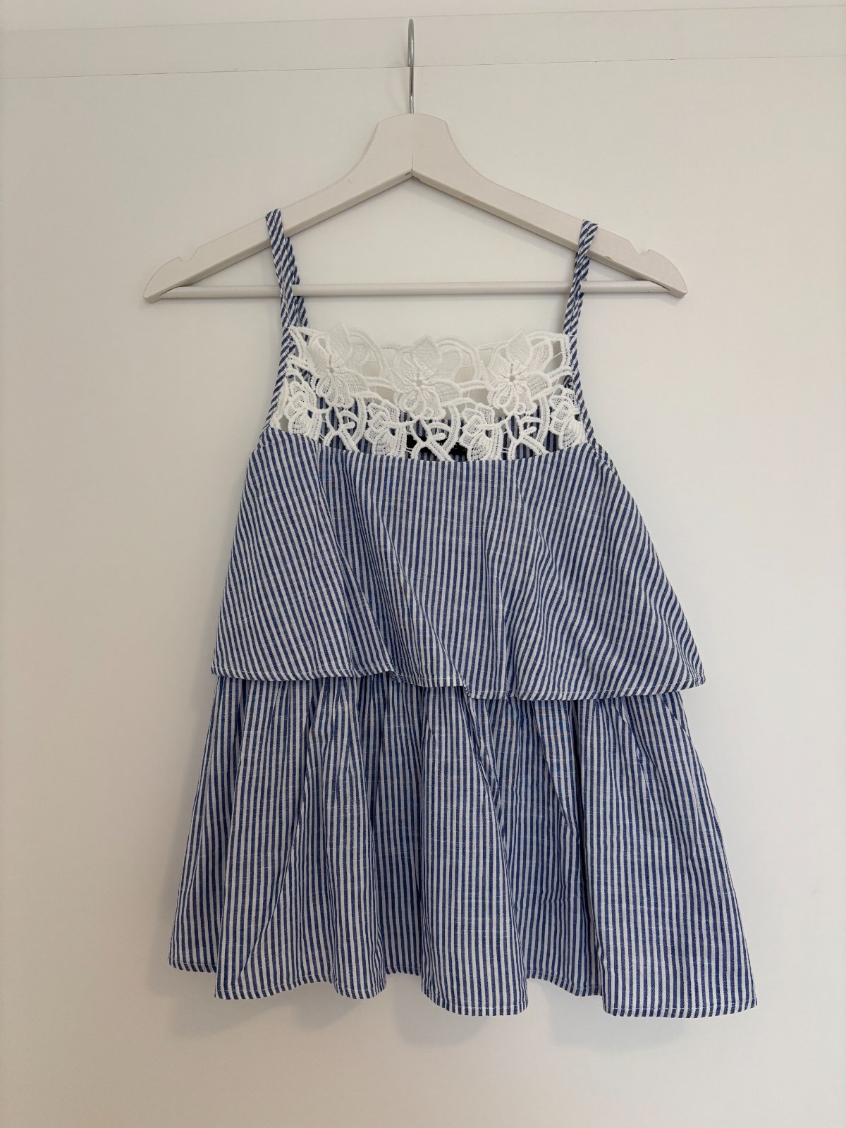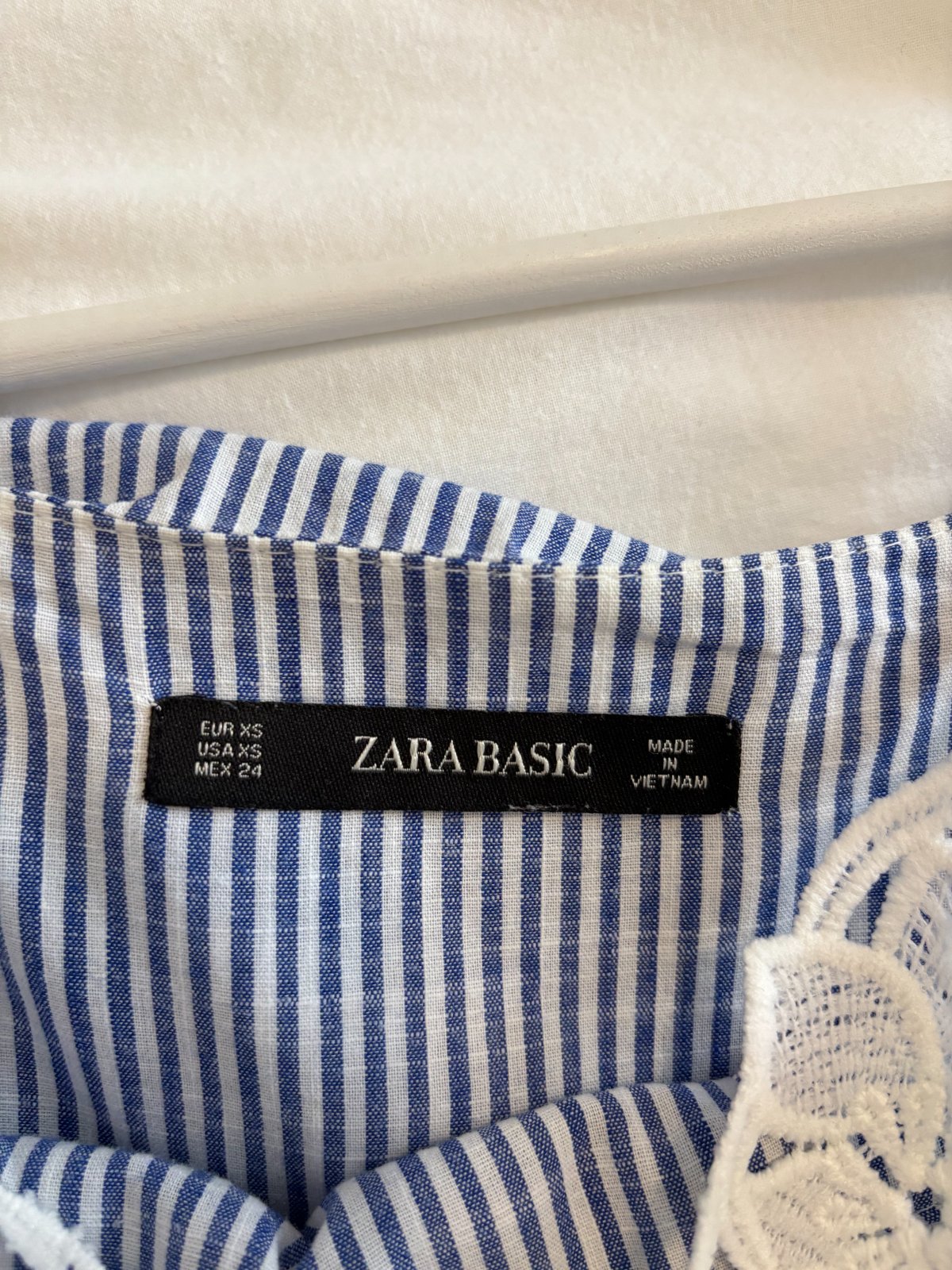 Volánové bielo-modré tielko značky Zara s krajkou, veľkosti XS. Tielko je bez akýchkoľvek poškodení. Osobný odber je možný v BA a NR.