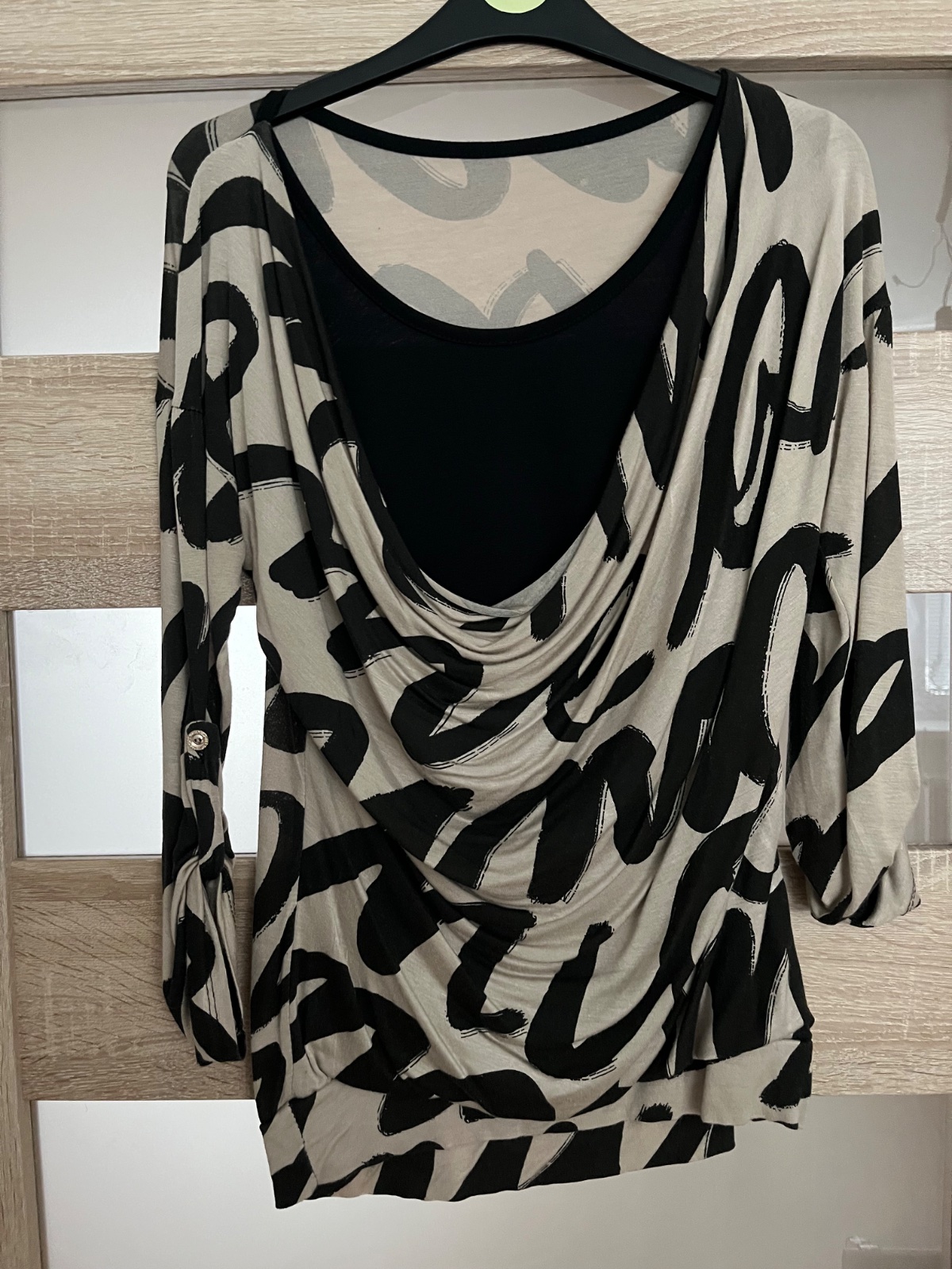 Predam krasny svetrik alebo top,s 3/4 rukavom na zapinanie na gombik,svetrik bol minimalne noseny.Je volnejsi,aj spodna cast.Nosi sa na jedno rameno,velkost pisana M,no sedi aj na L.