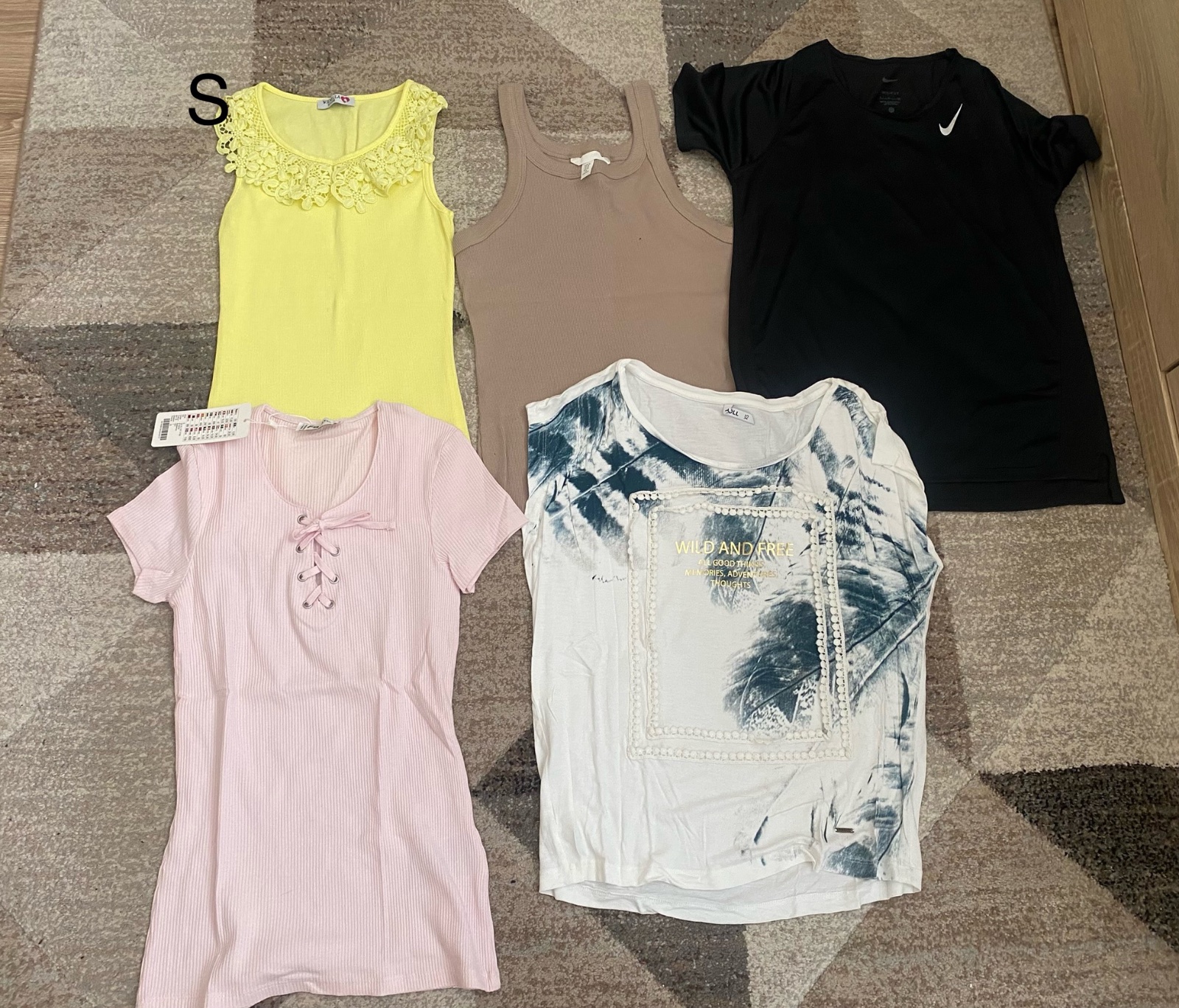 tricka veľkosť S, jedno napravo dole je XS ale je skôr S. Všetko v dobrom stave asi 1x oblečené , ruzove nenosené . Predaj a cena spolu