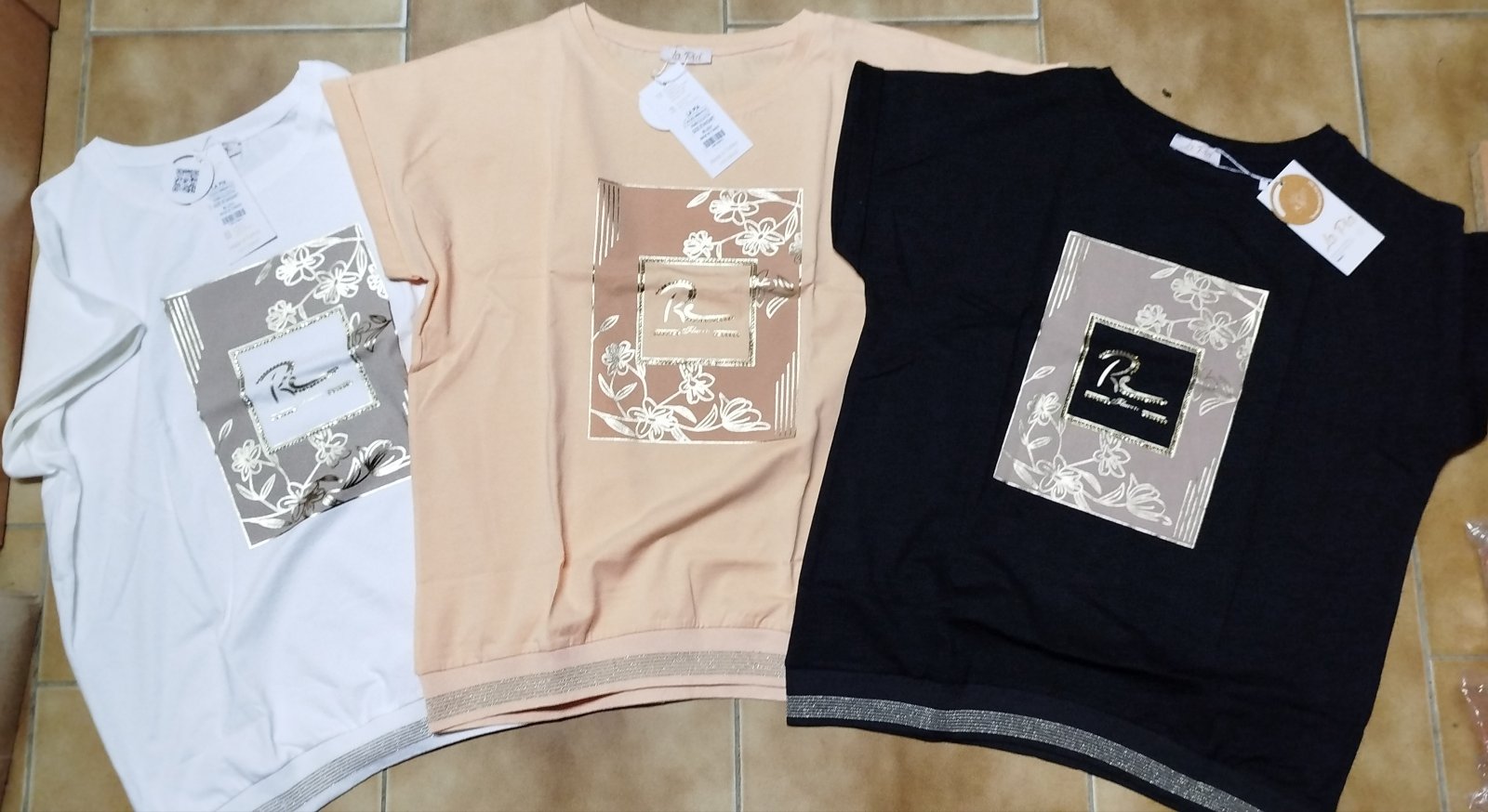 SkladomModerné dámske tričko, klasický strih s modernou aplikáciou.