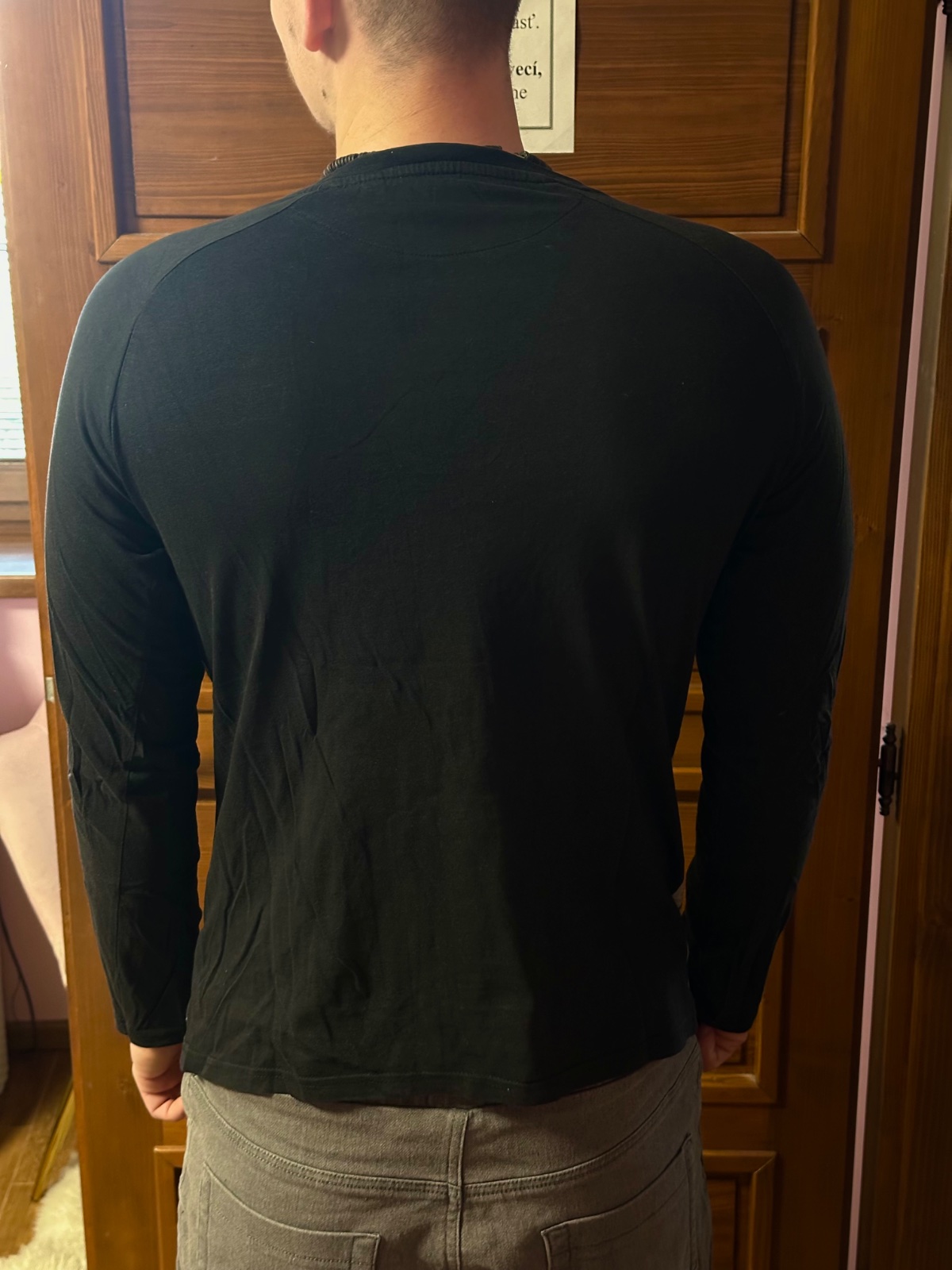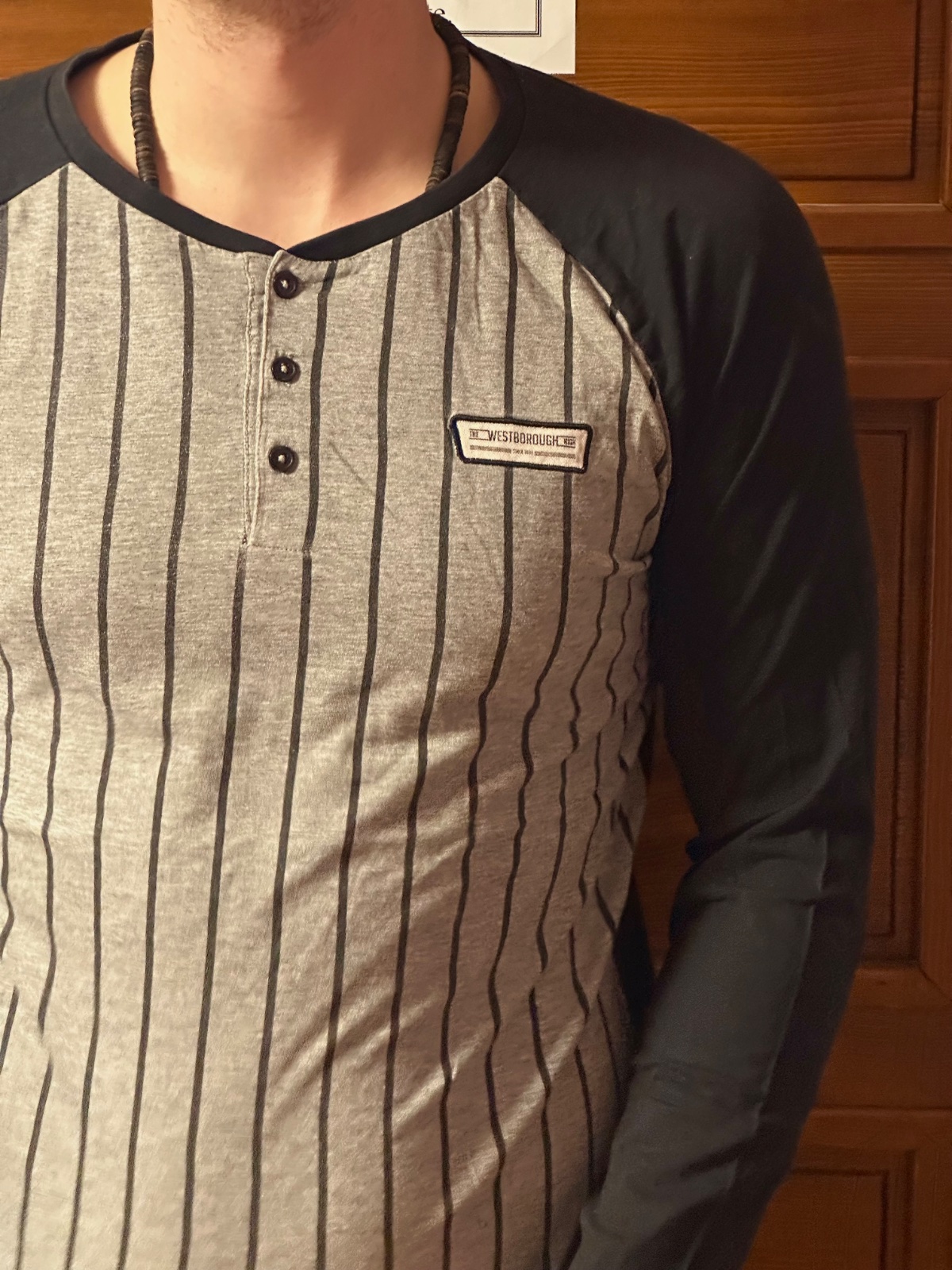 Pánske tričko s dlhým rukávom, veľkosť M. Moderný strih s pruhovaným predným dielom v sivom odtieni a čiernymi rukávmi a chrbtom. Tričko má zapínanie na tri gombíky pri krku a decentný nápis na hrudi. Materiál je príjemný na nosenie, vhodný na bežný deň aj voľný čas. 90%bavlna. Stav je veľmi dobrý, bez nejakých vážnych poškodení. Na dotyk je pohodlné a pružné.