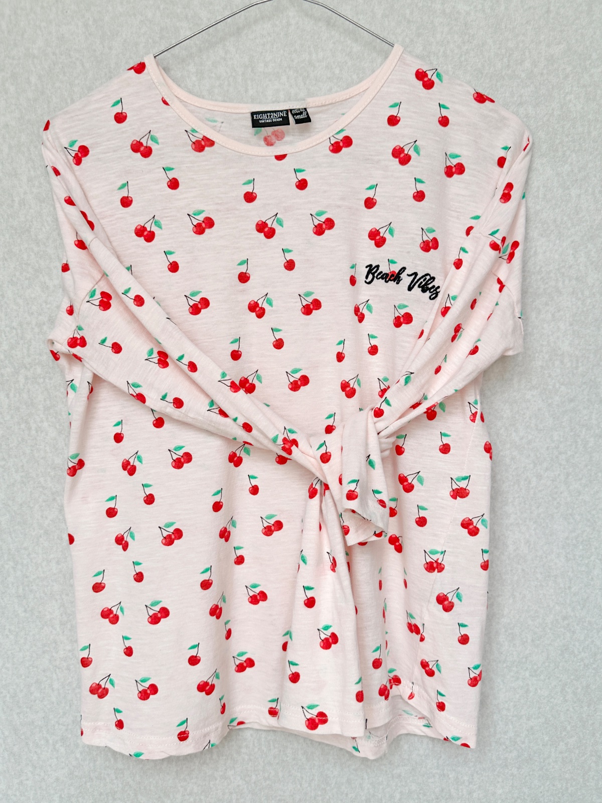 Vzdušné bavlnené tričko v jemnej ružovej farbe na pozadí červených čerešní. Značka Eight2nine. Minimálne použitie, v super stave, bez poškodení. 100% bavlna. Pranie v pračke 30°C.