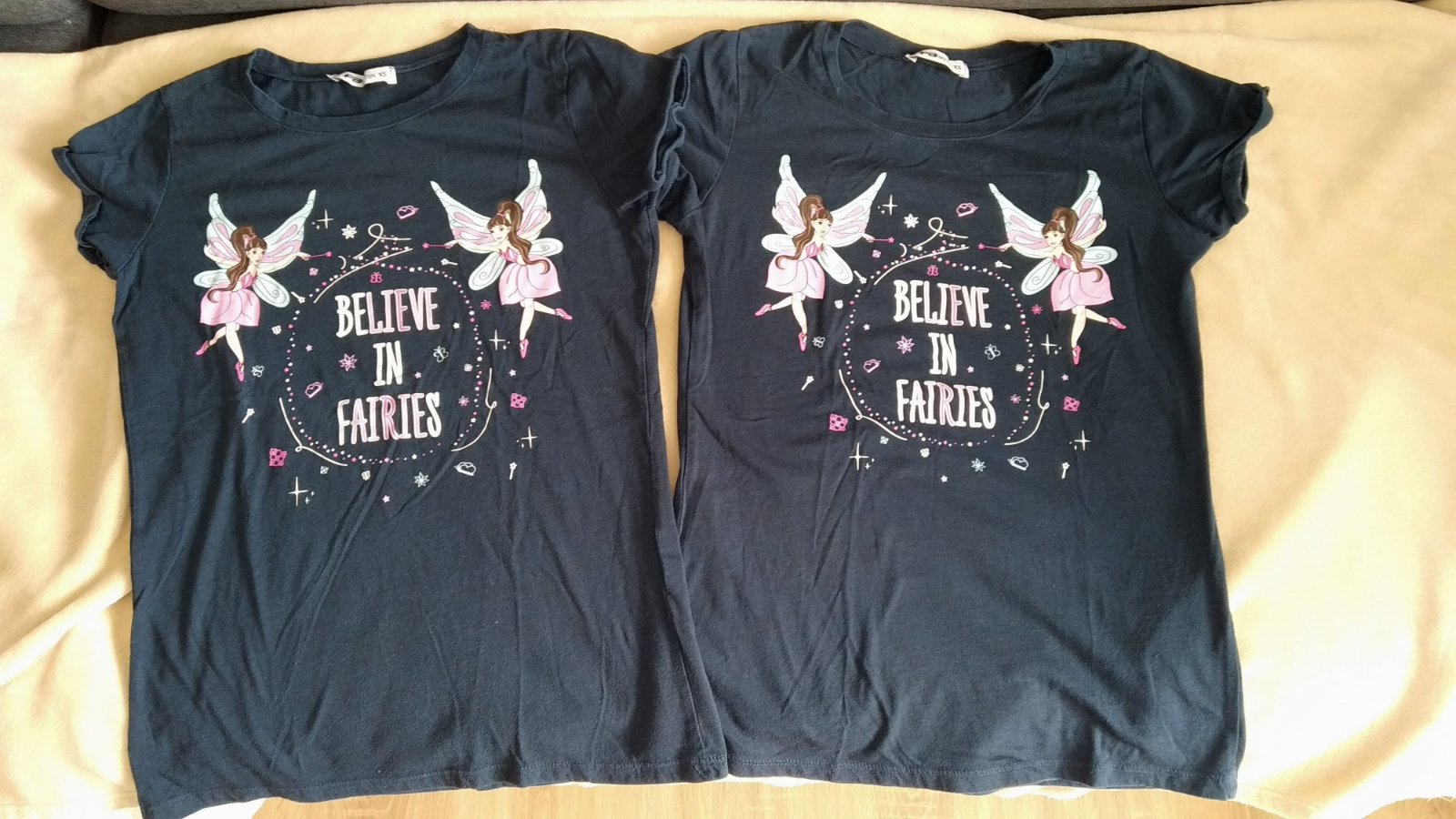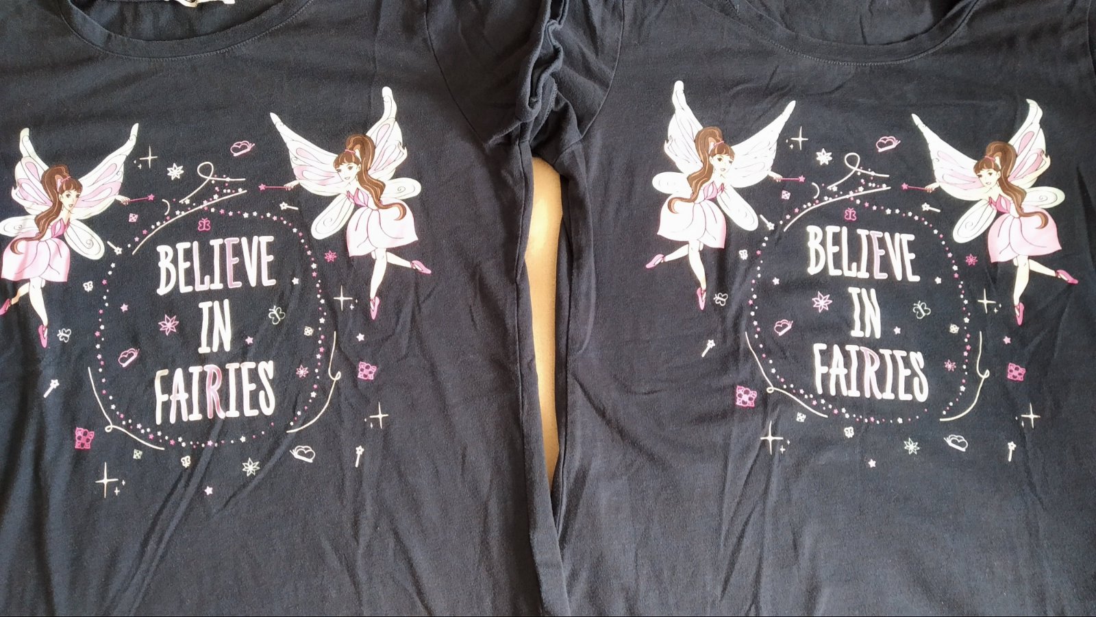 Dve tmavomodré tričká s obrázkom víl.