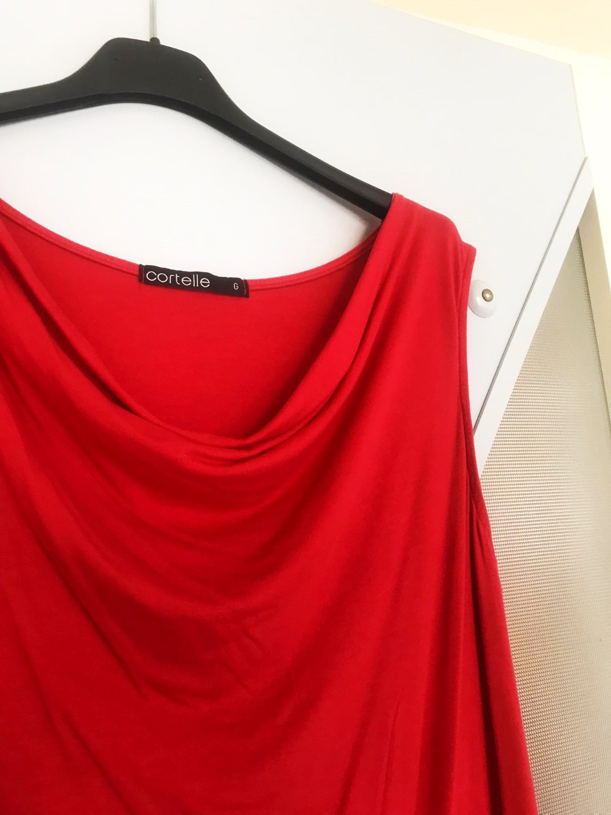 kvalitné padavé zaujímavé triko,pekne riešený výstrih,výrazná ostrá červeno - ružová farba,dlžka celkom = 65 cm,šírka pod pazuchou = 53 x 2 cm,ako nové v top stave