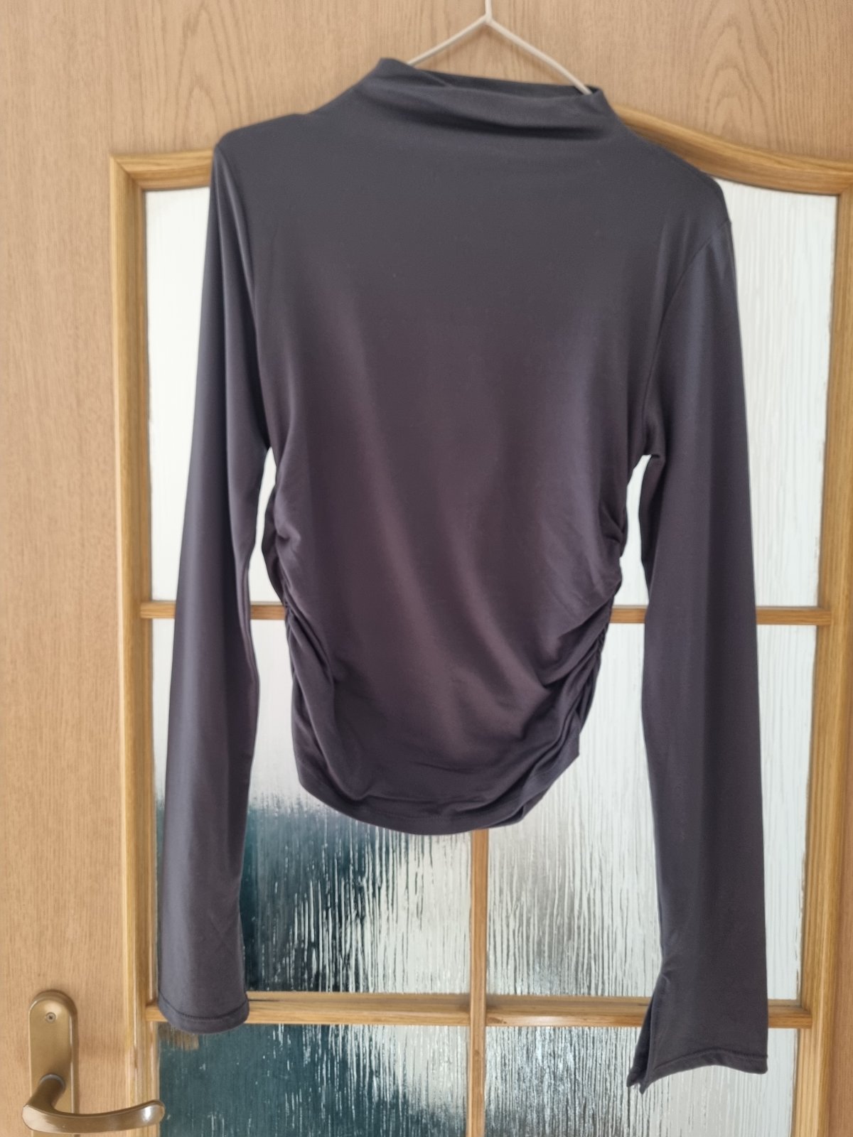 Predam zaujímavý top tmavosedy po bokoch riešenie rukávy dlhšie s prestrihom a stojacikom. Bol raz oblečeny na chvíľu