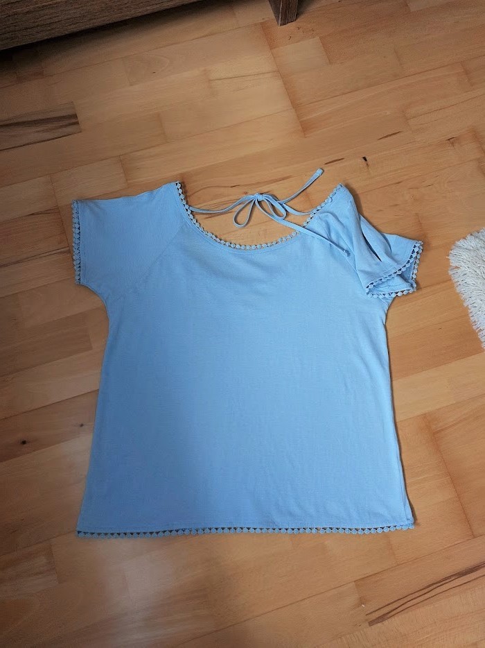 Vzadu vacsi vystrih s viazackou, mierne odhalene ramena /vid fotky/, ozdobne lemovanie.