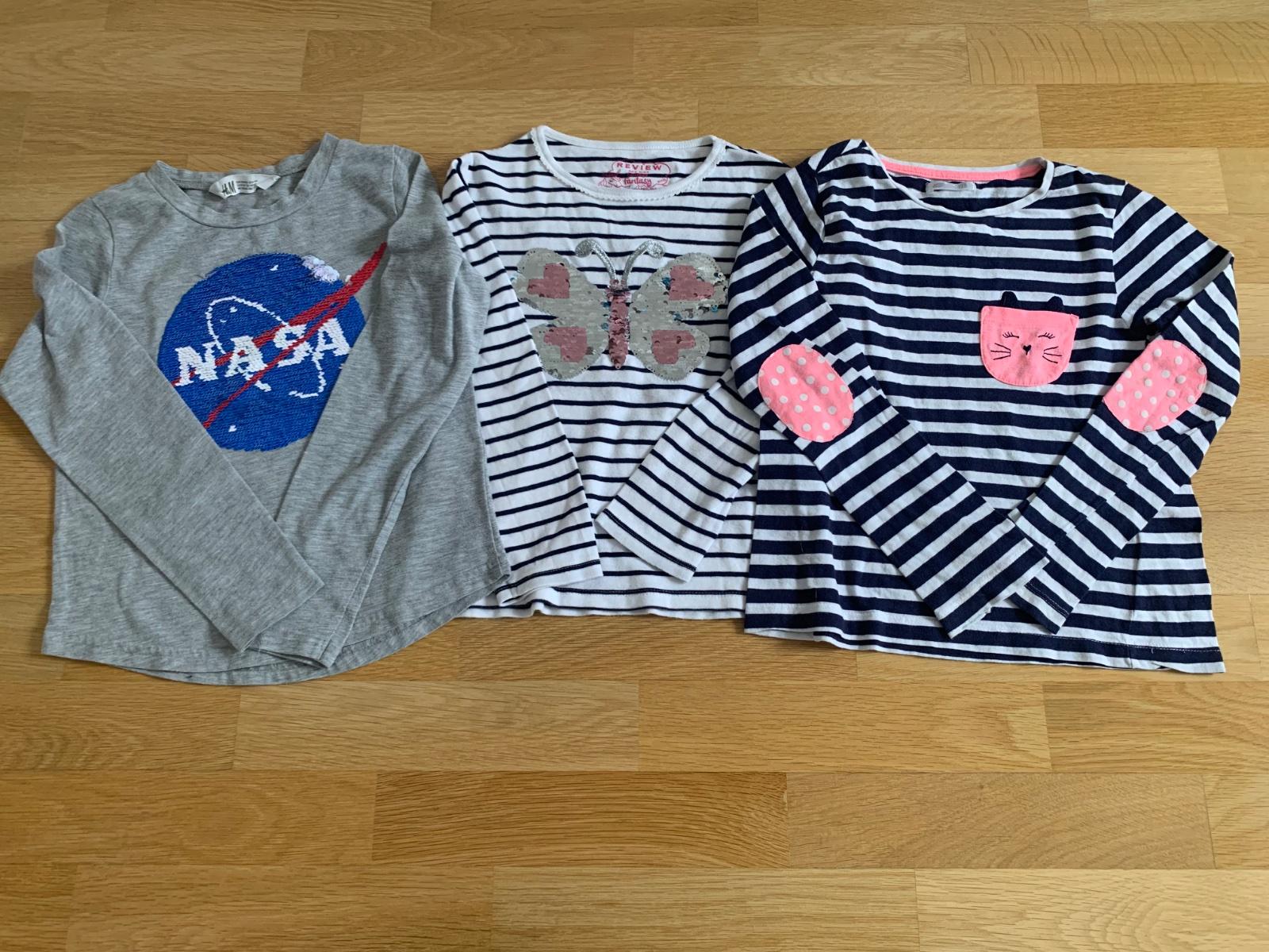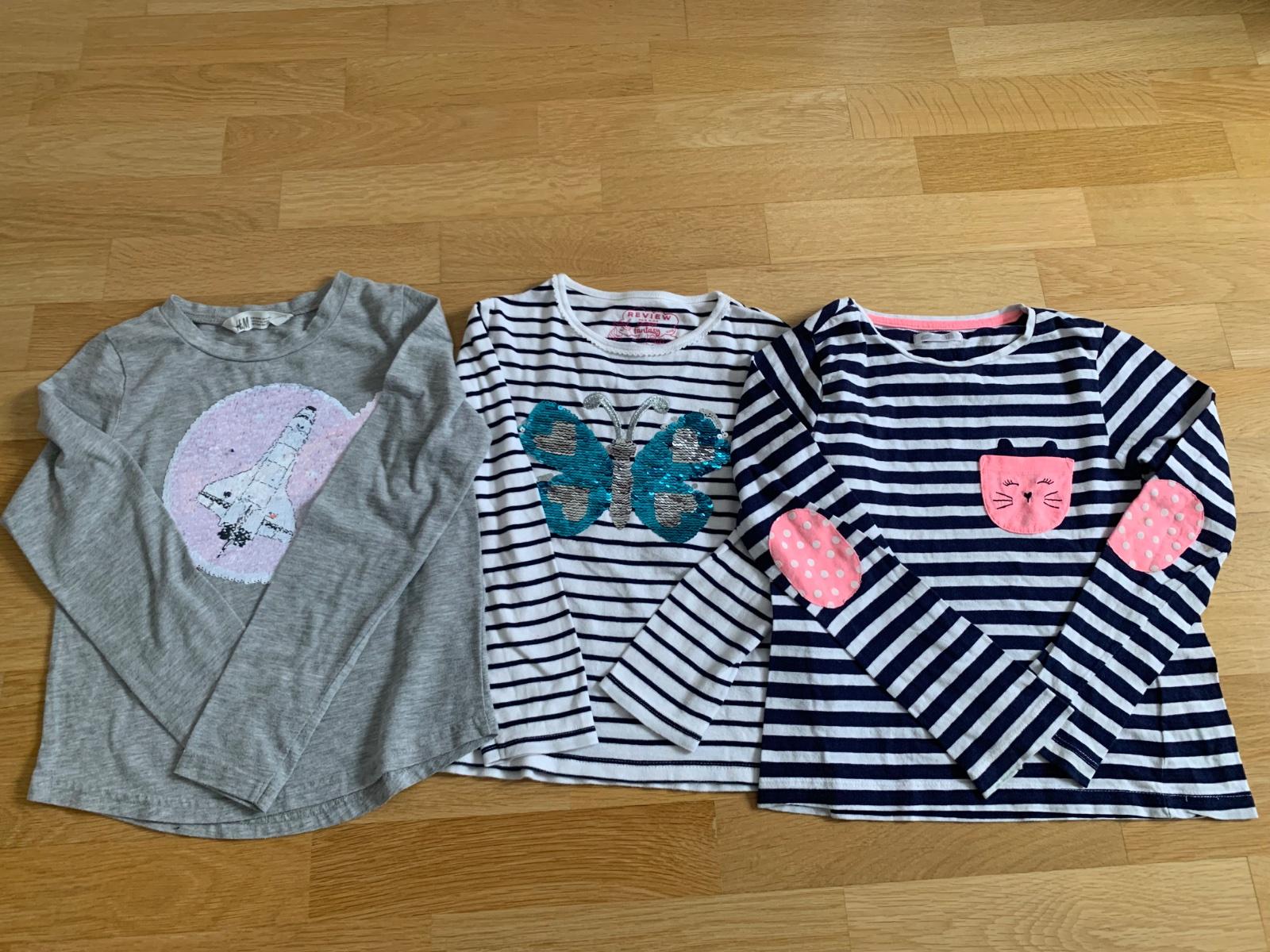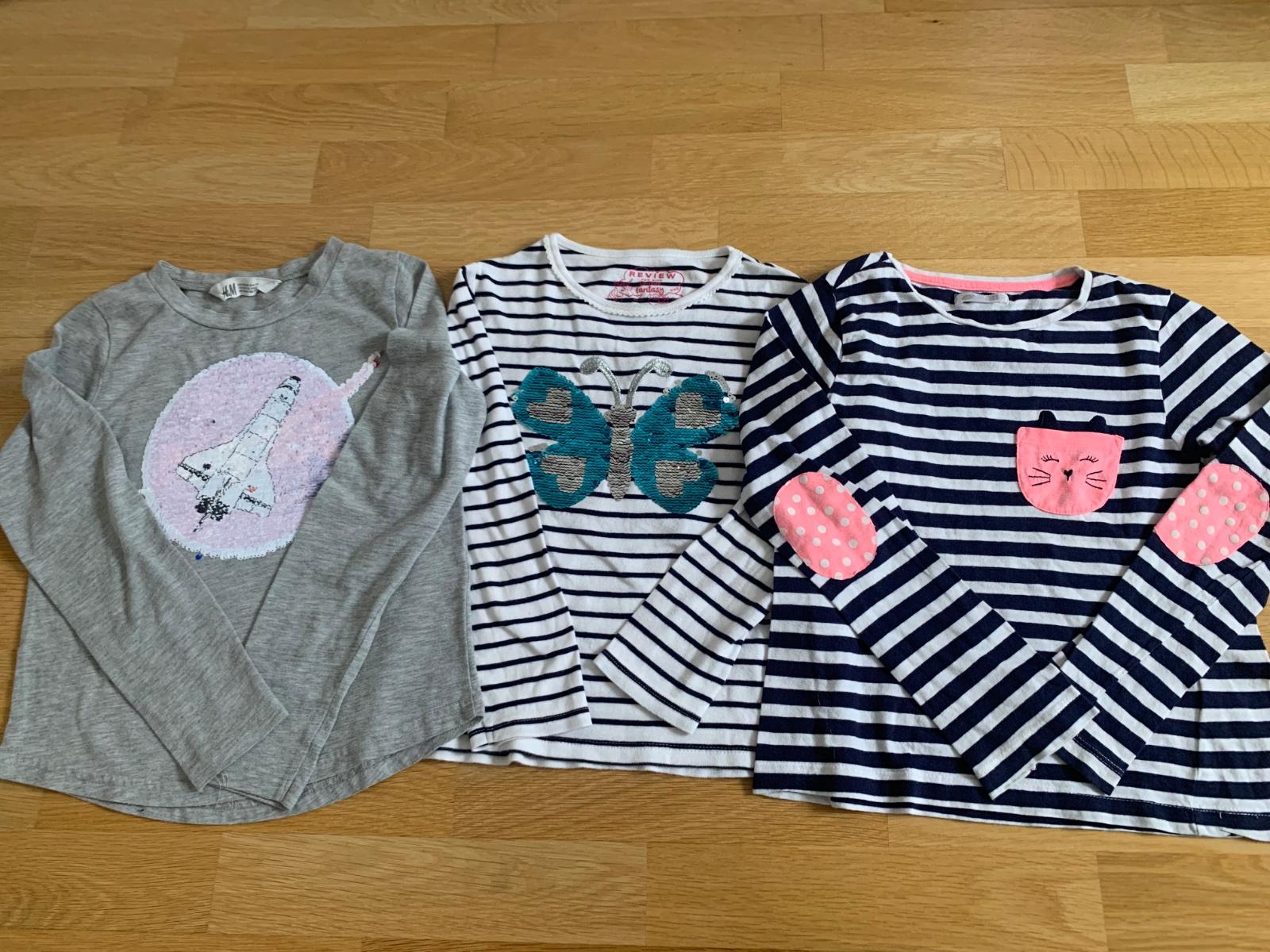 Pekne tricko s meniacimi flitrami - s meniacim motylikom na. 8-9.rokov, pridavam este jedno tricko H&M s meniacimi flitrami na 8-10.rokov a gratis pasikave s macickou z Pepco. Pekny noseny stav viď.fotky.