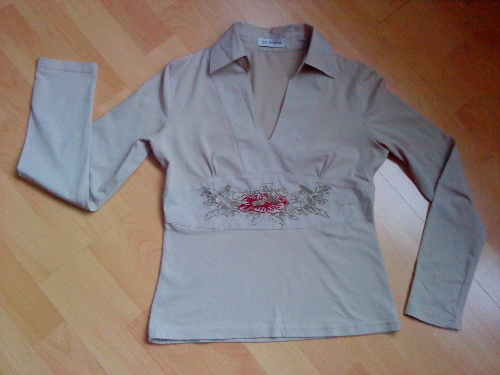 Materiál elastická tričkovina, len golier, výstrih a ozdobný pás sú z tenkého plátenka-neelastického. .Dlžka chrbta 55 cm, šírka v podpazuší 43 cm, plece 12 cm, rukáv 58 cm.poštovné podla váhy