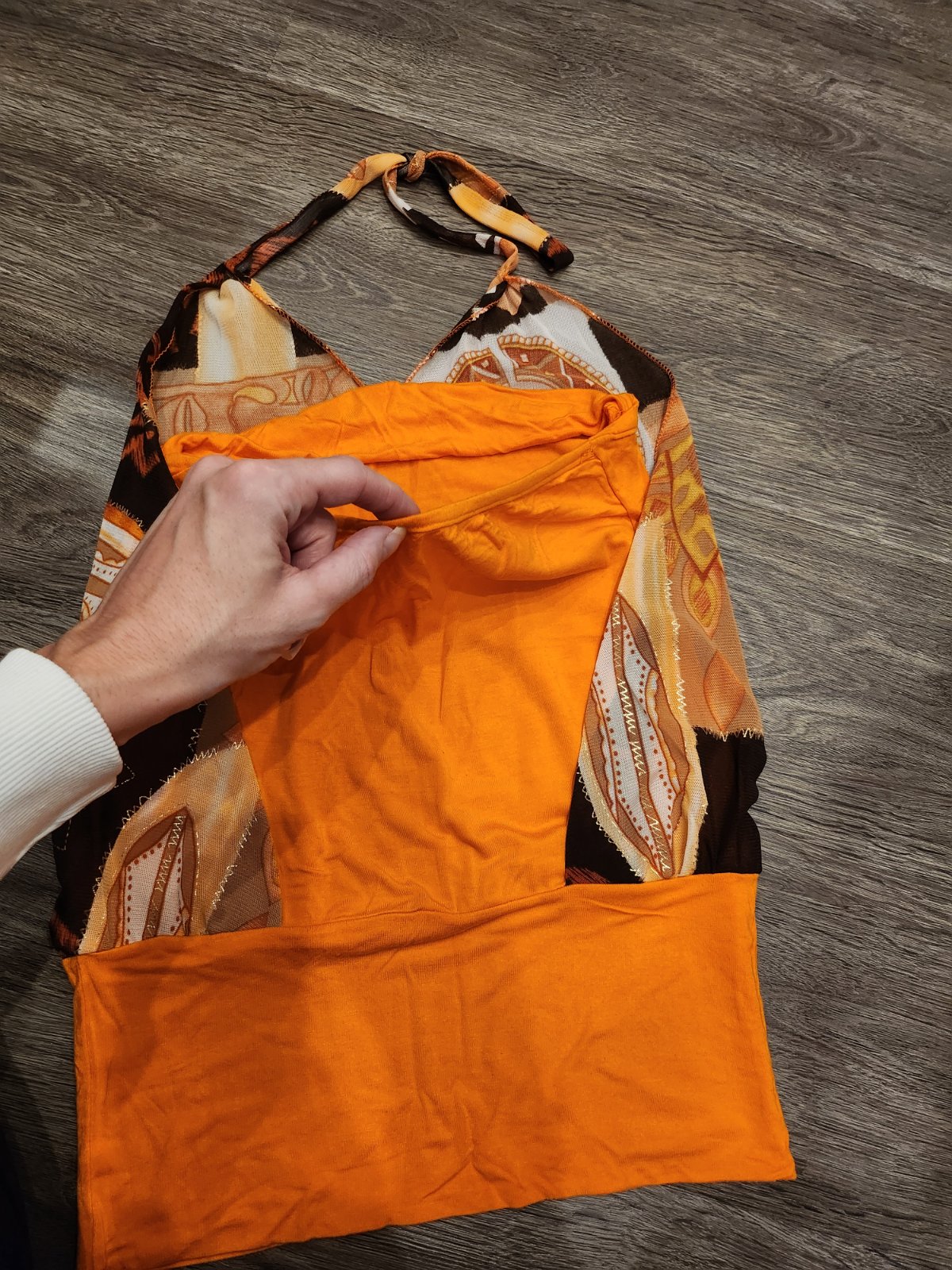Oranzova cast je akoby korzetova bez ramienok a sietkovana cast je okolo krku.
