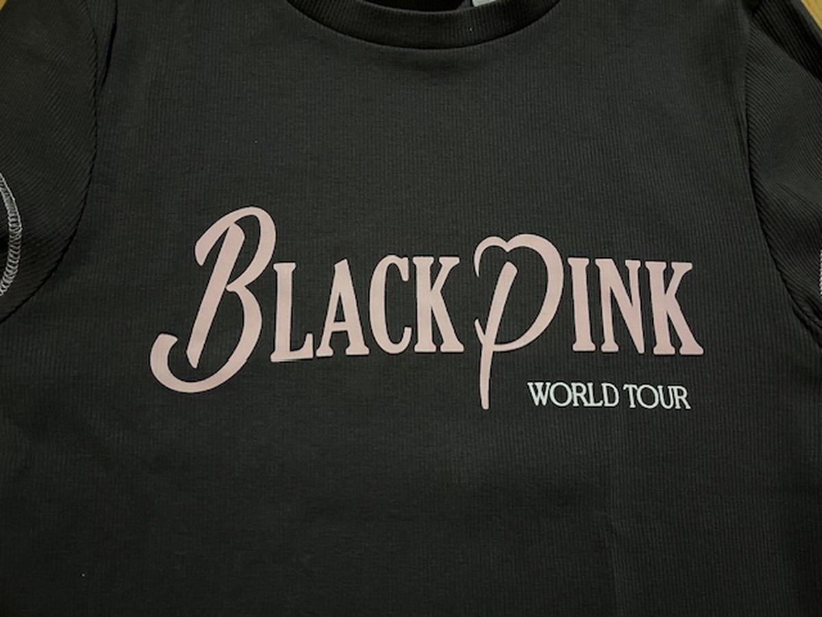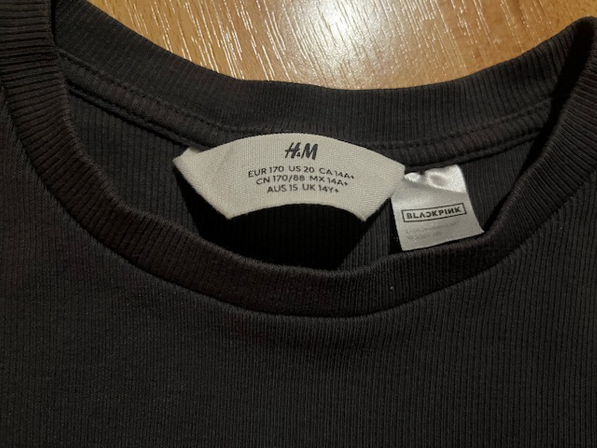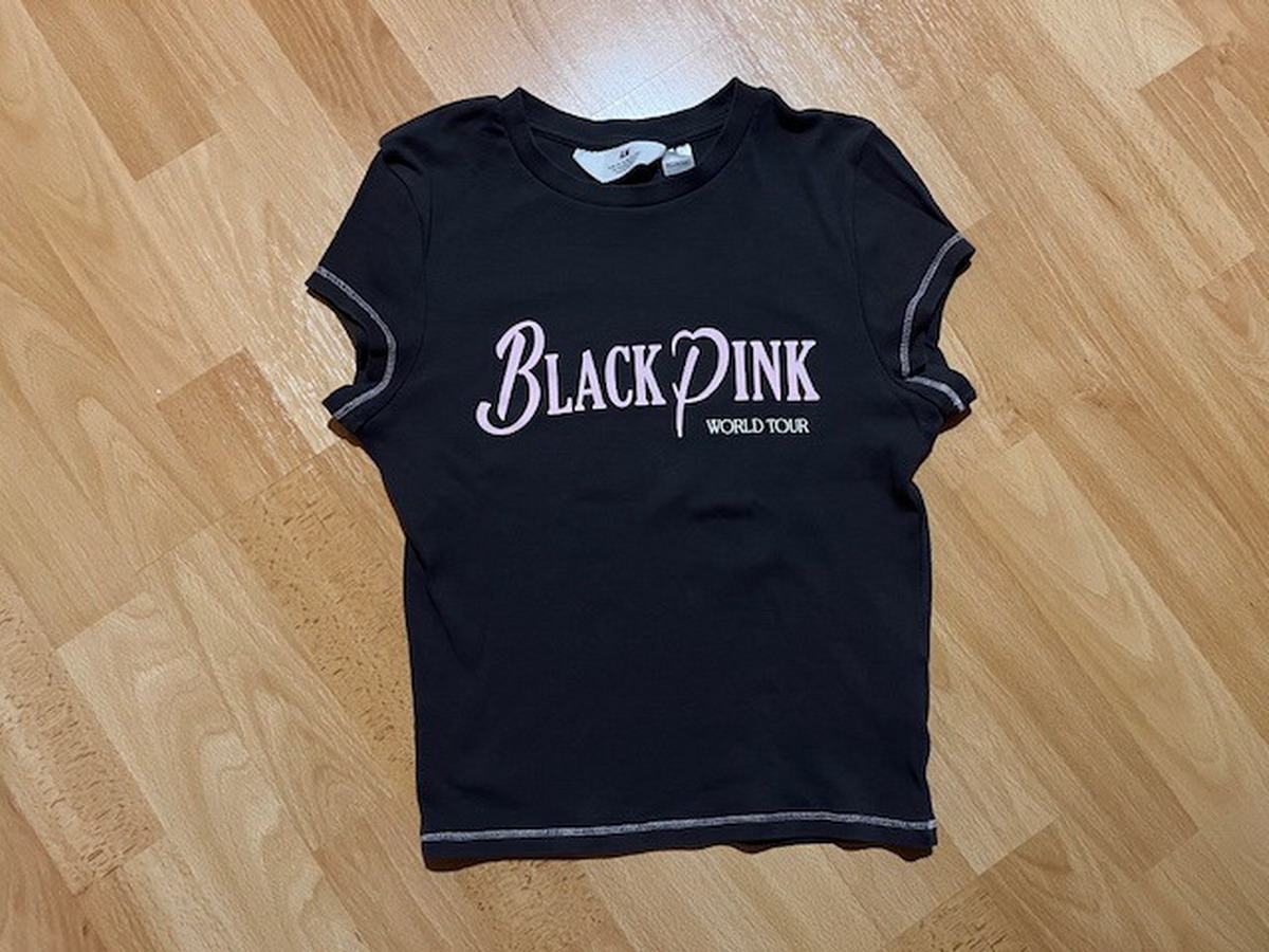 Kratšie vrúbkované tričko s potlačou K-popovej dievčenskej skupiny Blackpink, značka H&M, veľkosť je uvedená 170, materiál: 95% bavlna, 5% elastan