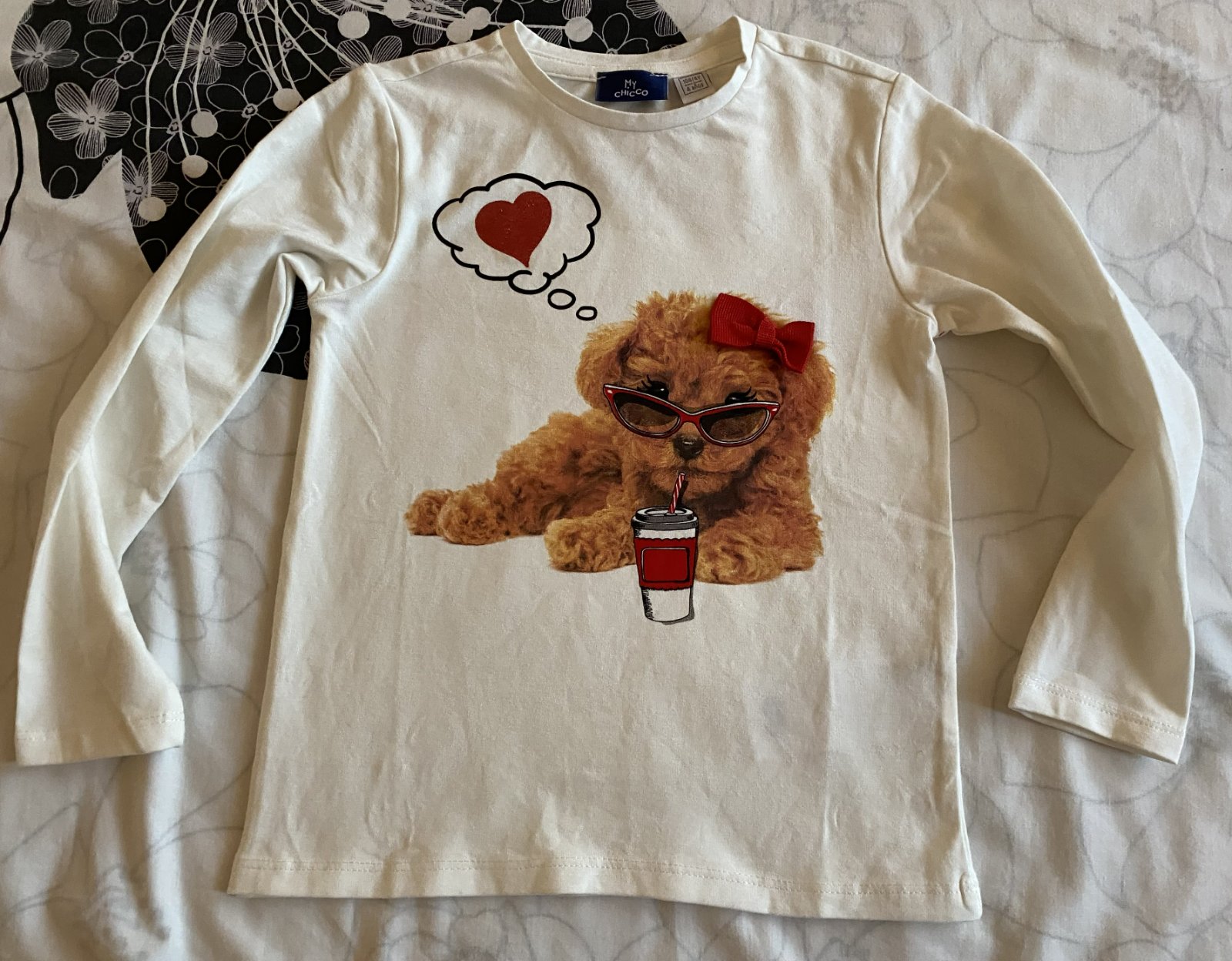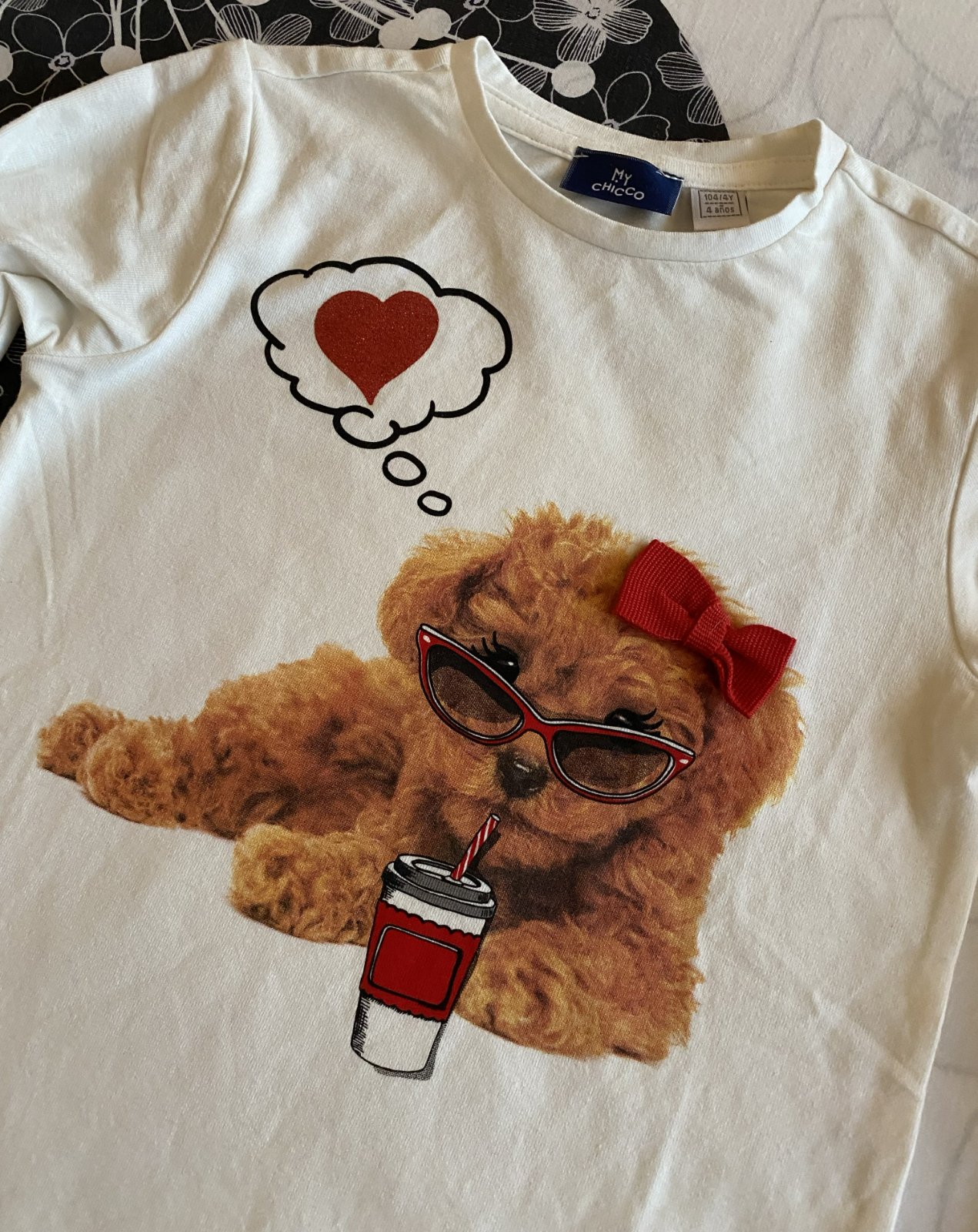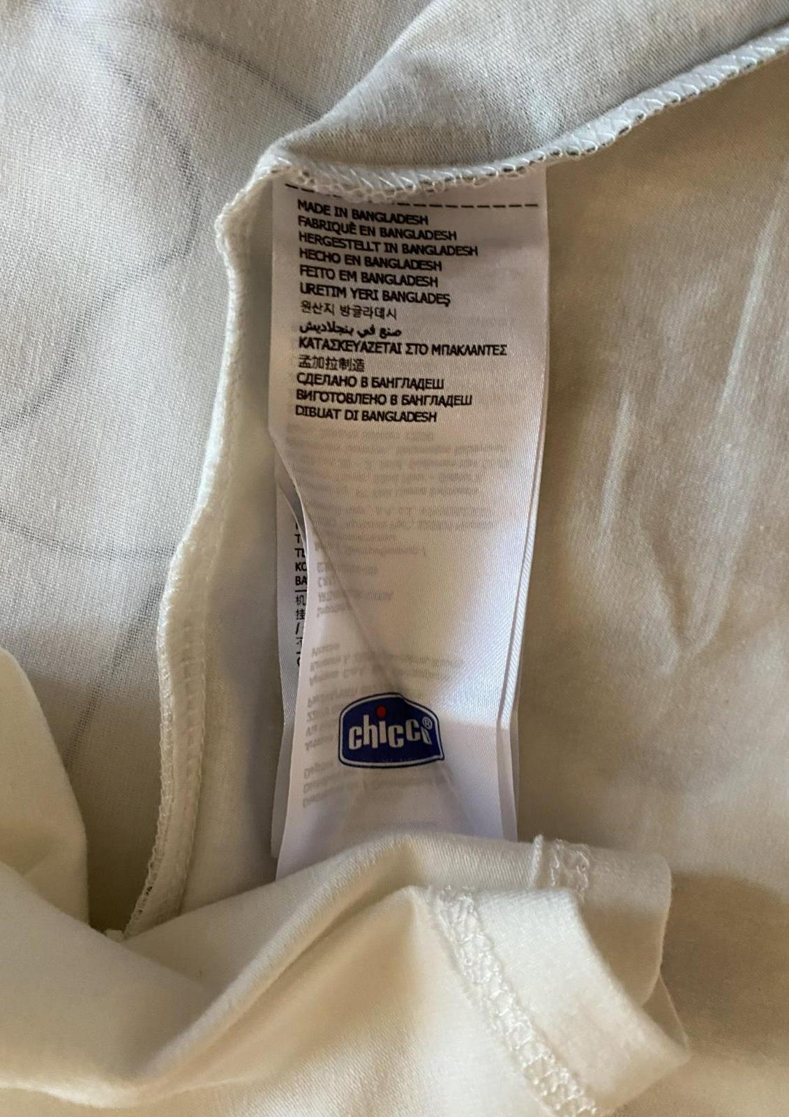Nenosené tričko Chicco s potlačou v. 104, materiál 95% bavlna, 5% elastan - je pružné, všade povolí. Miery: dĺžka od krku dolu: 40cm, šírka: 29cmx2, rukáv od ramena: 36cm +8cm plece ku krku vrátane lemu okolo krku.