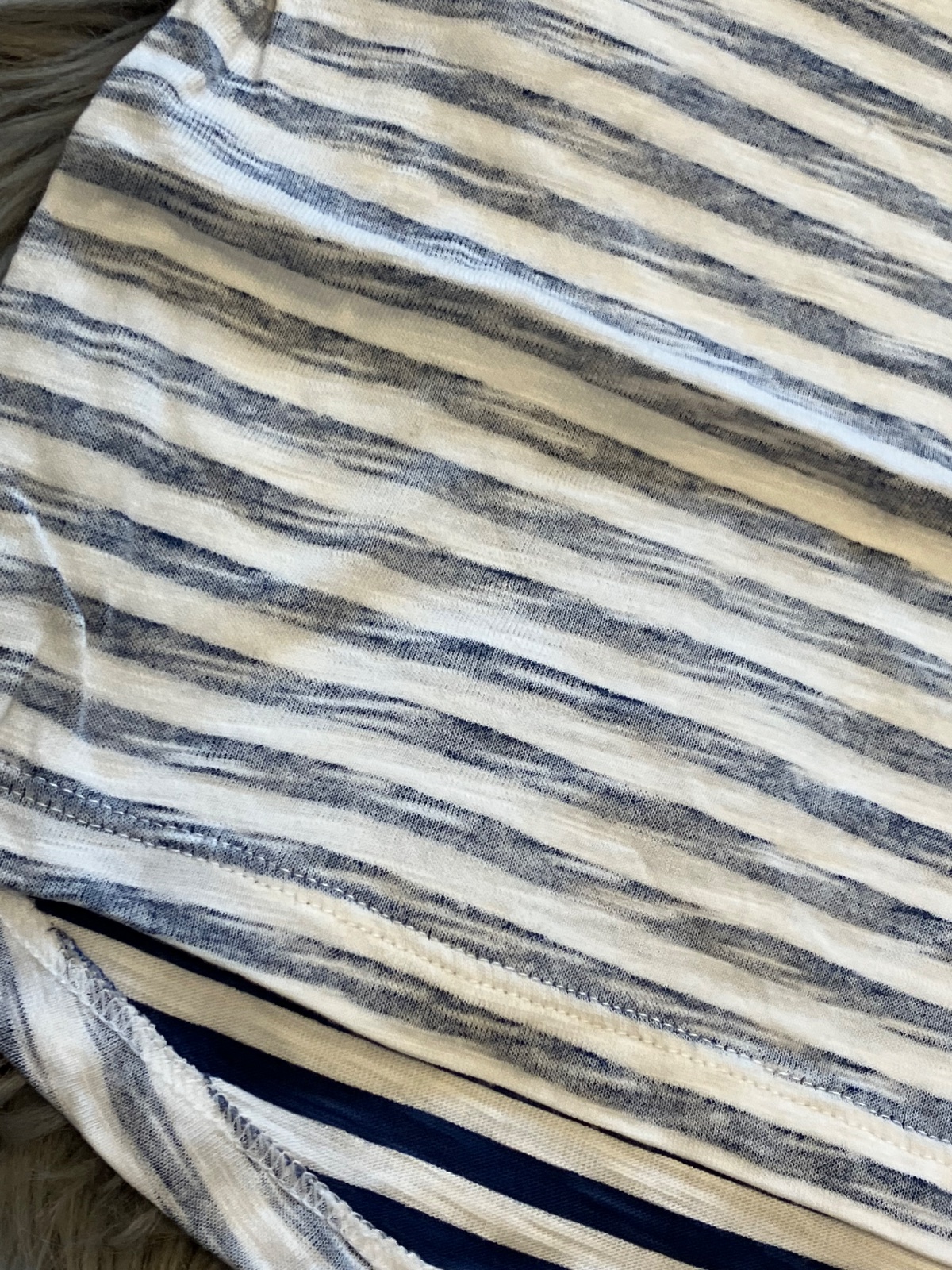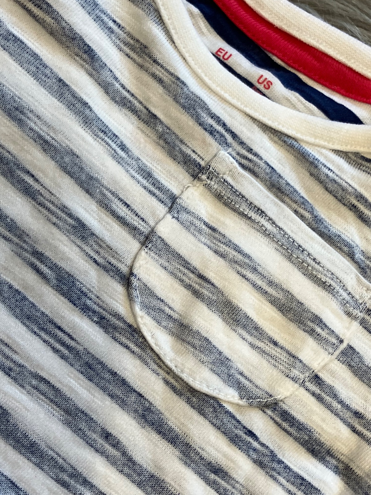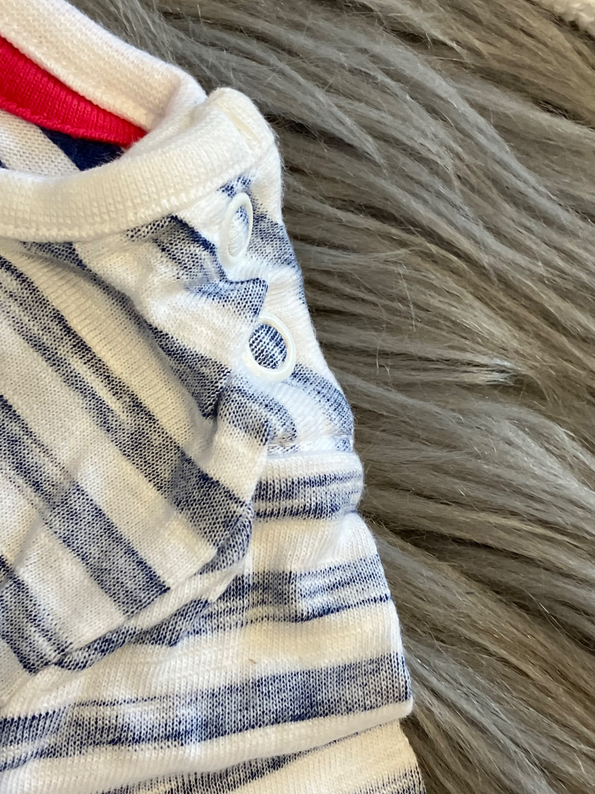 Chlapčenské tričko s krátkym rukávom, pásikavé, tmavomodro biele, jedno vrecko na hrudi, zapínanie na ramene na dve cvoky, elastické, materiál 100%bavlna.