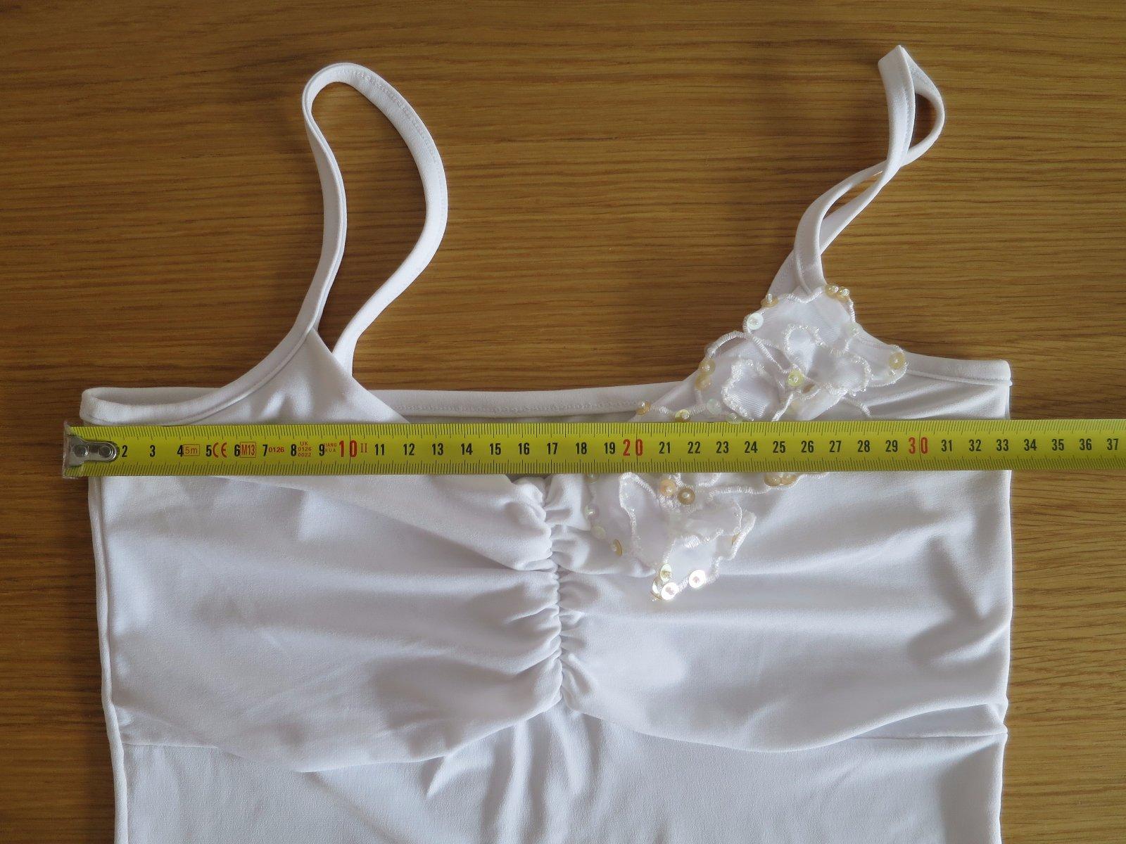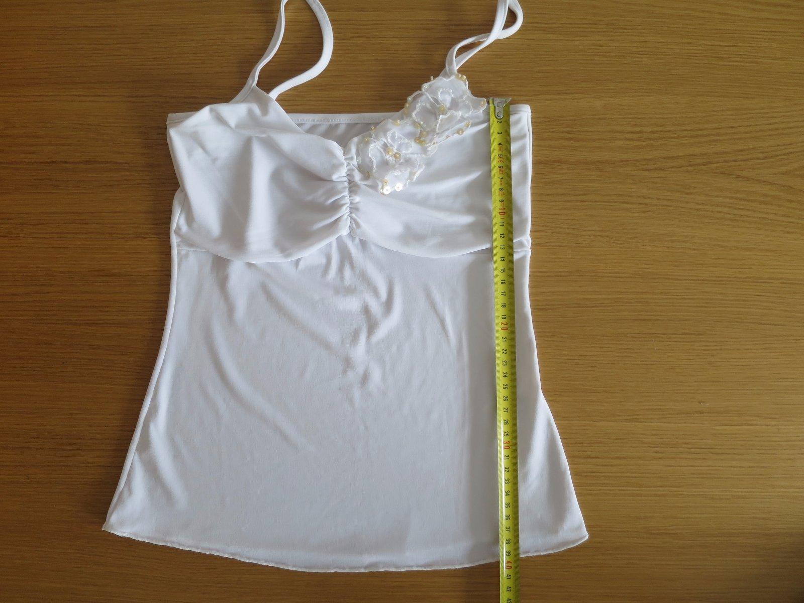 Damska ci dievcenska bluzka na ramienka. Elegantne, hodi sa pod kostymcek, ci mozu byt aj sportove k rifliam ci k sukni. Rozmery v foto, tak na v. 36-38. Krasne sa prisposoby postave, 8% elastan. Riasene na prsiach, viac vrstiev, a krasne ozdobne kvetinky s flitrami zlate a biele koralky. Krasny detail.
