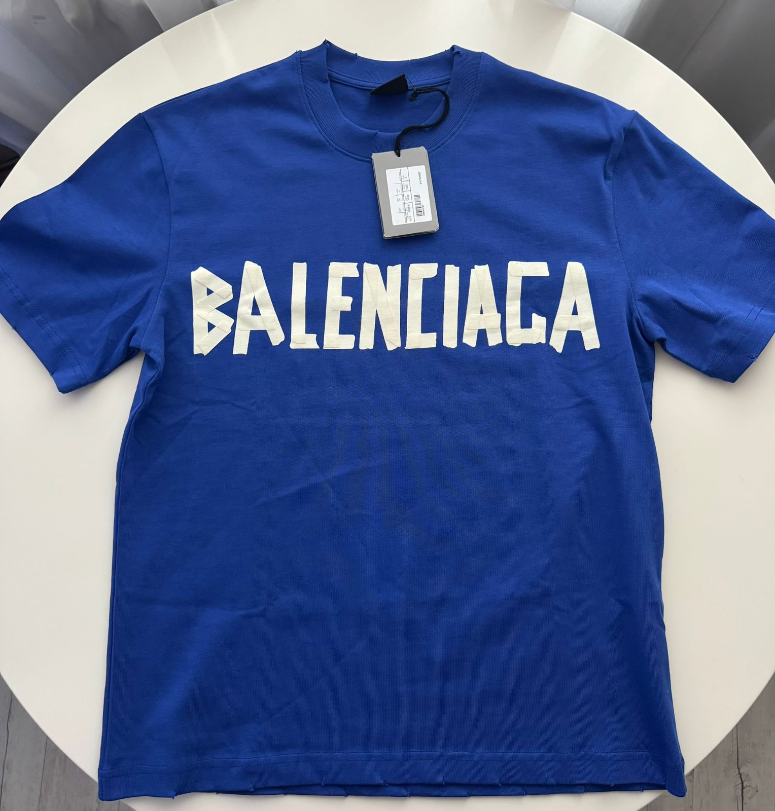 Panske tricko Balenciaga uplne nove, modrej farby vpredu s bielym napisom a zo zadnej stranz zltym/zlatym napisom.