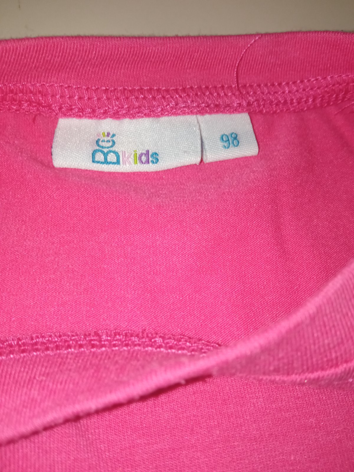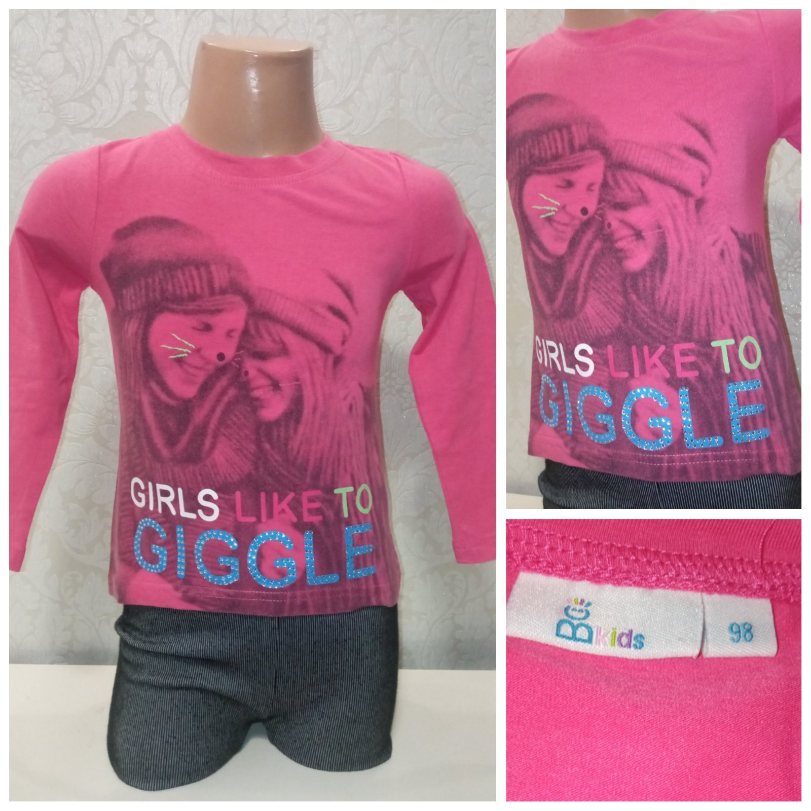 Dievčenské tmavoružové tričko s dlhým rukávom, vzor, nápis, kamienky, elastické, okrúhly výstrih, vpredu kratší, vzadu dlhší strih, materiál 65%polyester,30%bavlna,5%elastan.