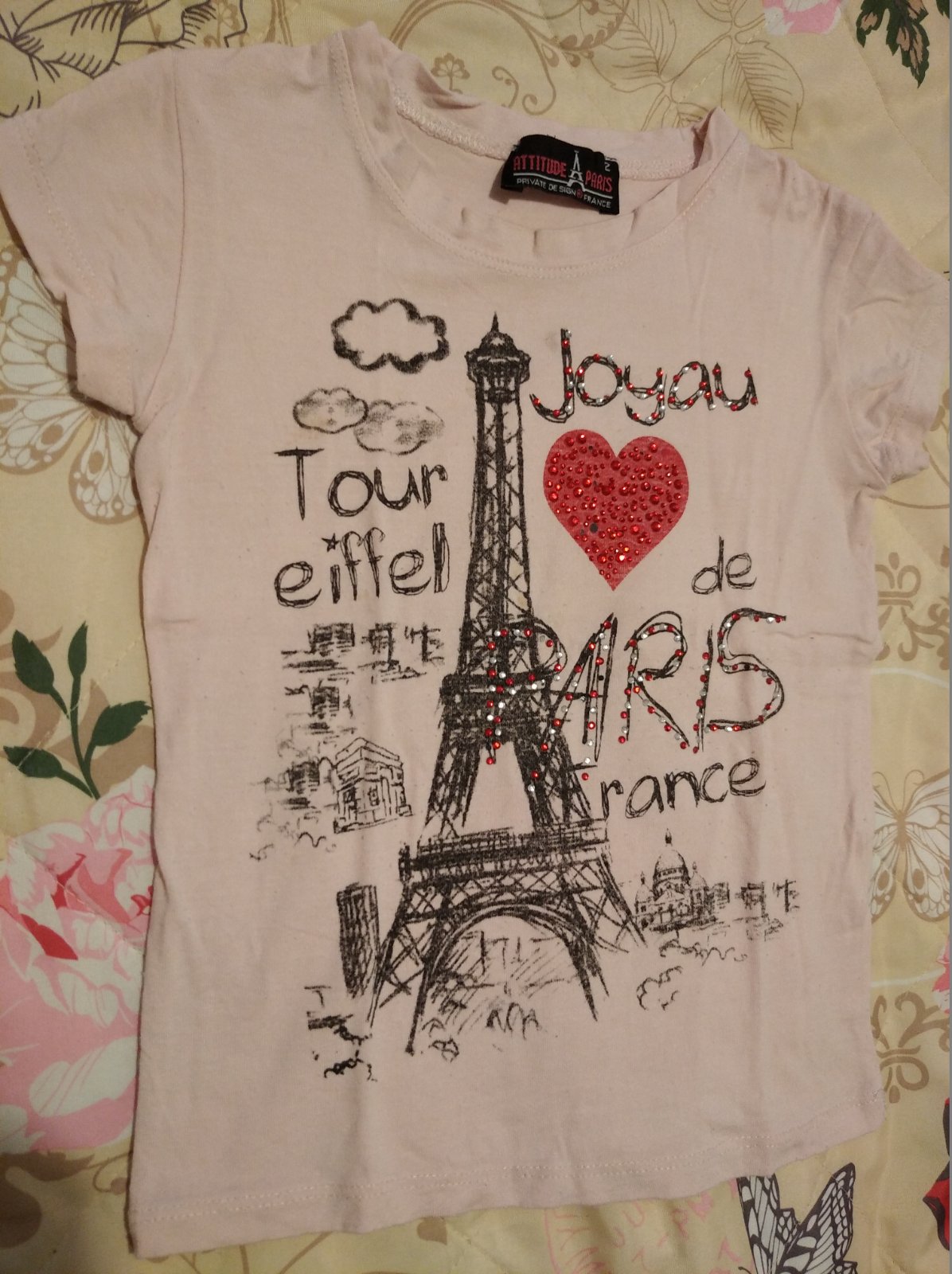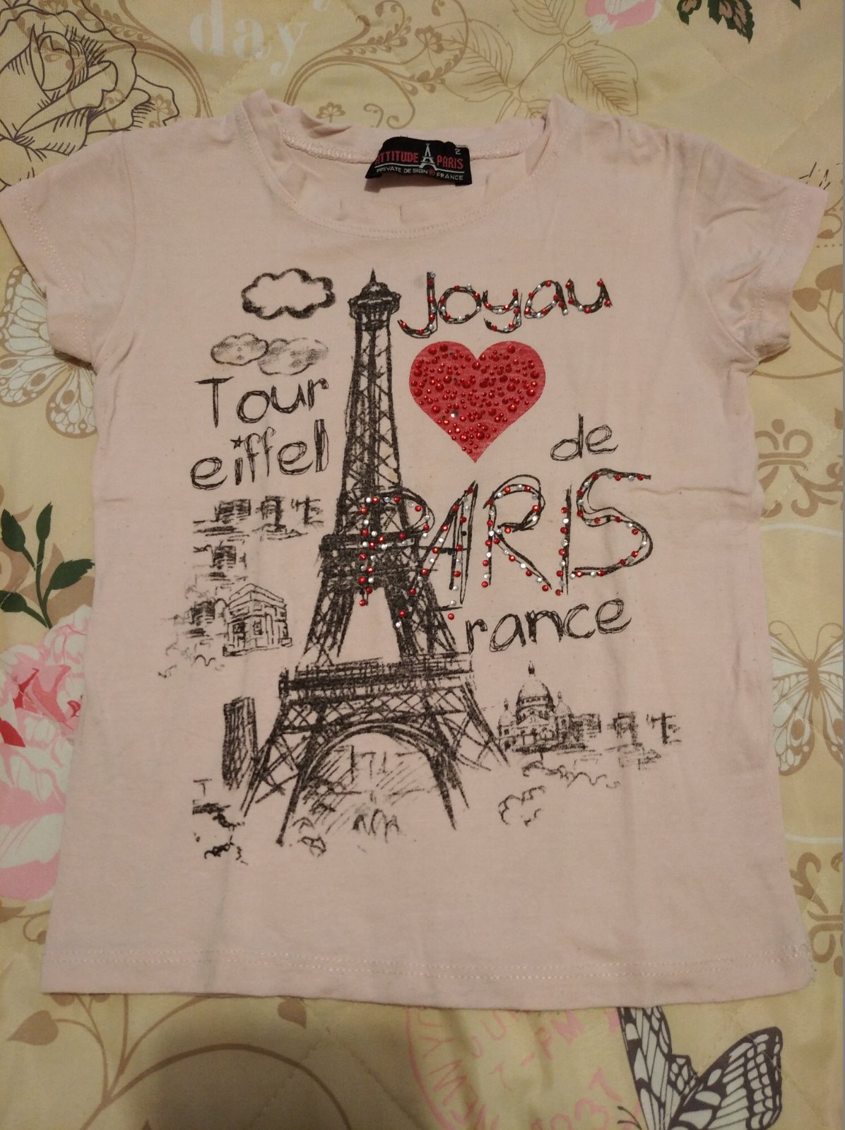 Tricko kupene priamo pod Eiffelovkou, bolo drahsie, uz vidiet nosenie, niekde v strede Eiffelovky je fliacik ktory sa tam ale strati neni ho moc vidno, minizmolceky