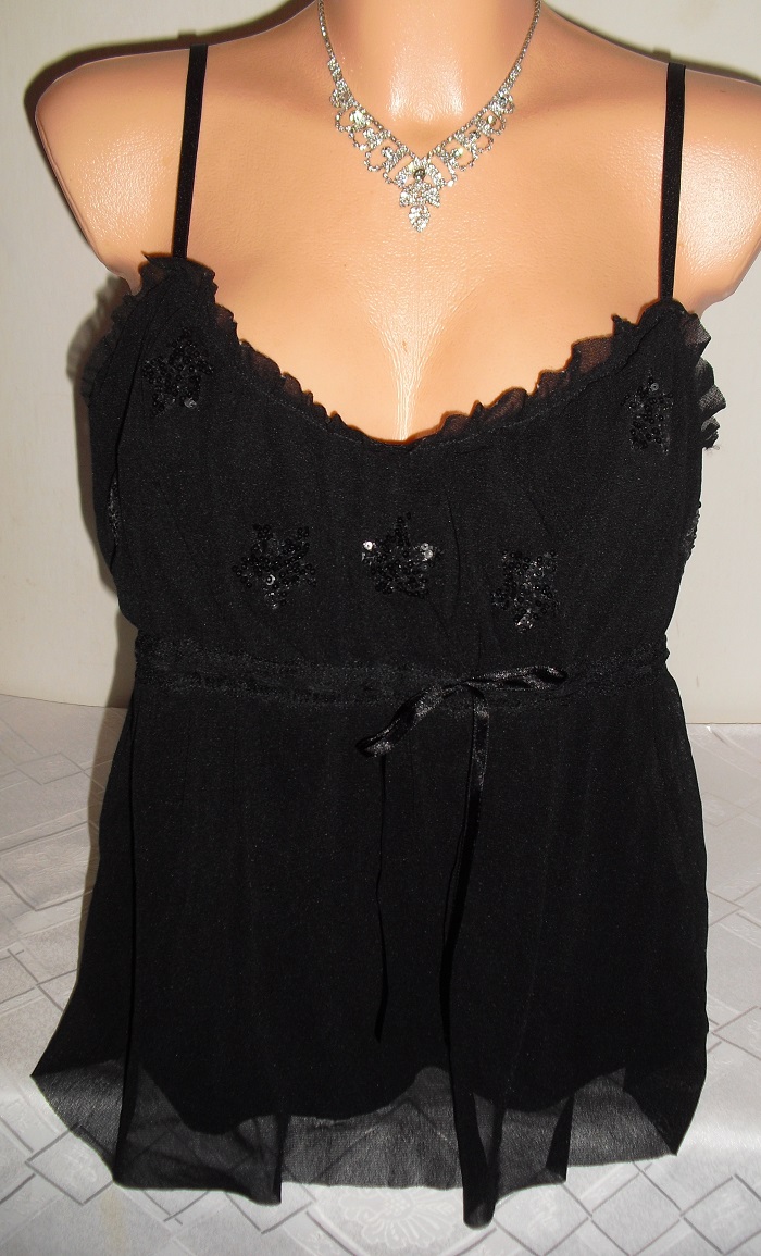 predam nadherny babydoll vecerny elegantny topik, nadhernom vybornom stave, znackovy, zdobeny flitrikmi. velkost uvedena 42, nase vacsie l. sirka pod poprsim 46 cm x 2, dlzka cca 59 cm, ramienka ma posuvatelne.