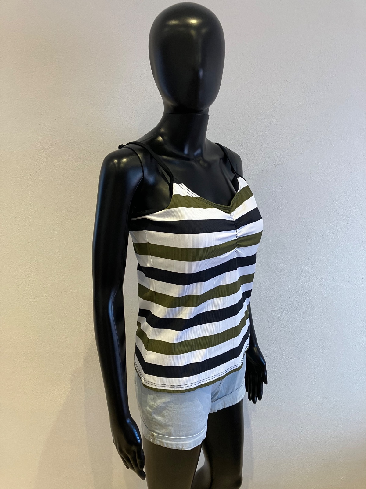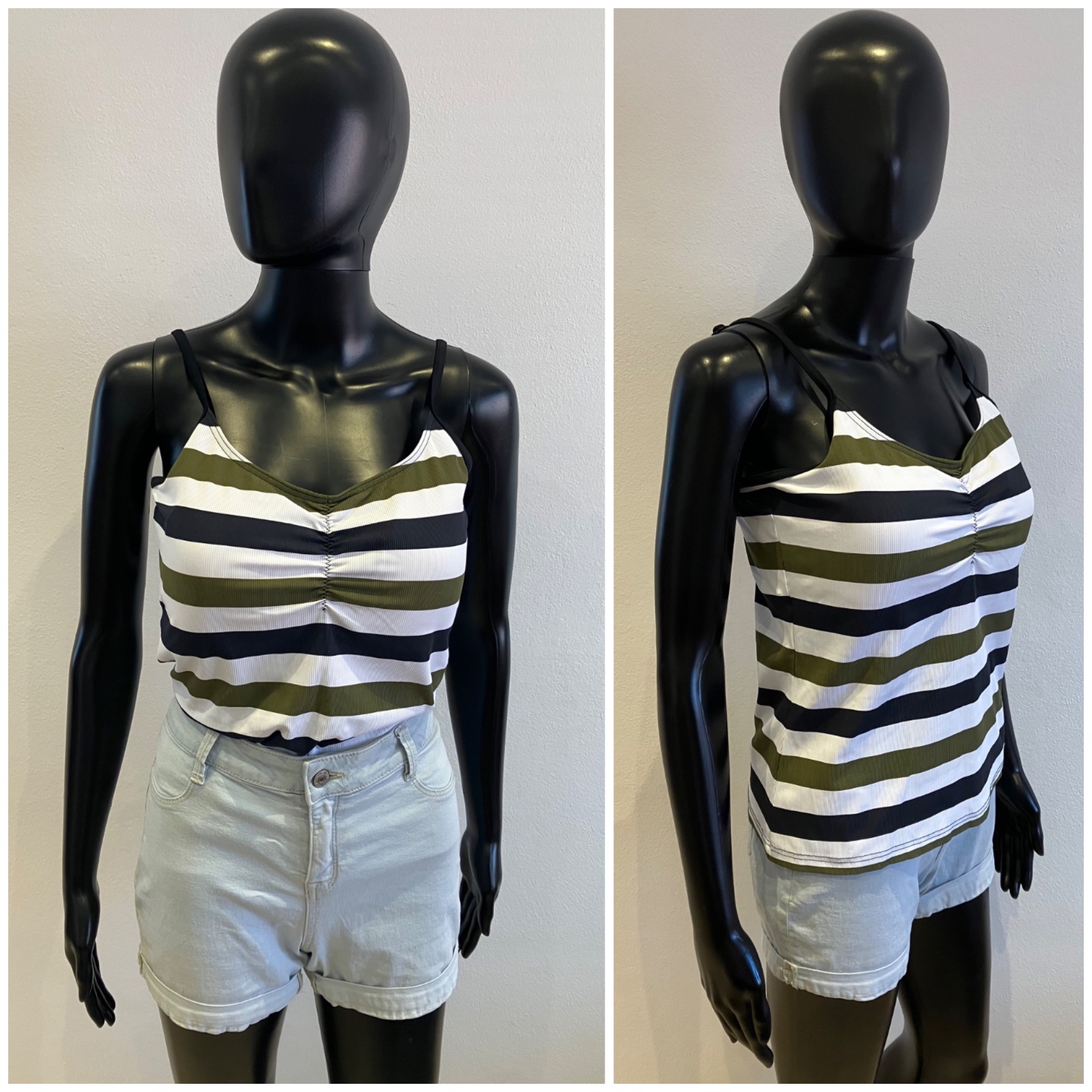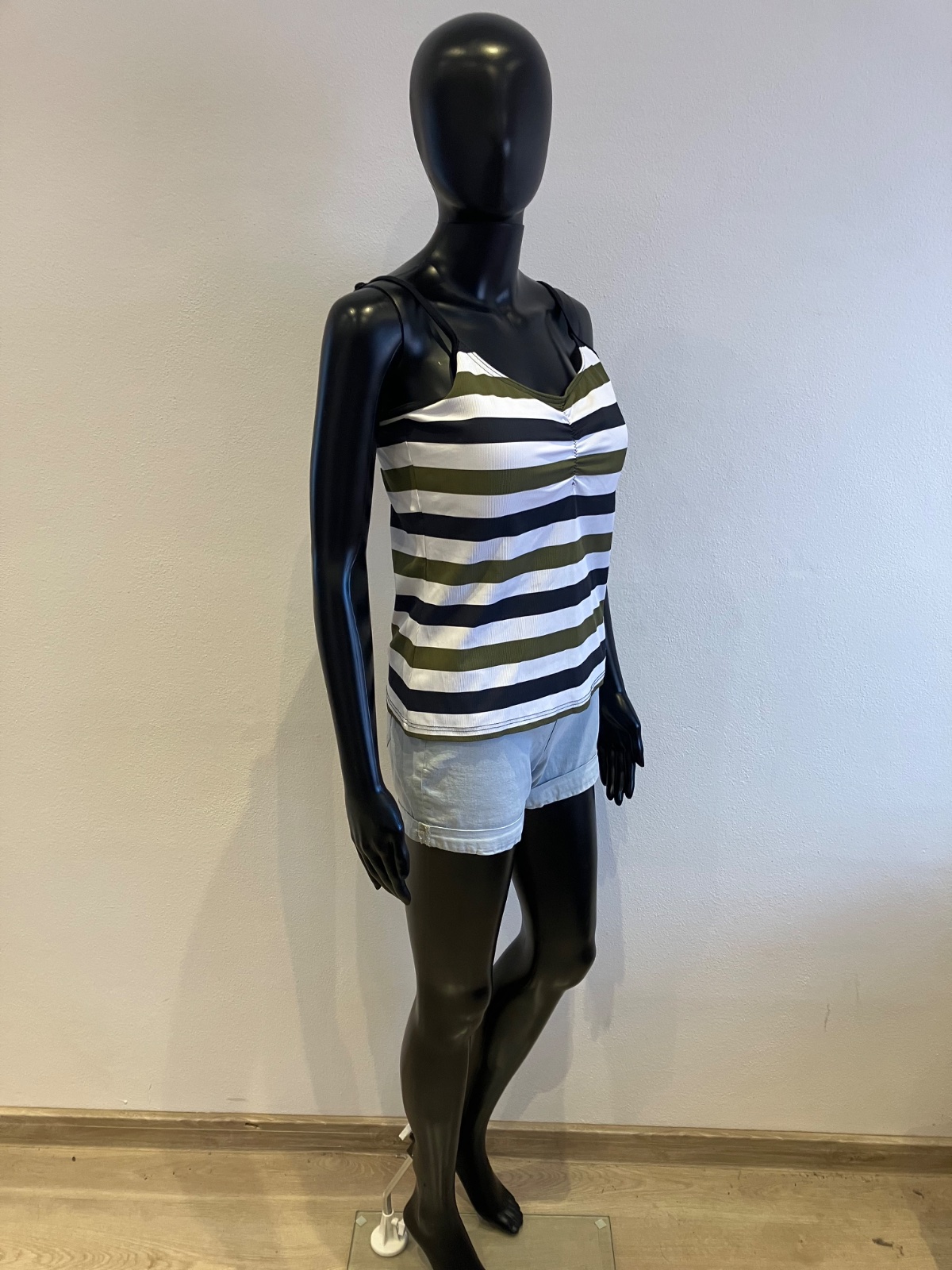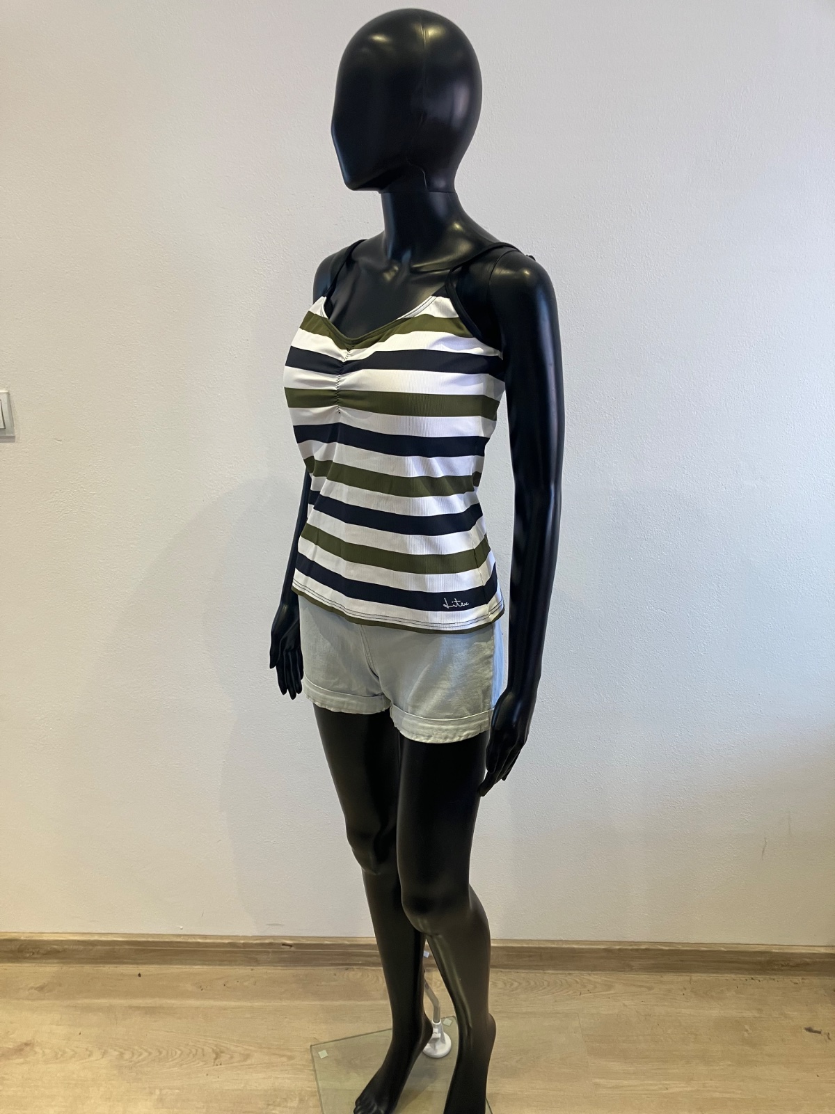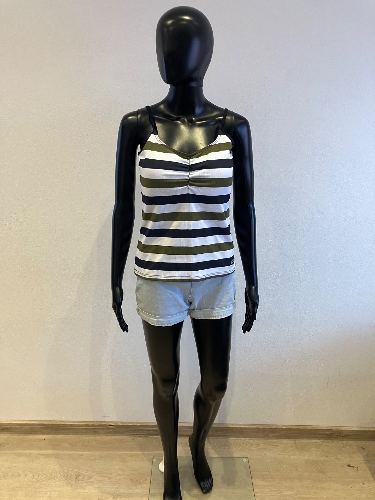 Dámsky top na tenké ramienka, vypchávkami na hrudi, elastický, rebrovaný, nastaviteľné ramienka, farba bielo-čierno-khaki, materiál 85%polyamid 15%elastan.