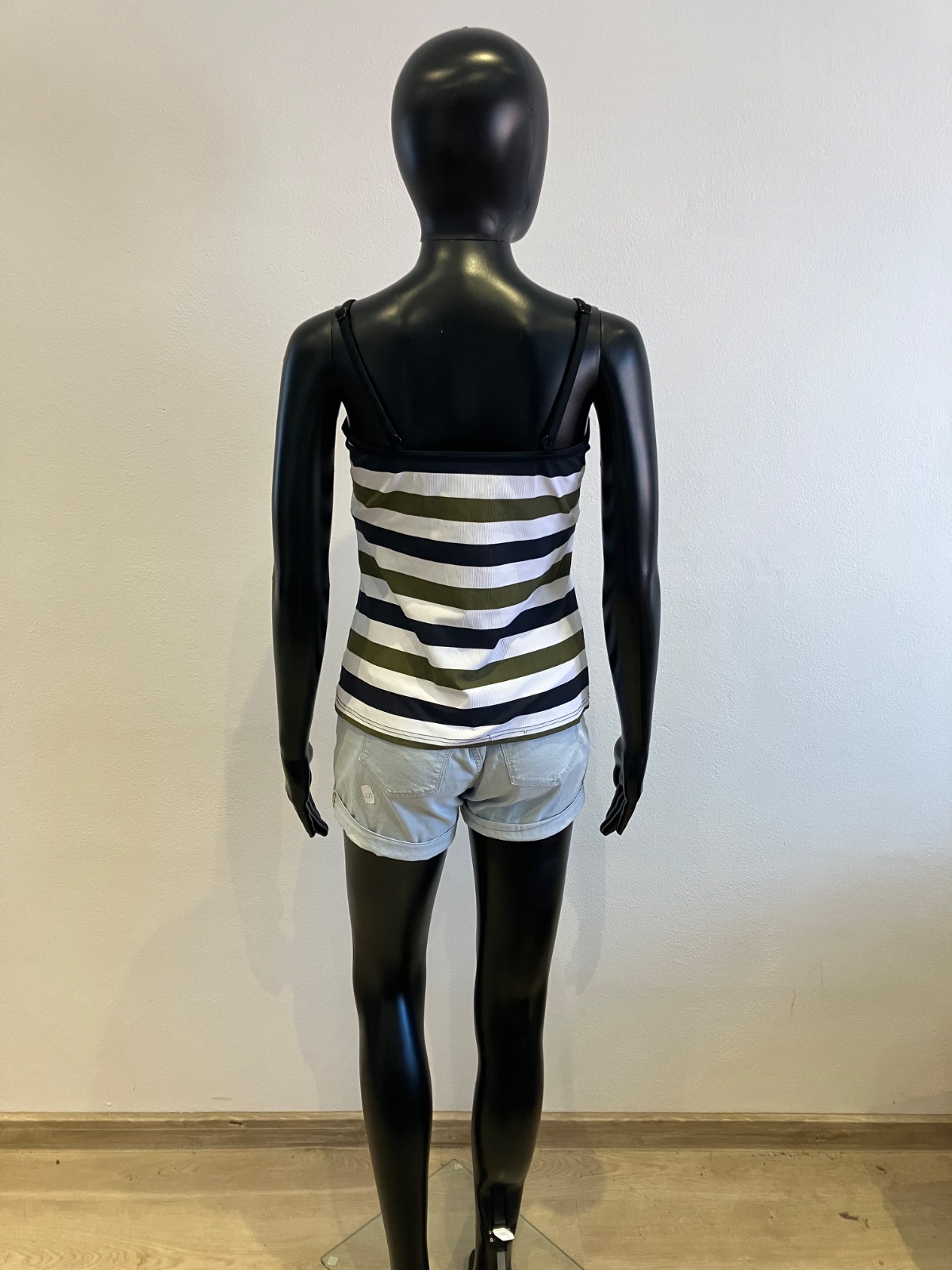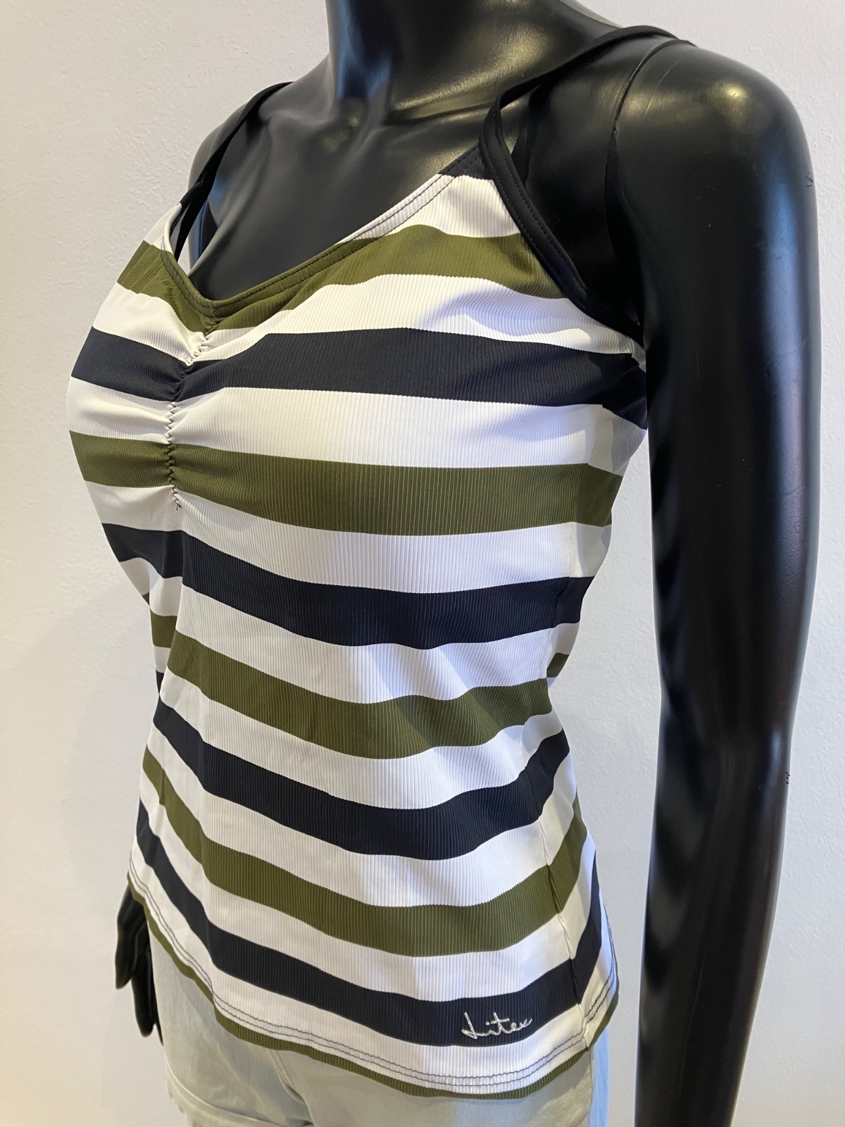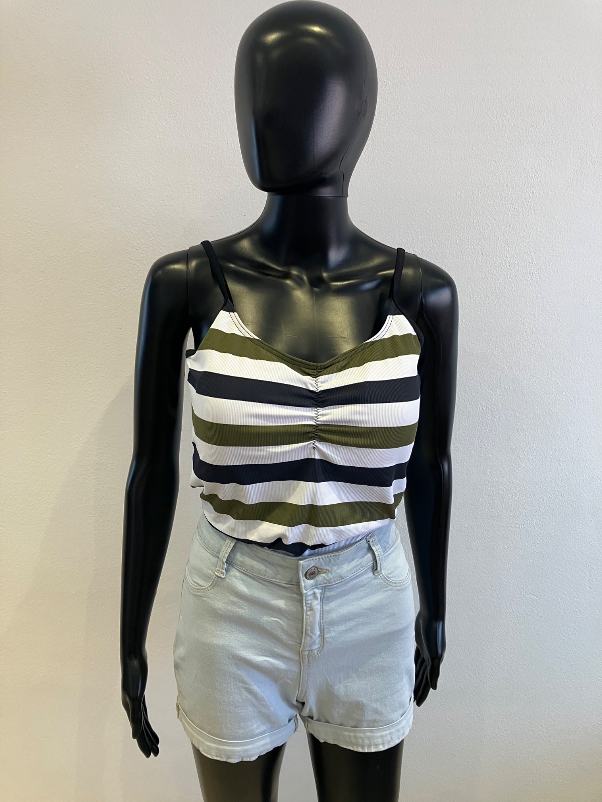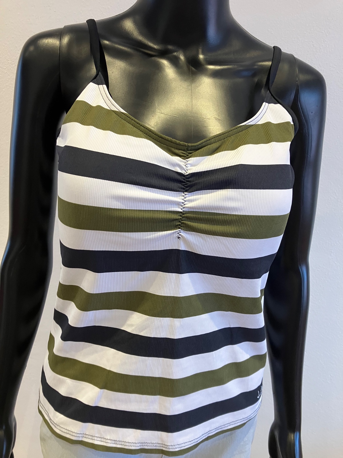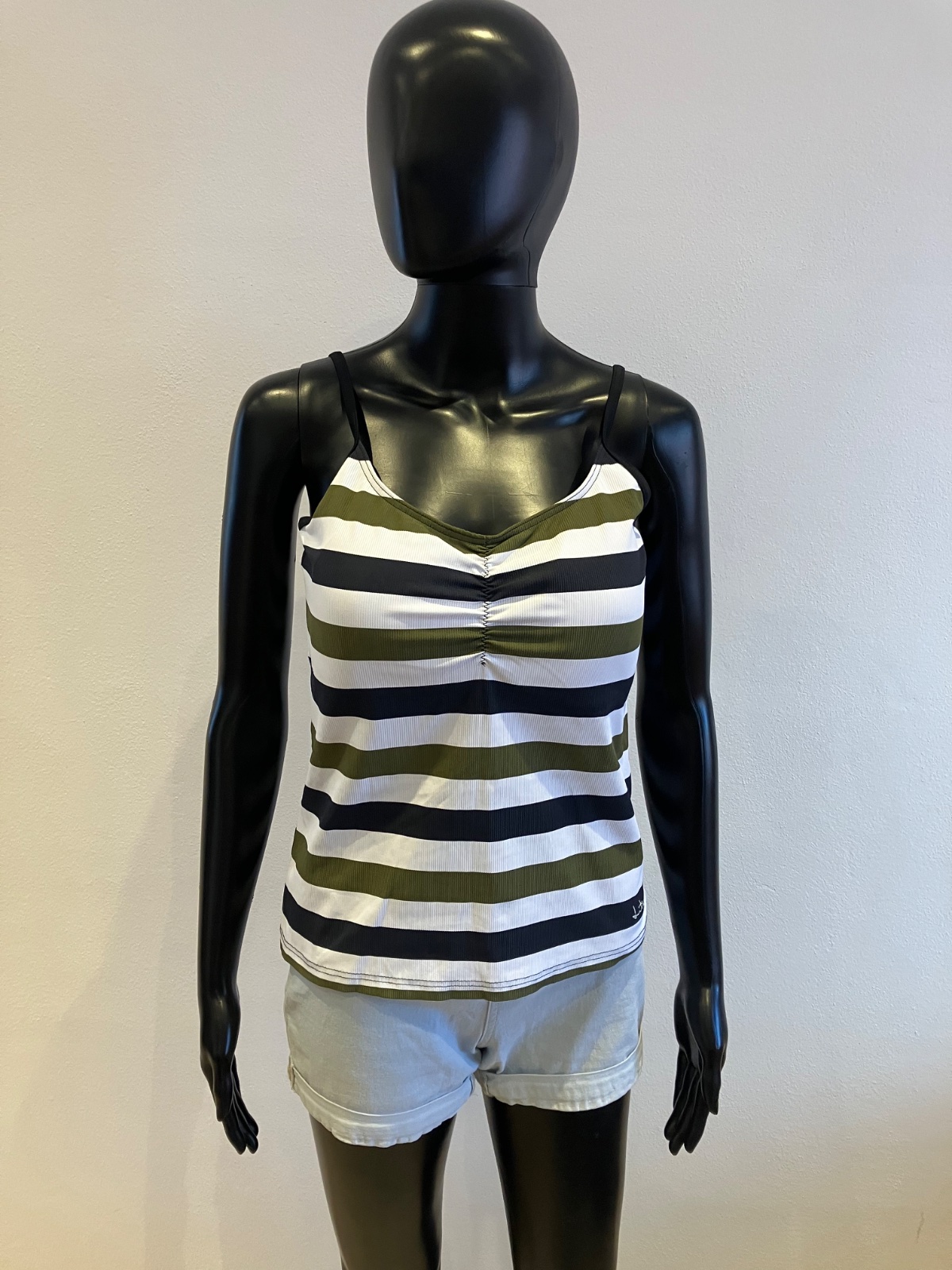 Dámsky top na tenké ramienka, vypchávkami na hrudi, elastický, rebrovaný, nastaviteľné ramienka, farba bielo-čierno-khaki, materiál 85%polyamid 15%elastan.